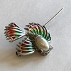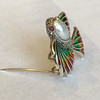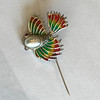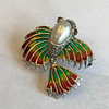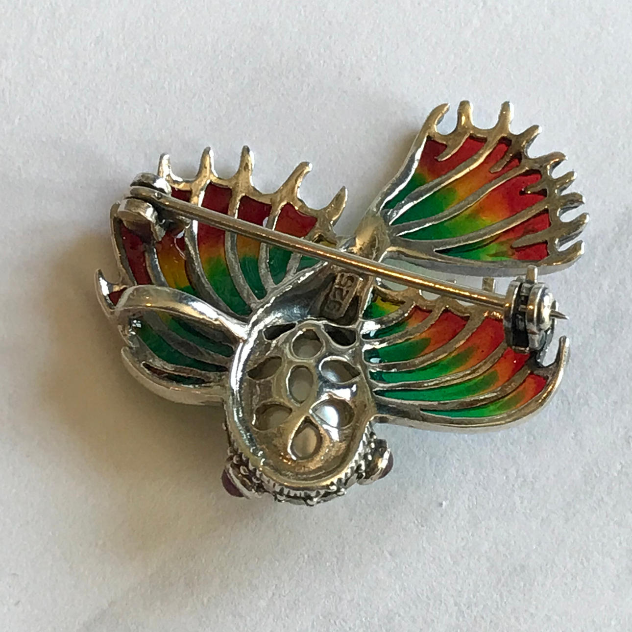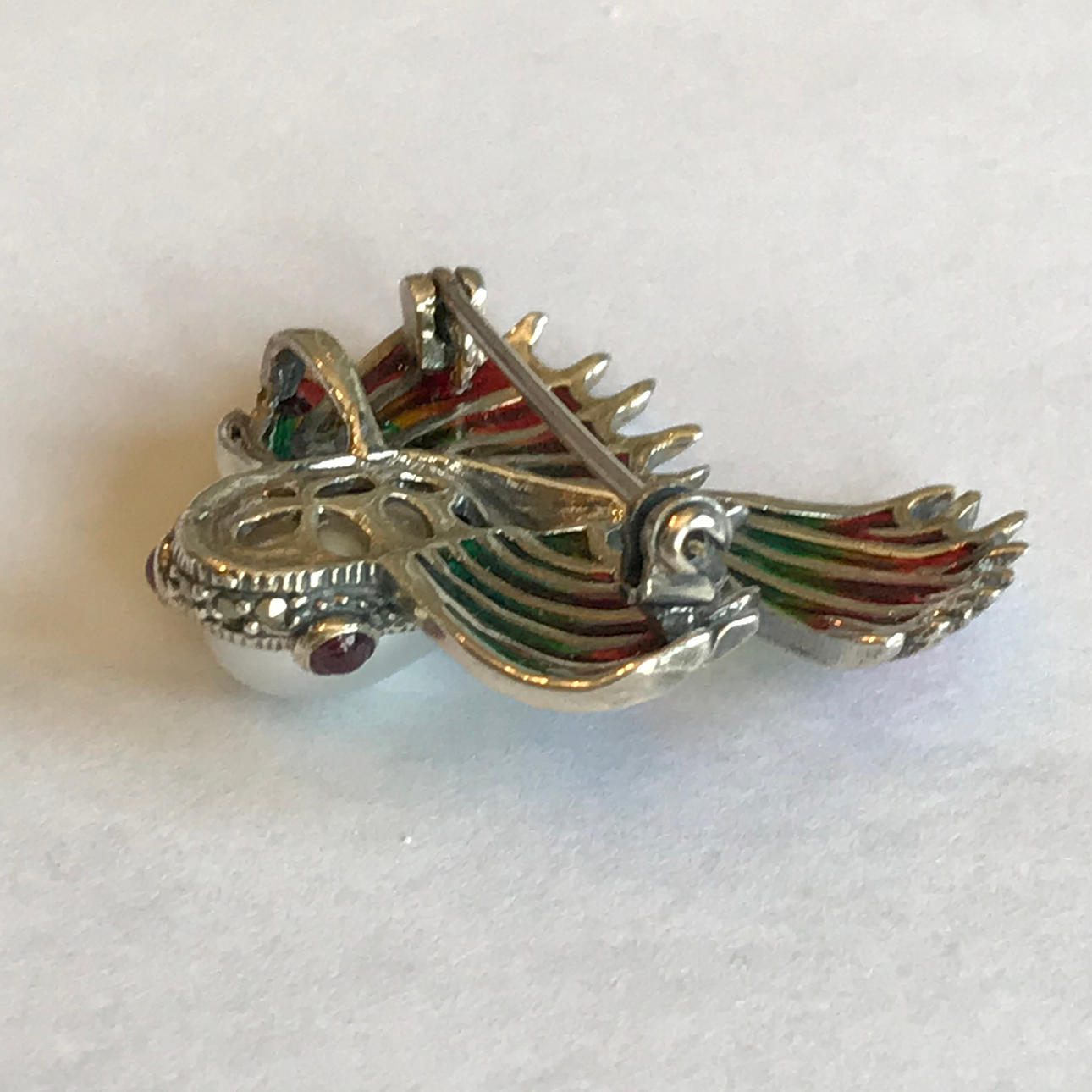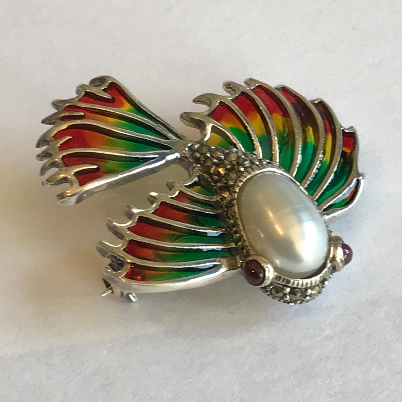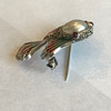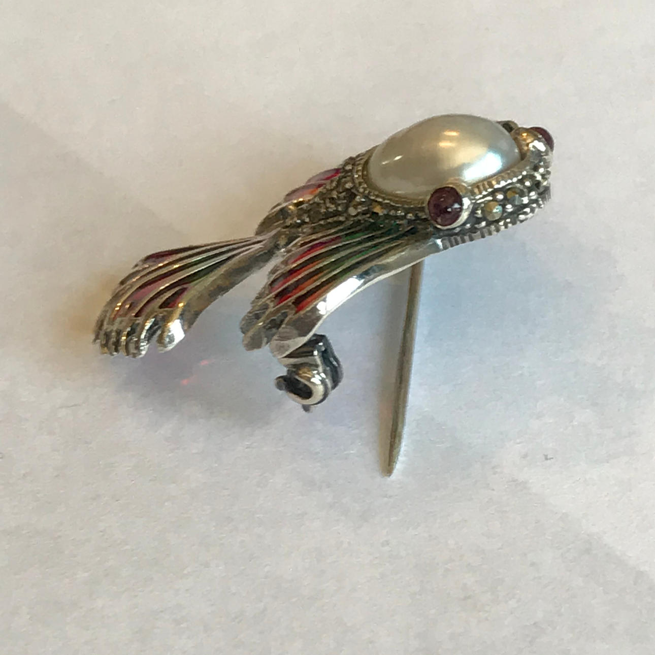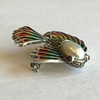 El cuerpo del pez está engastado con piedras de marcasita y las aletas están rellenas de plique a jour en colores rojo, amarillo y verde.