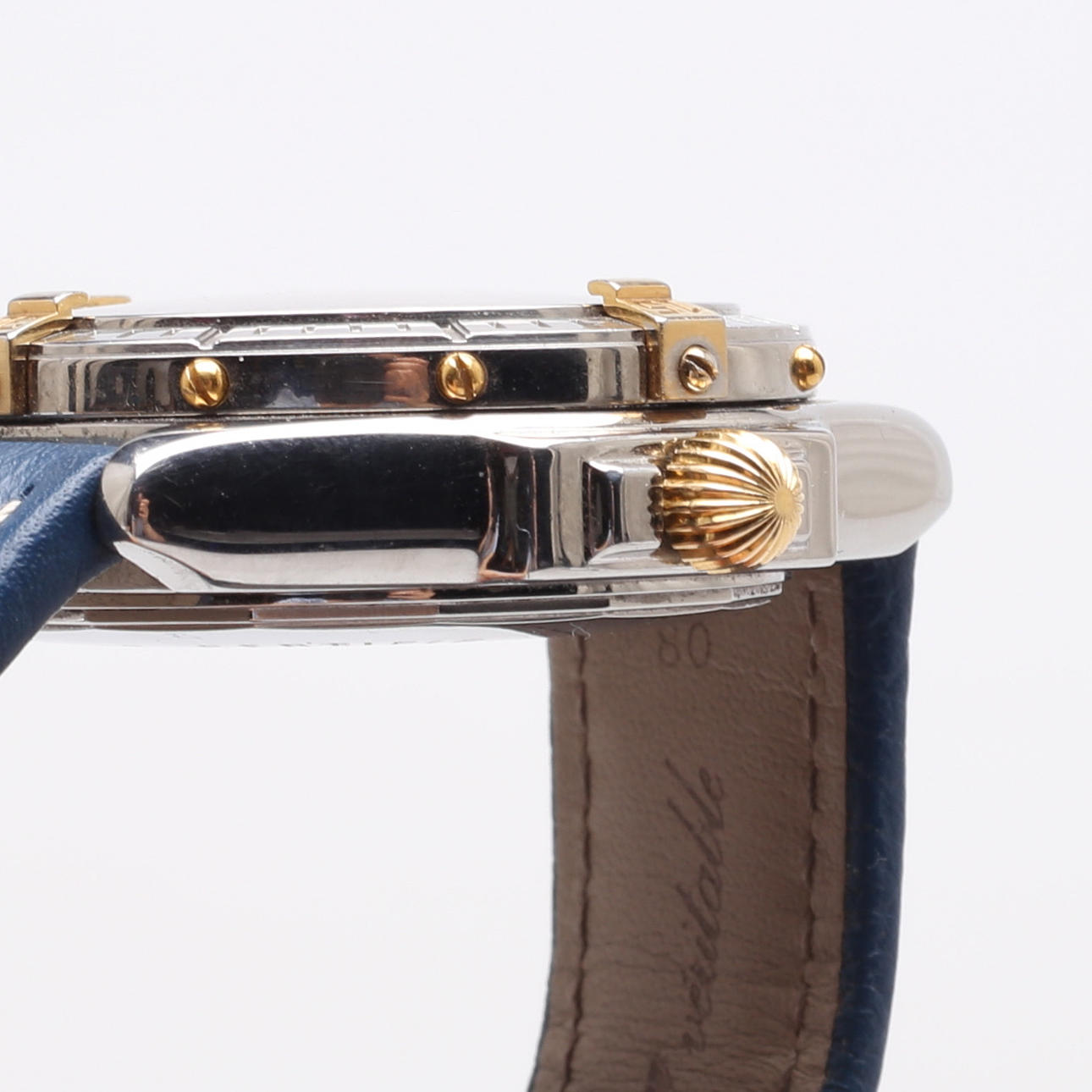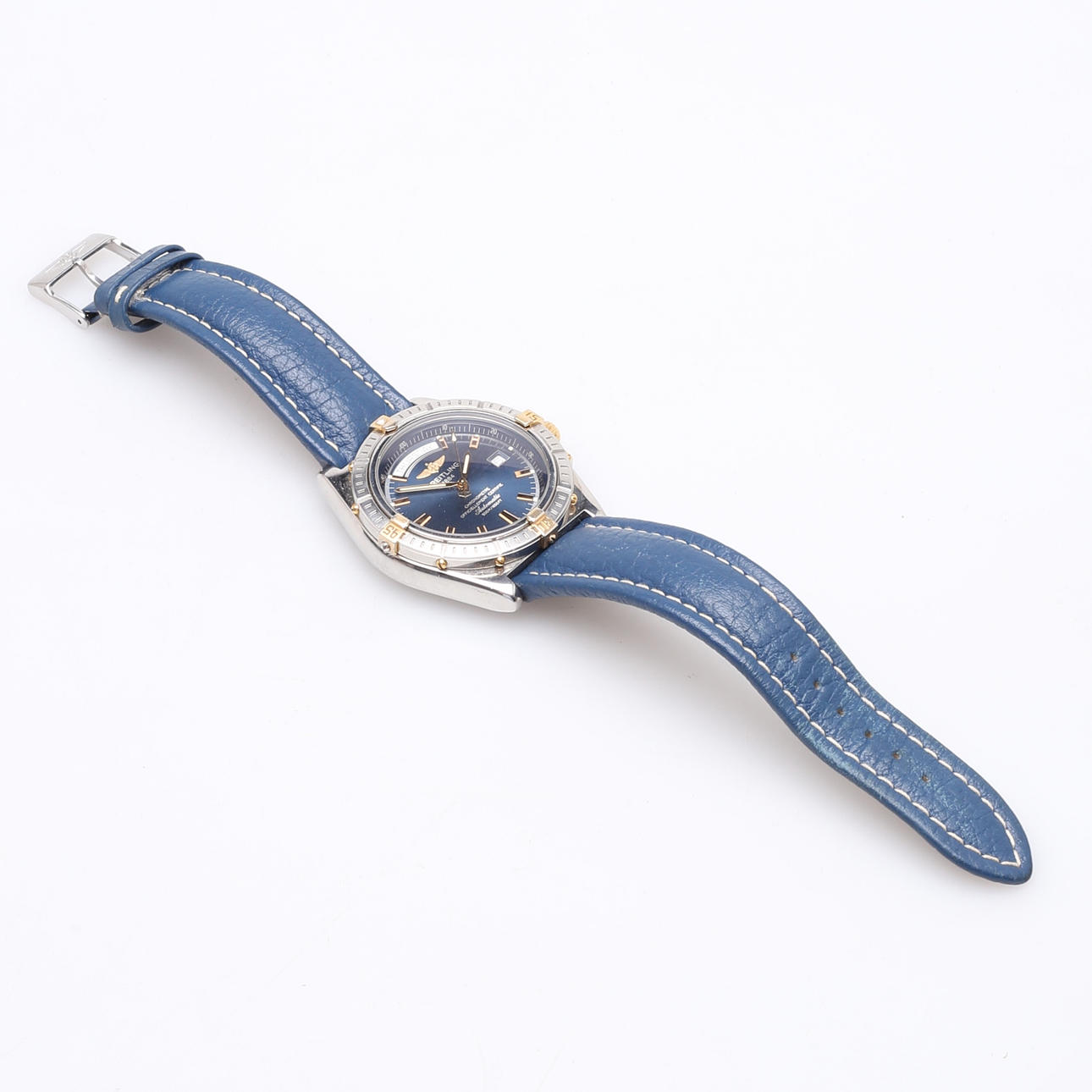 Caja de acero con decoración dorada, esfera azul, aguja de fecha Movimiento automático, Calibre 45 / Base Eta 2834 Diámetro de la caja 43,7 mm Ref A45355 Fabricado en 2004 Certificado de relojero incluido.