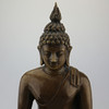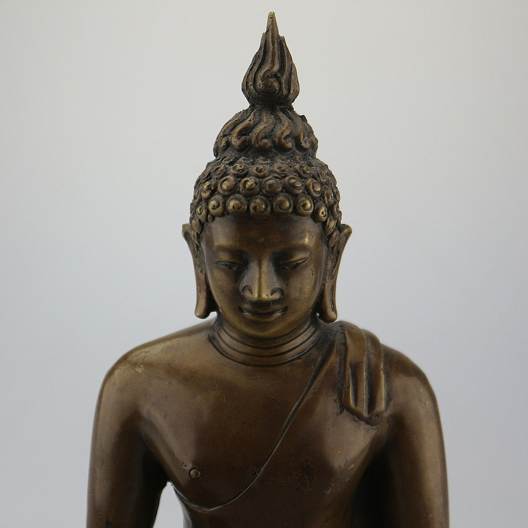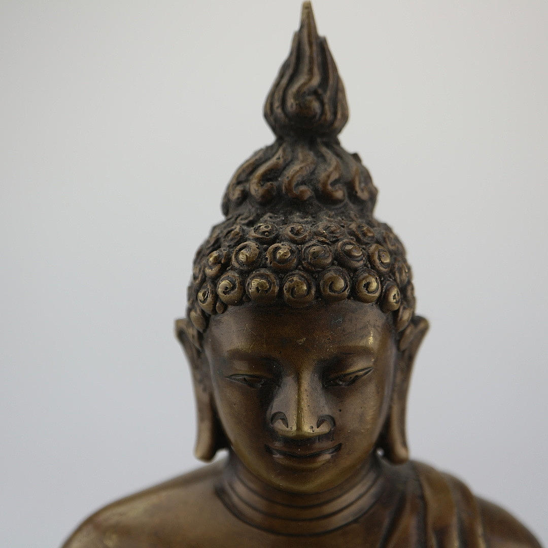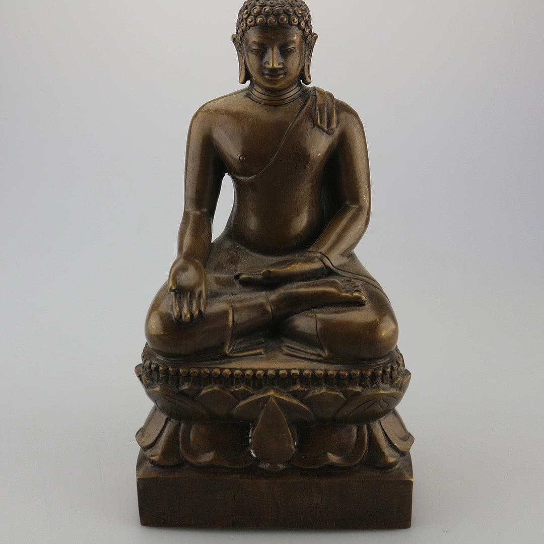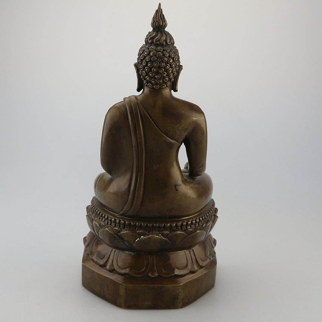 Buda de bronce, altura: 28,5 cm, con gesto de llamar a la tierra, La estatua de Buda de bronce en el asiento de meditación está entronizada sobre un cojín de loto. La túnica ajustada lo envuelve, pero deja su hombro derecho expuesto. La mano de obra de alta calidad se refleja en la postura realista y el fino dibujo de la cara. Tiene las características físicas del Buda: los rizos jorobados, la cresta en la cabeza, los pliegues en el cuello y los lóbulos de las orejas largos, mostrando el gesto de tocar la tierra (Bhumisparsa Mudra). El brazo derecho está por encima de la rodilla y la palma hacia adentro mientras que la mano izquierda está sobre el regazo con la palma abierta. Con eso invoca a la tierra y se pierde en sus pensamientos. La importante estatua de bronce de Buda también es un equipo de alta calidad para cualquier entorno de vida.