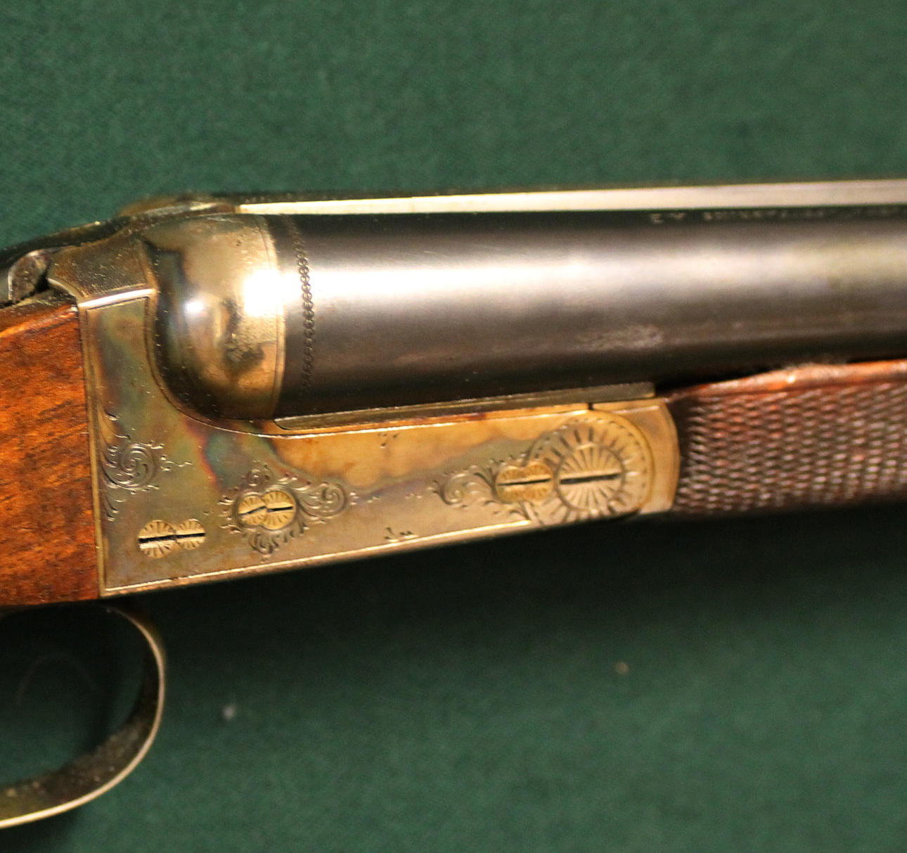 Número de serie: 213124 Longitud del cañón: 70 cm Caja grabada y templada, cañón pavonado, extractor, mecha automática, cantonera de baquelita, taladrada full/full.