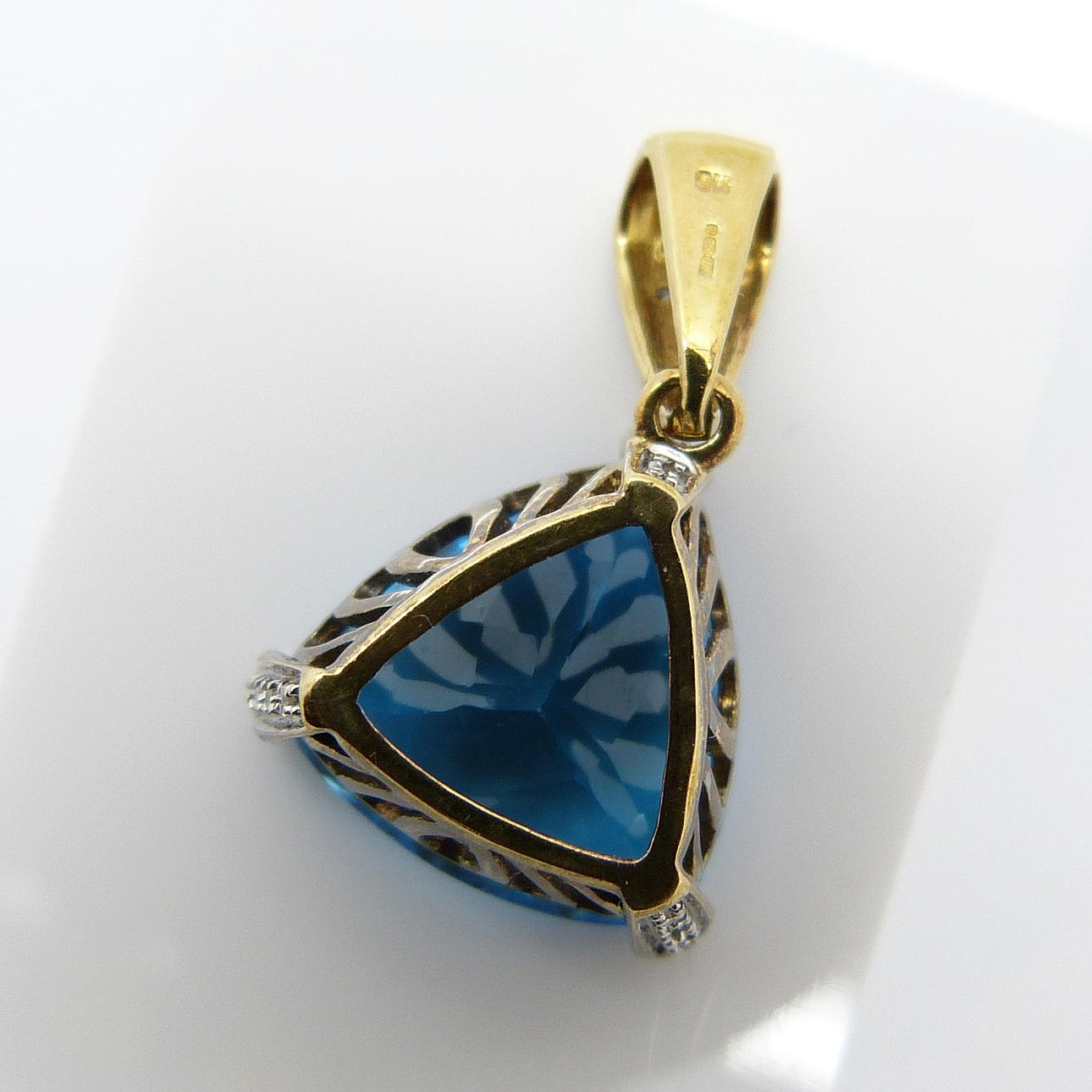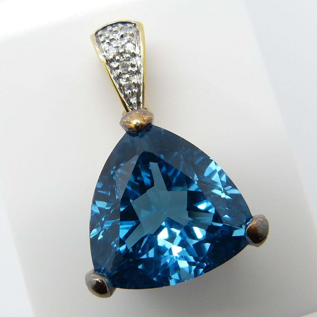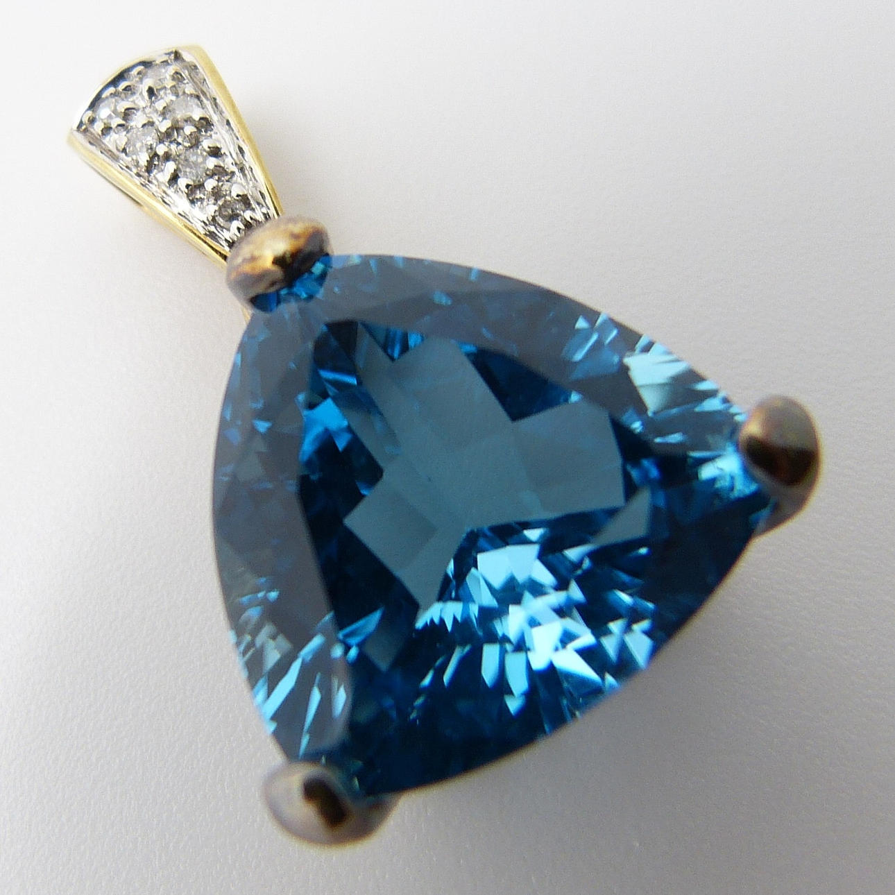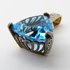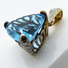 Engastado en este colgante hay una gran piedra preciosa de topacio azul de un trillón de tallas con un peso en quilates de 10,00 quilates, aprox.
