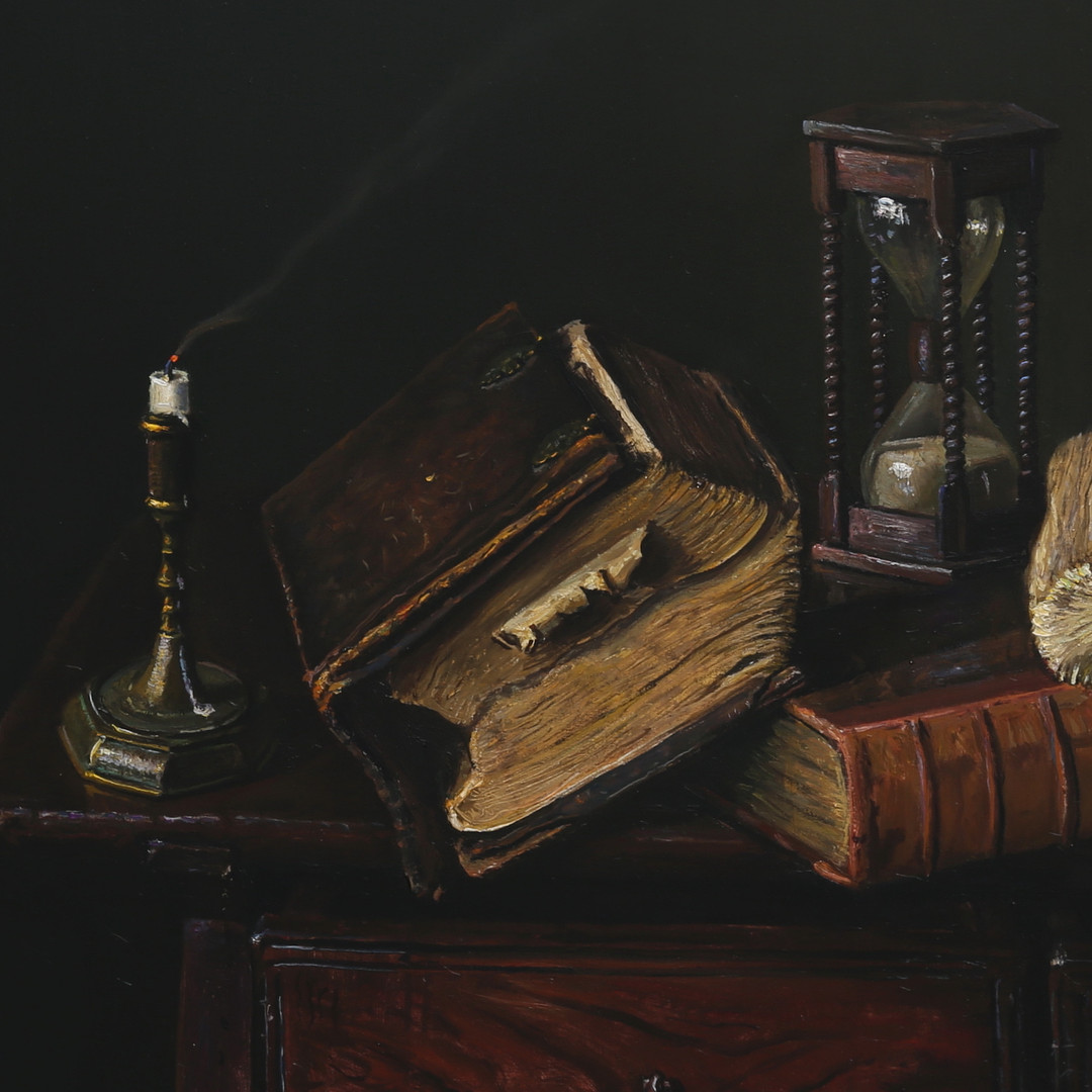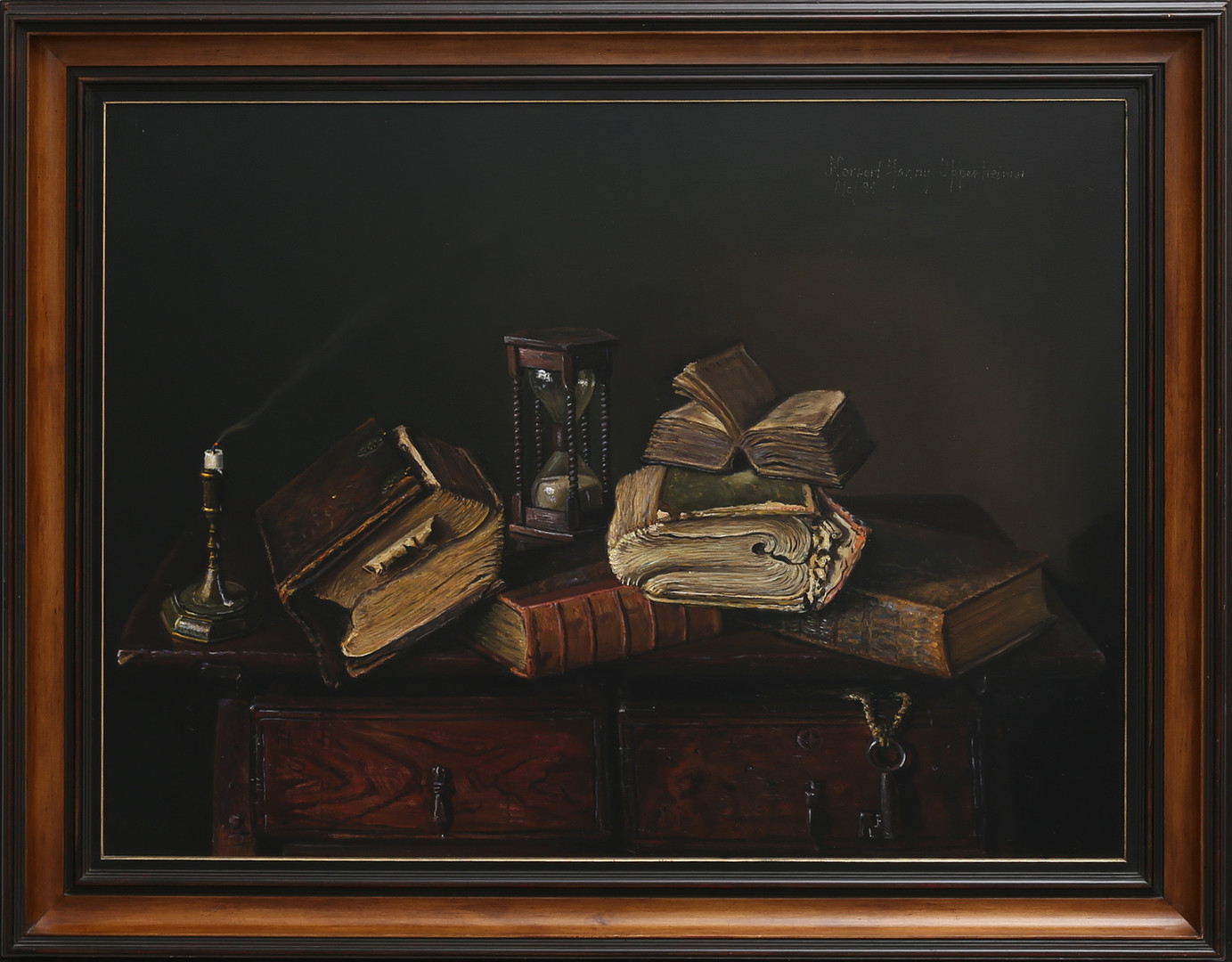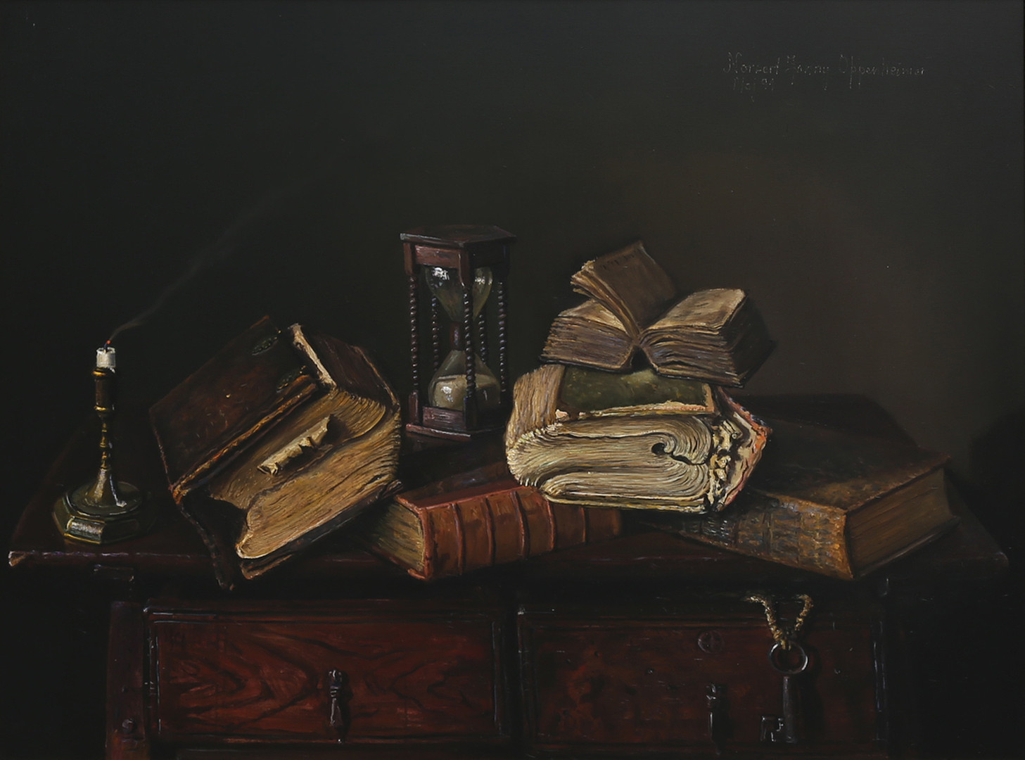 1394749. JOHNNY OPPENHEIMER. BODEGÓN CON LIBROS Y RELOJ DE ARENA.