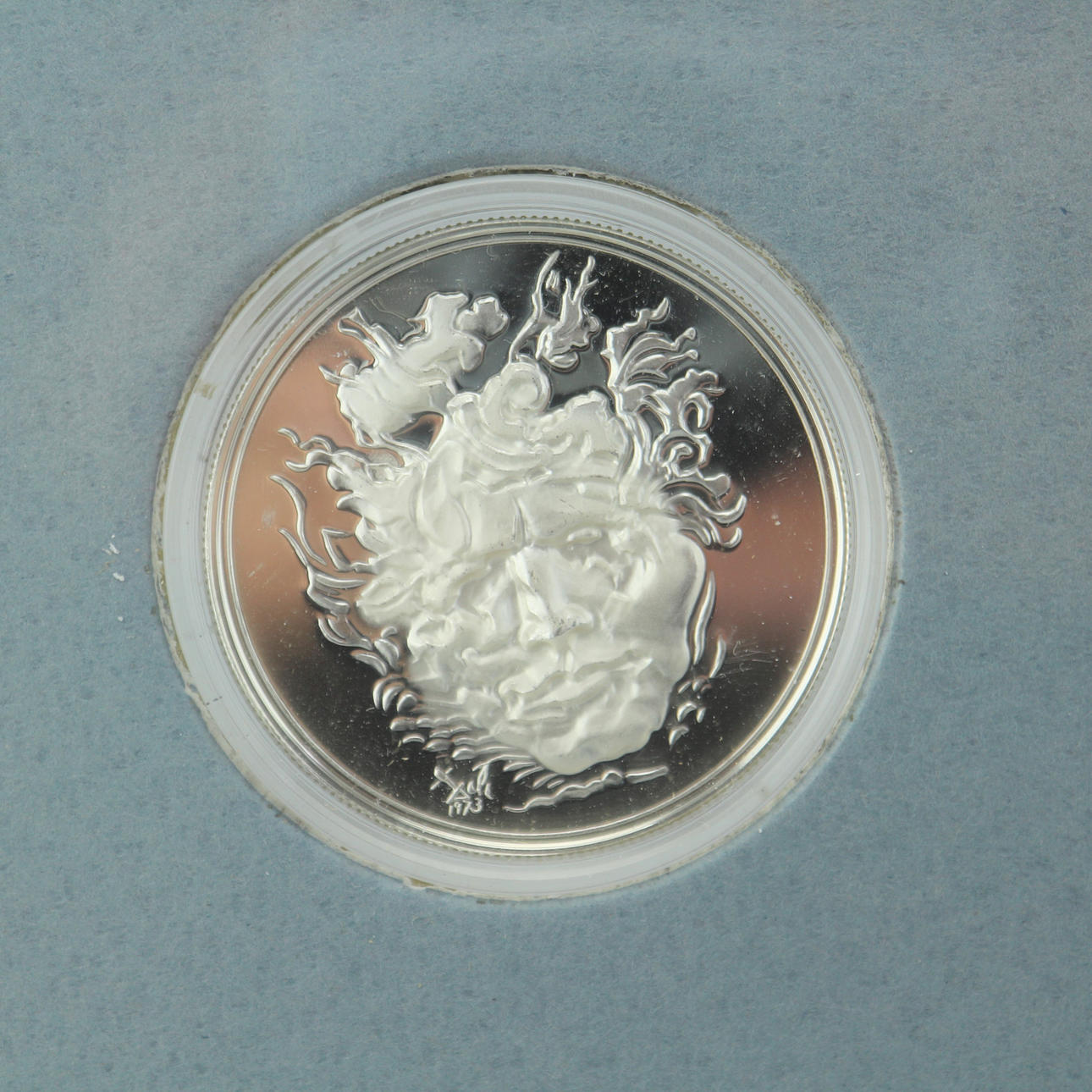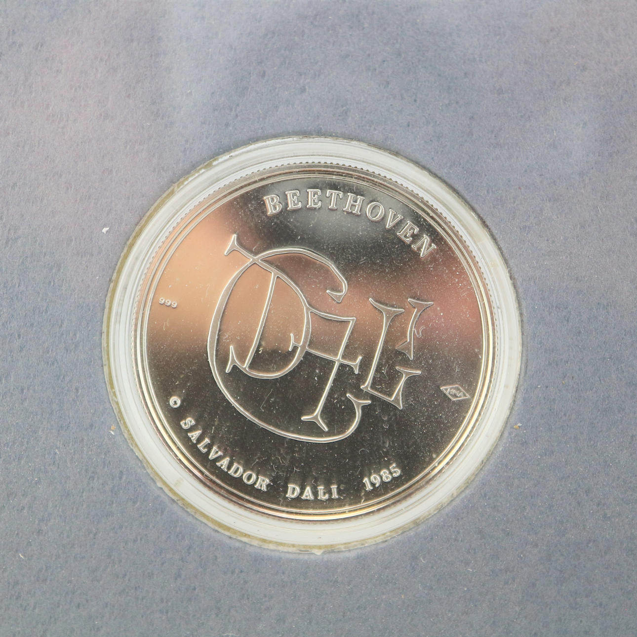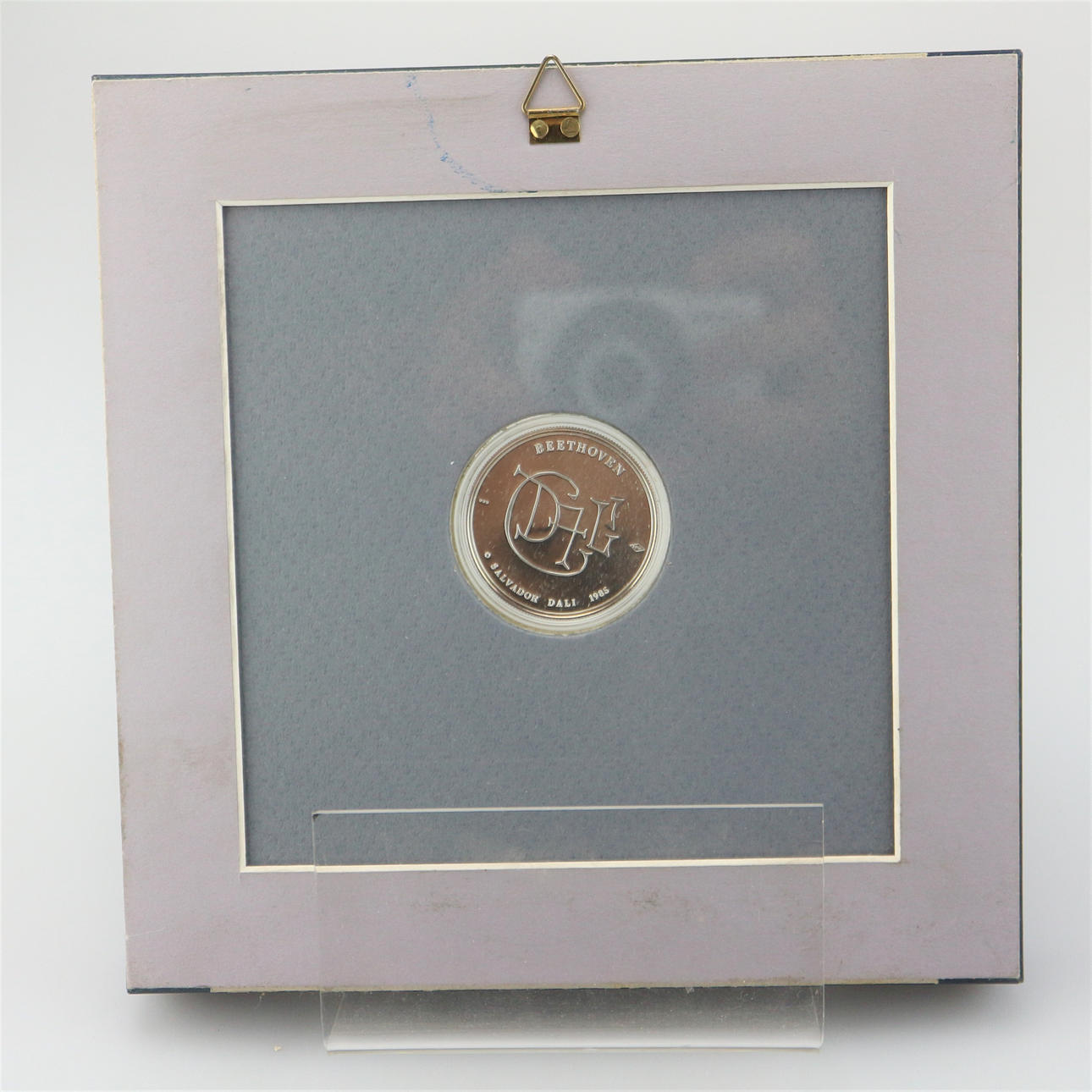 Medalla Salvador Dalí Beethoven 1985, 3,8 cm Ø, plata fina 999, enmarcada detrás de un cristal, medidas del marco 19 x 19 cm.