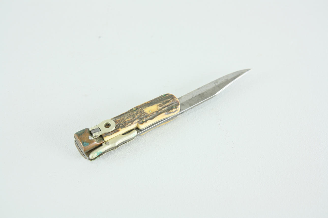 Plegable, Funda incluida. La longitud del cuchillo es de 32 cm, la hoja de aproximadamente 20 cm.