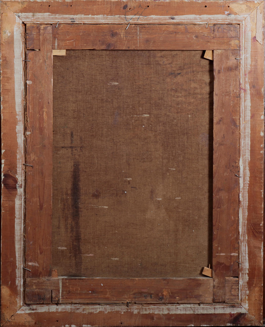 Repintes y reintegraciones en la capa pictórica. Marco en madera dorada con desperfectos.