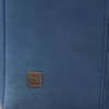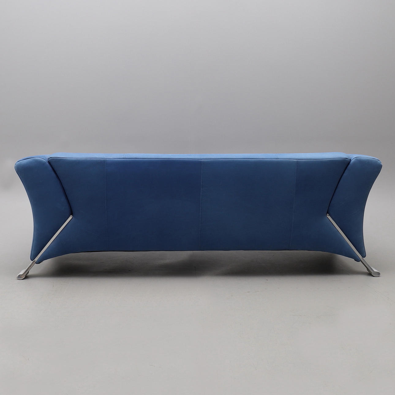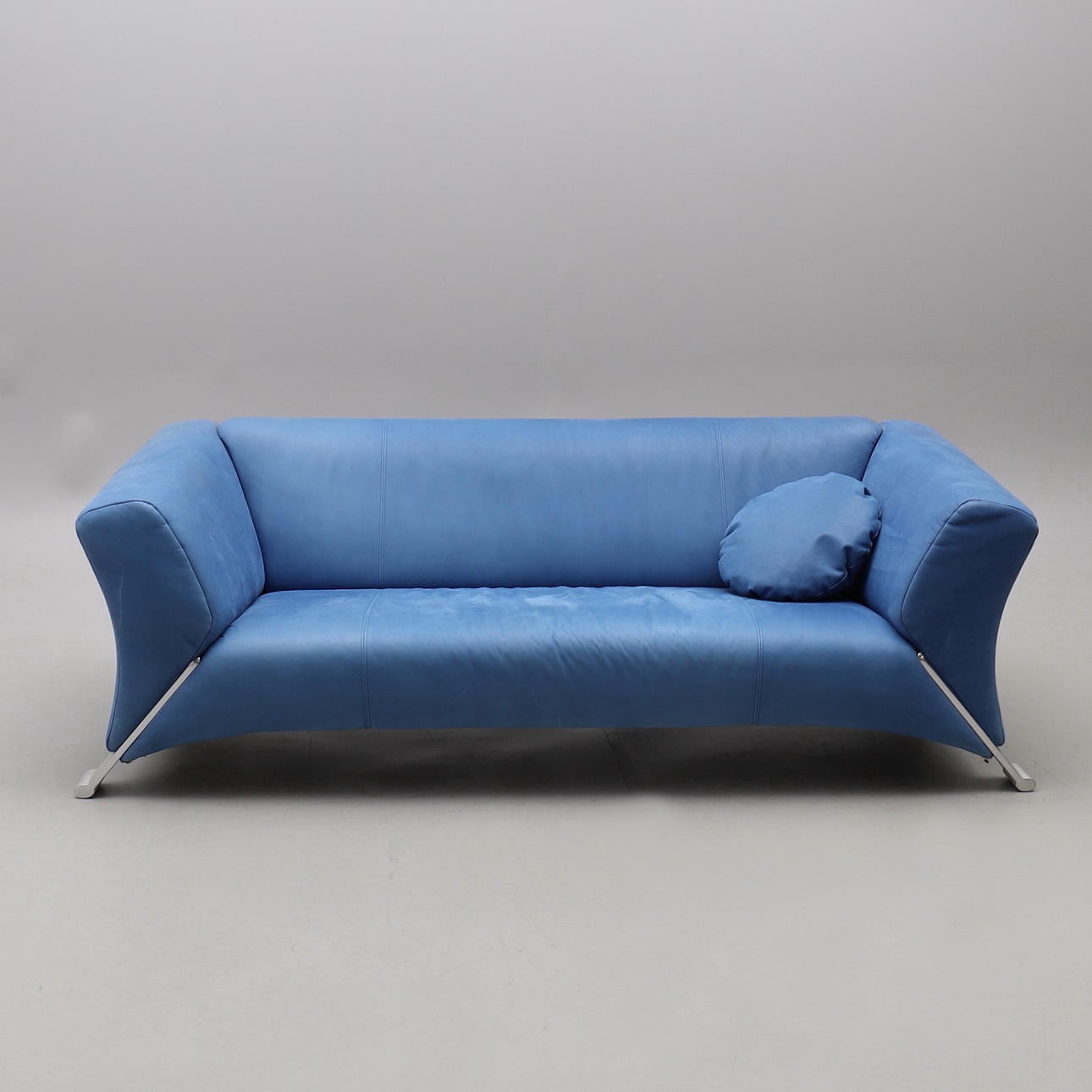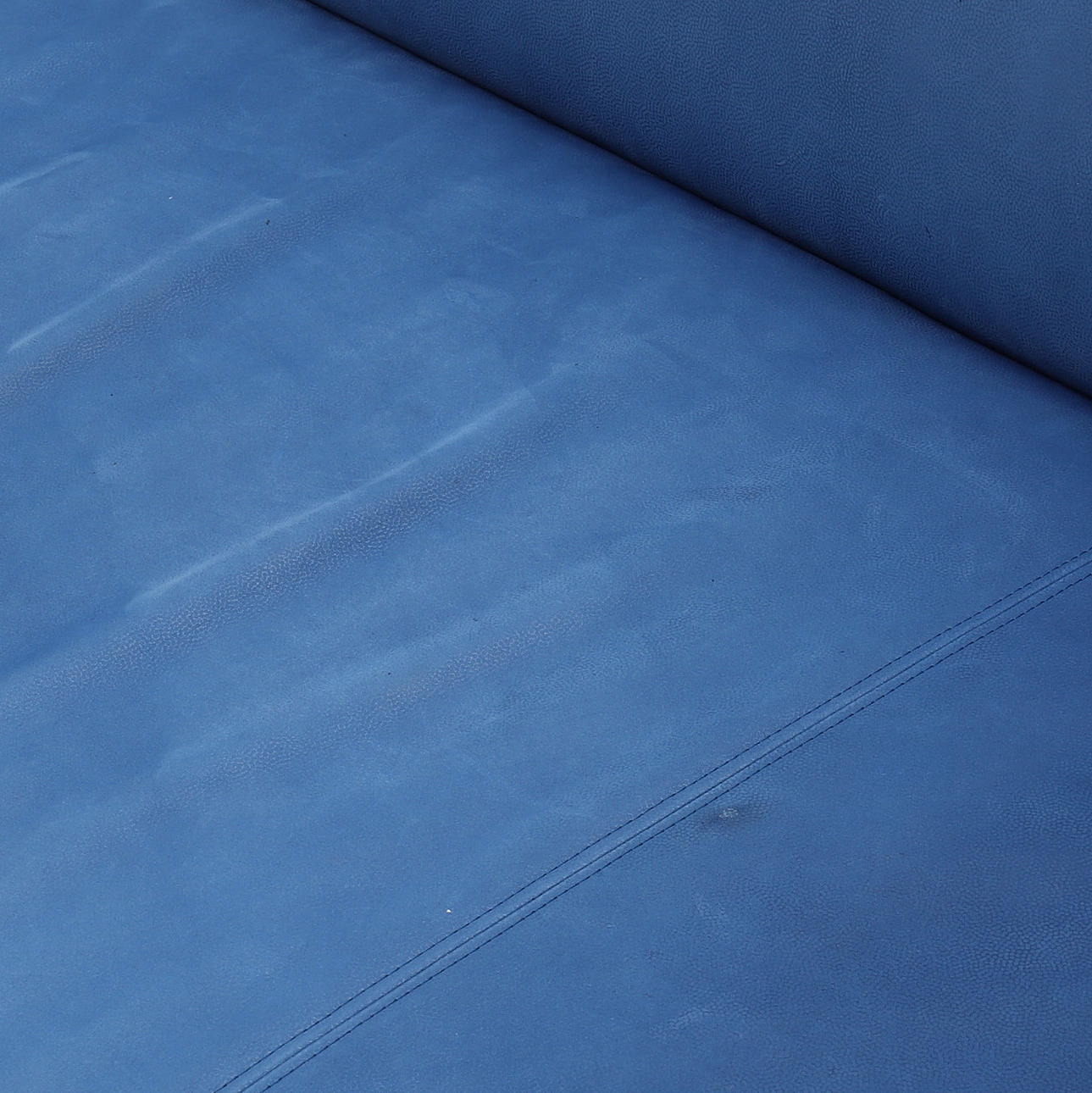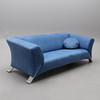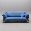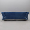 Vestido en nubuck azul con patas acampanadas de metal, cojín suelto incluido. Largo aproximado 200, profundidad 87 y altura trasera 70 cm.