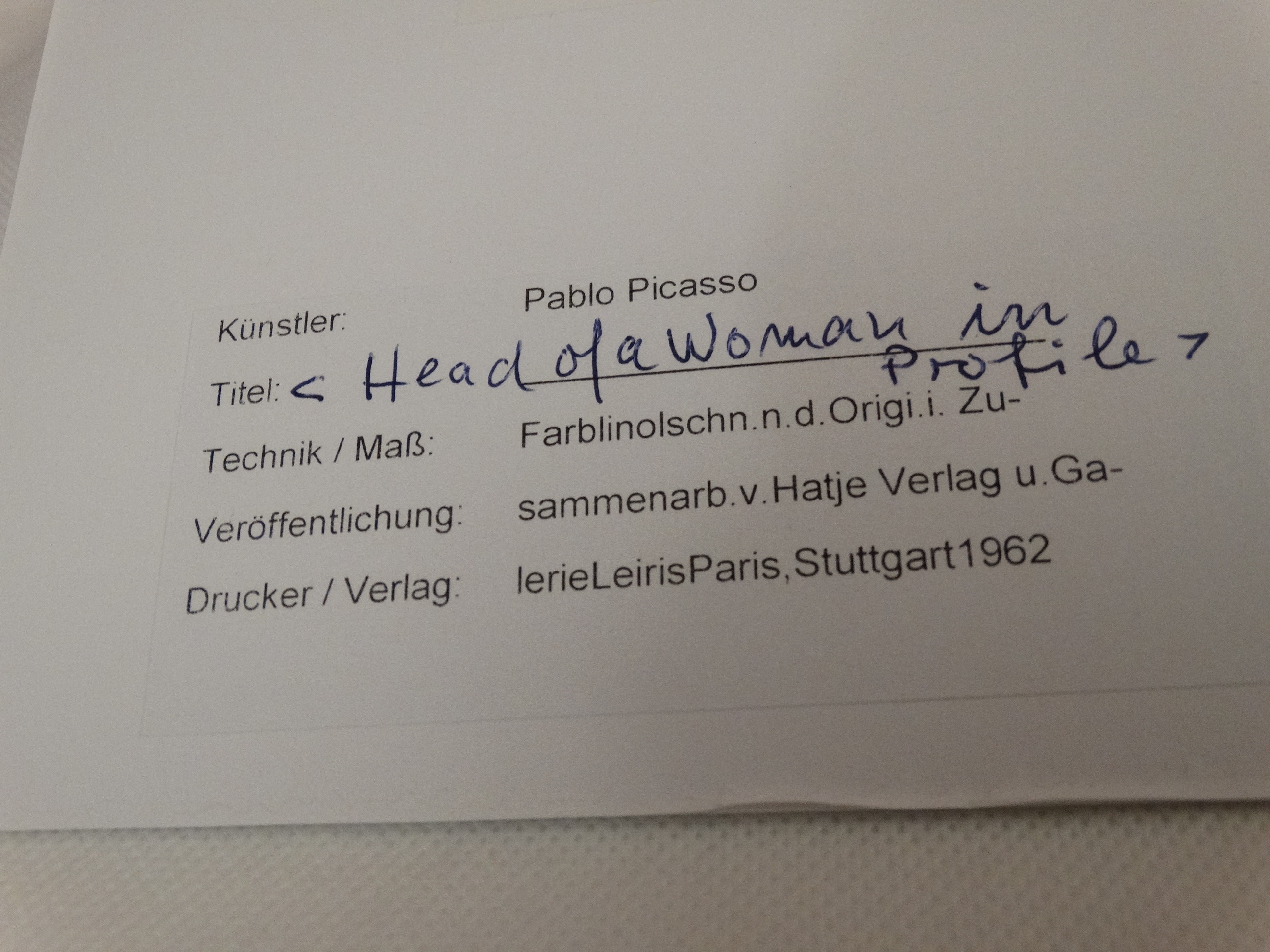 1422276. PABLO PICASSO. Perfil, linóleo, 1962.