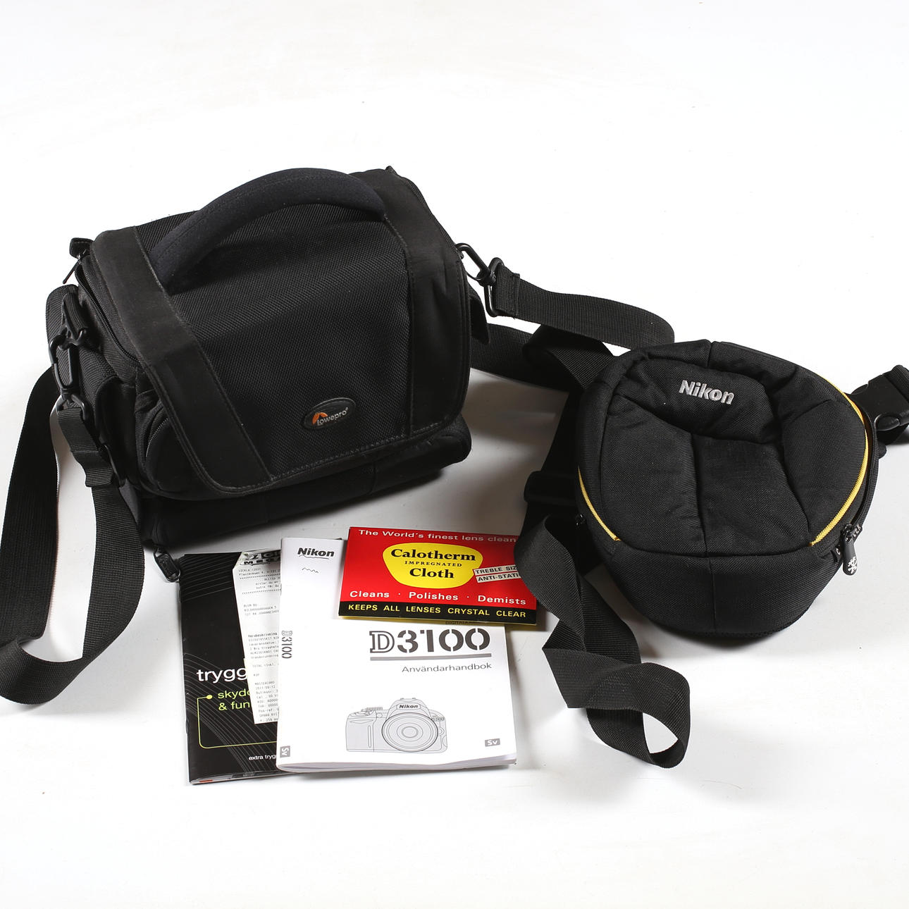 Incluye 2 bolsas para cámara, Nikon Crumpler y Lowepro con accesorios como manual, cargador de batería y batería extra.