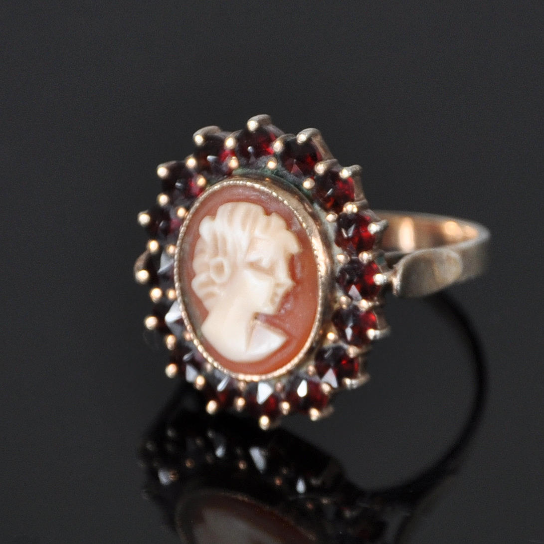 COLLAR Y ANILLO Camafeo Plata dorada con granates.