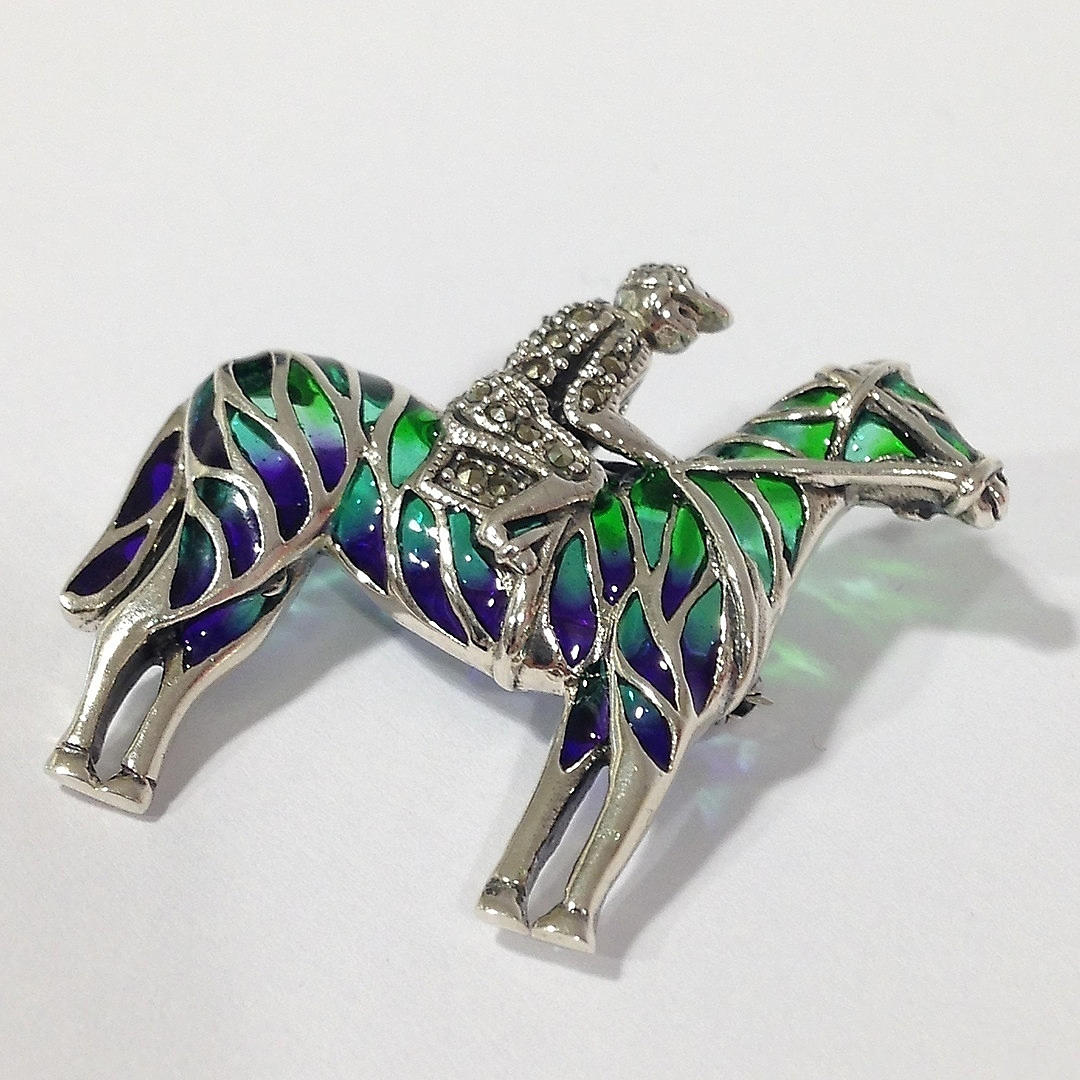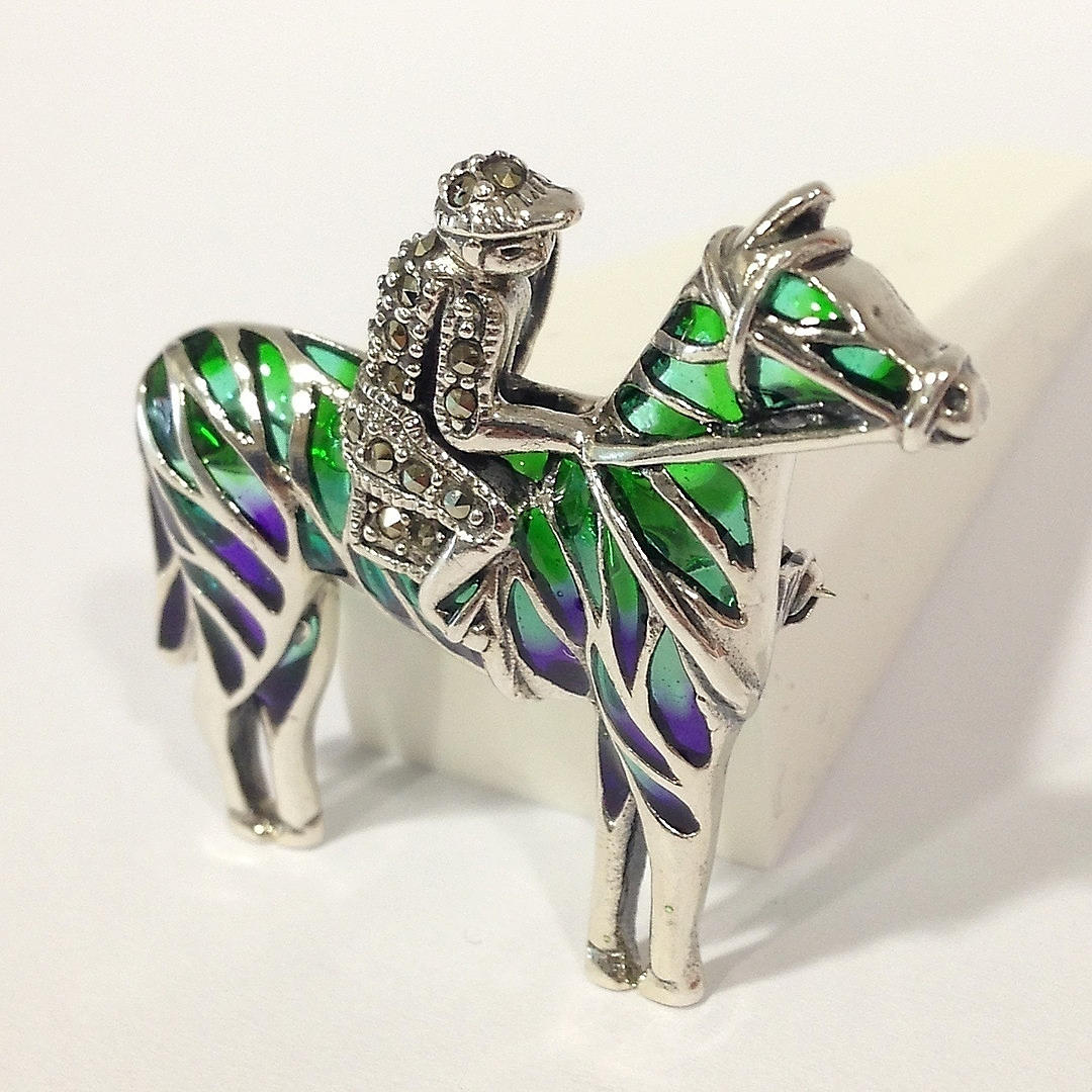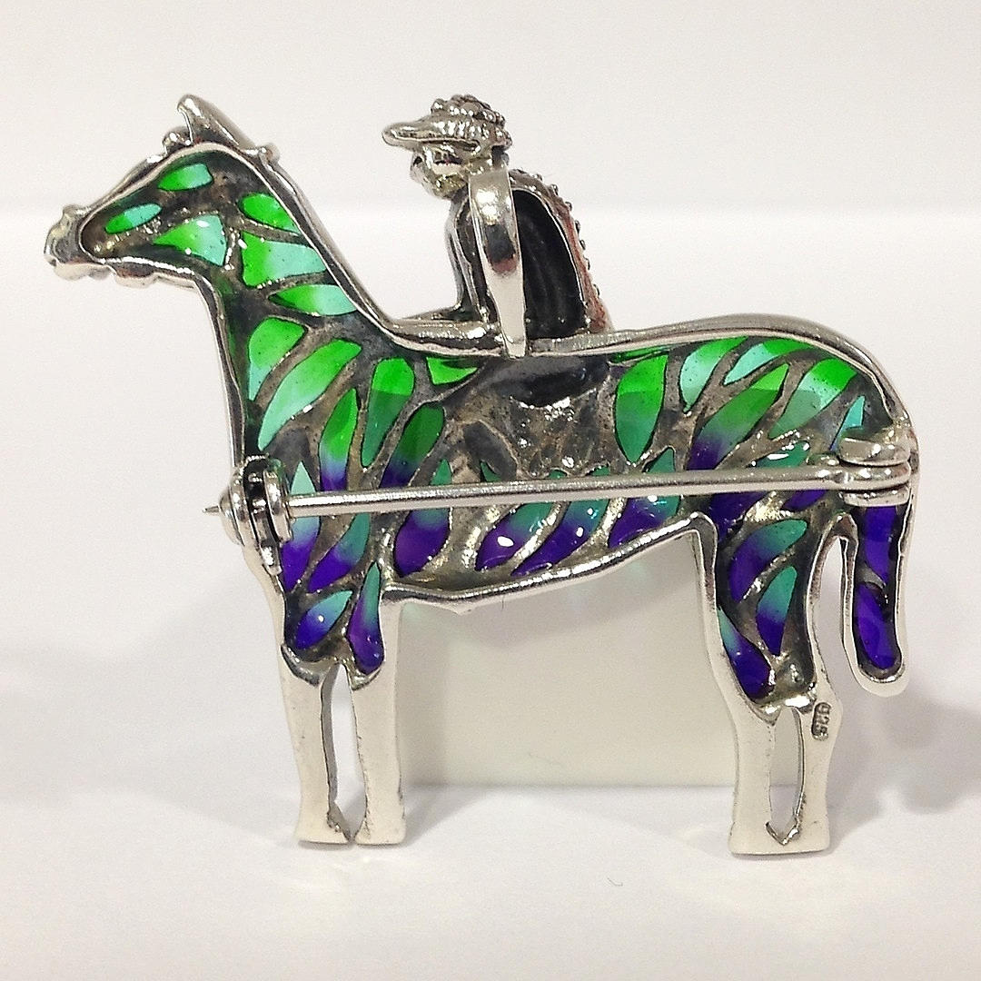 Broche y colgante estilo vintage combinado caballo y jockey en plata (estampado "925").