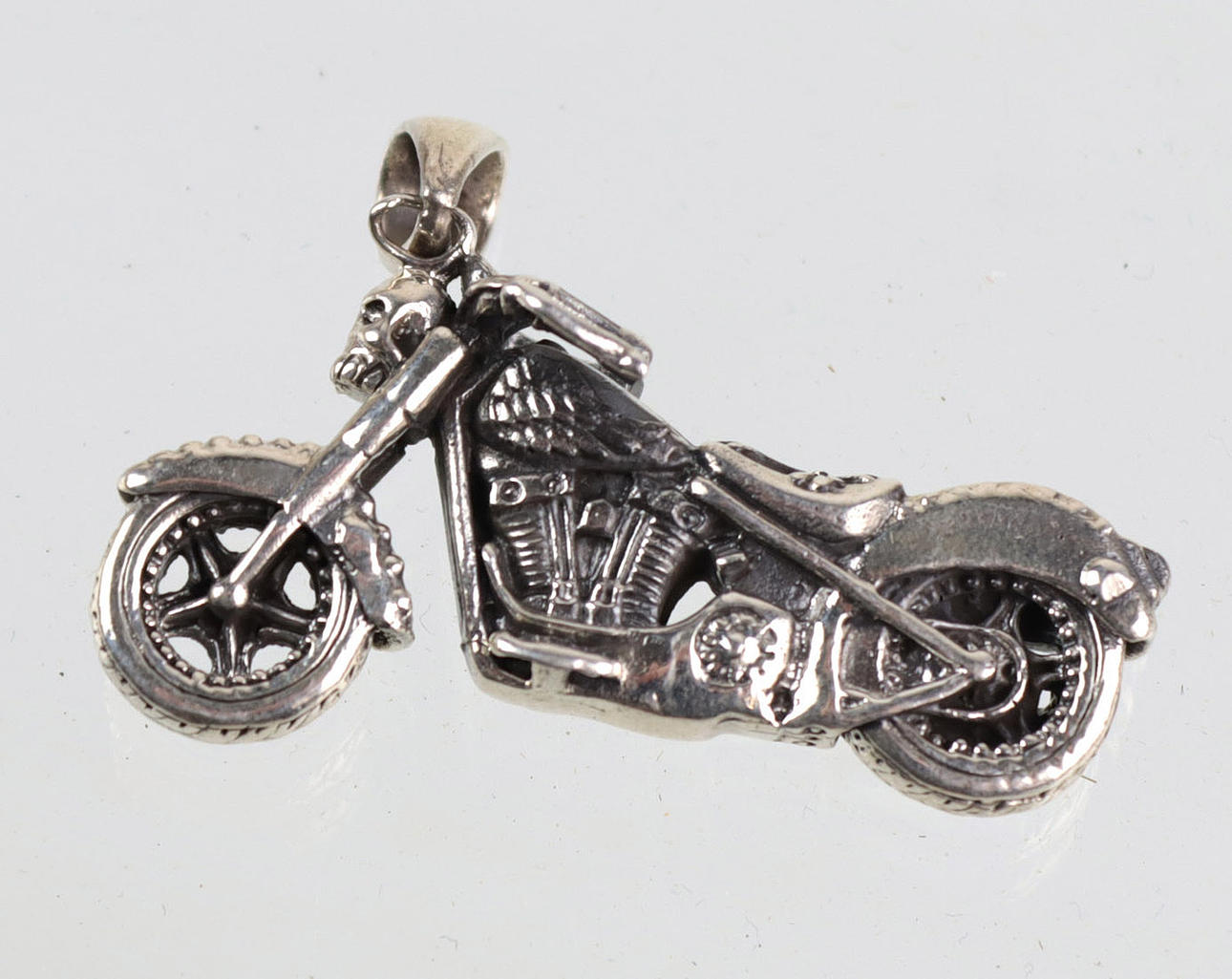 Colgante realizado en plata 925, también punzonado, en forma de moto, largo 32 mm, ancho 46 mm, peso 22,7 gramos.