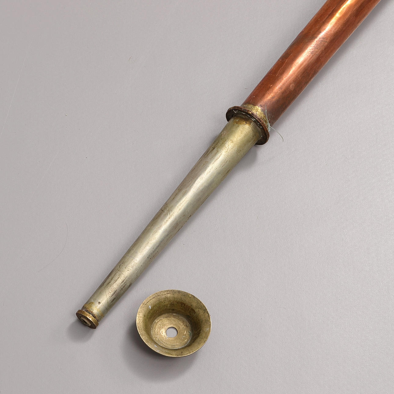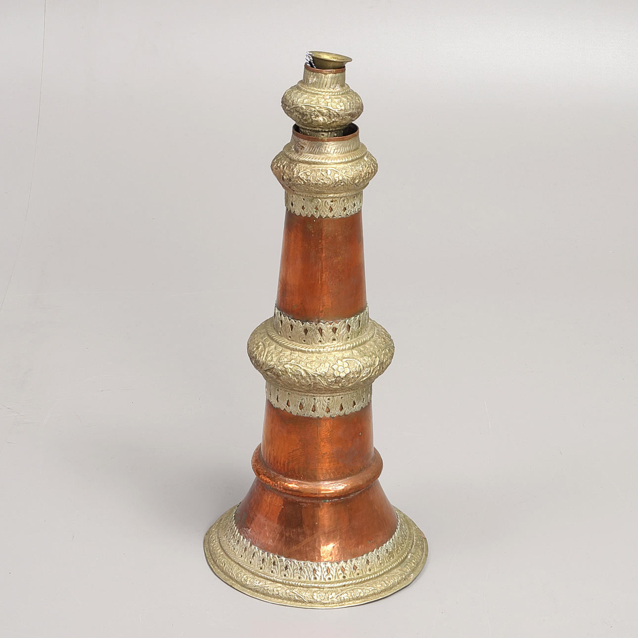 cobre y latón hincados y punzonados, altura 167 cm.