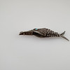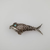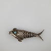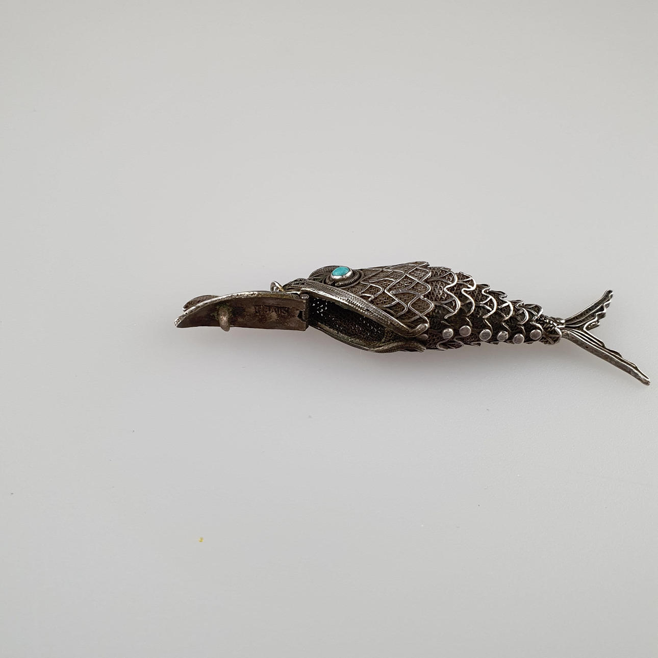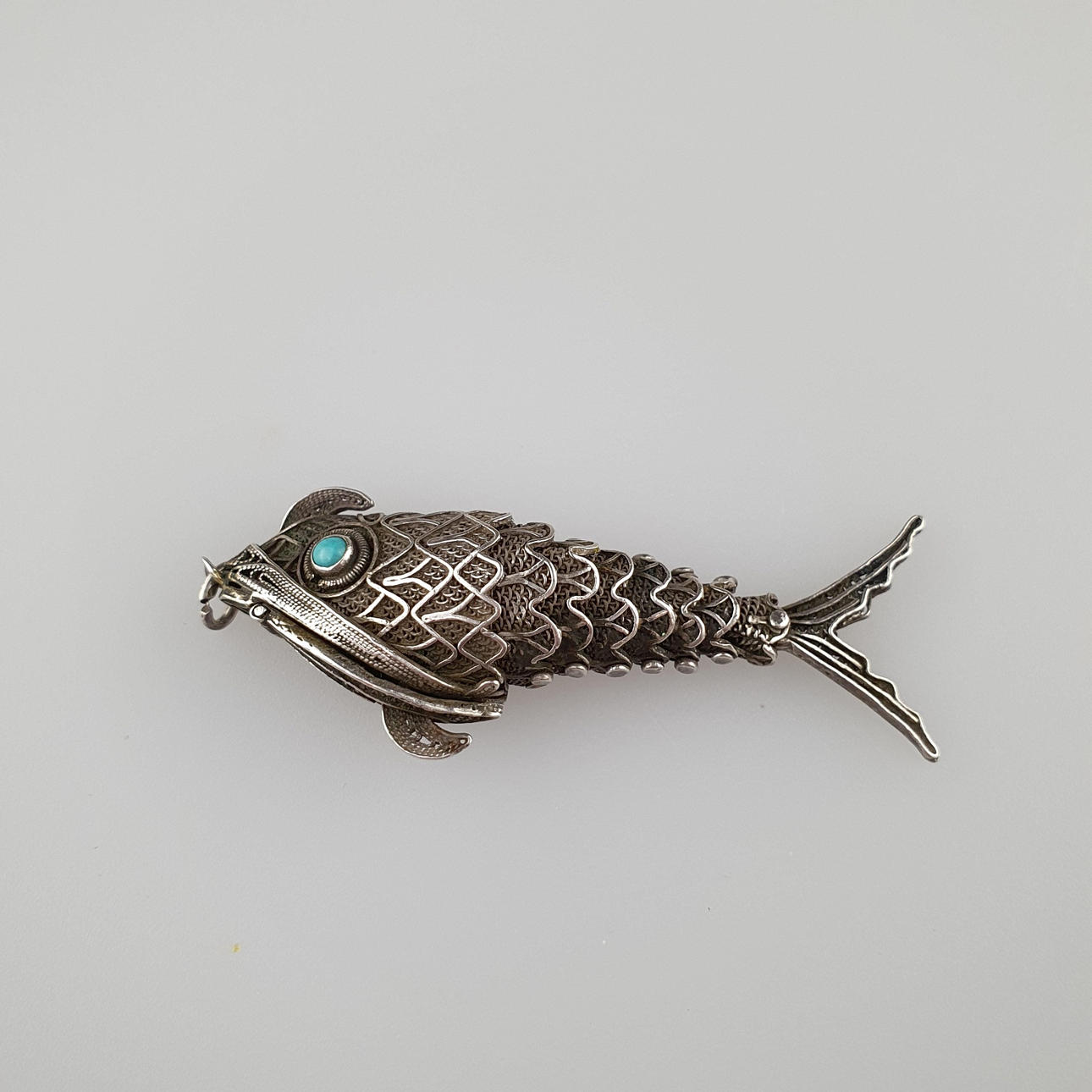 colgante de filigrana estampado en forma de pez con segmentos móviles, ojos engastados con cabujones de turquesa, un compartimento secreto con bisagras en la boca del pez, L. (con lazo de cadena) aprox. 6 cm, peso aprox. 8 g.