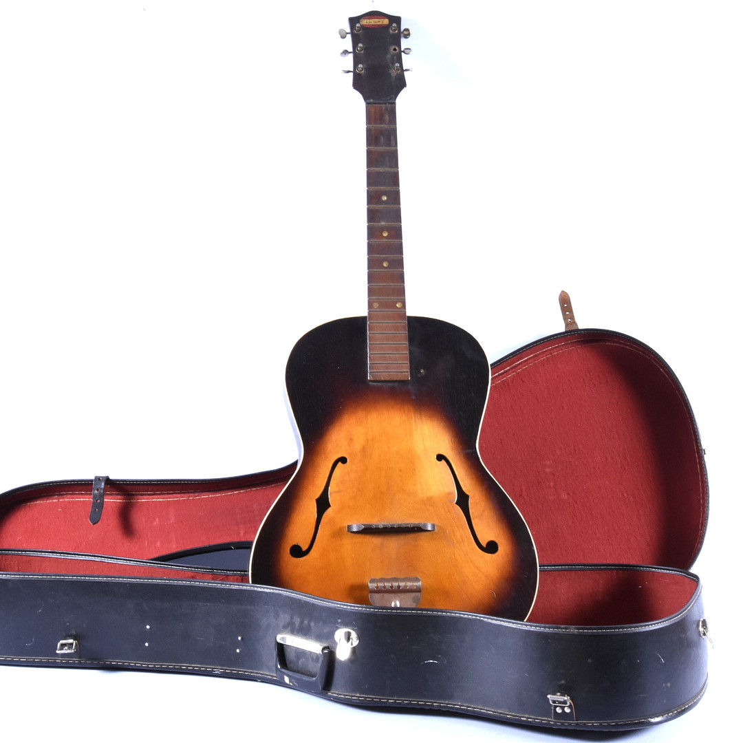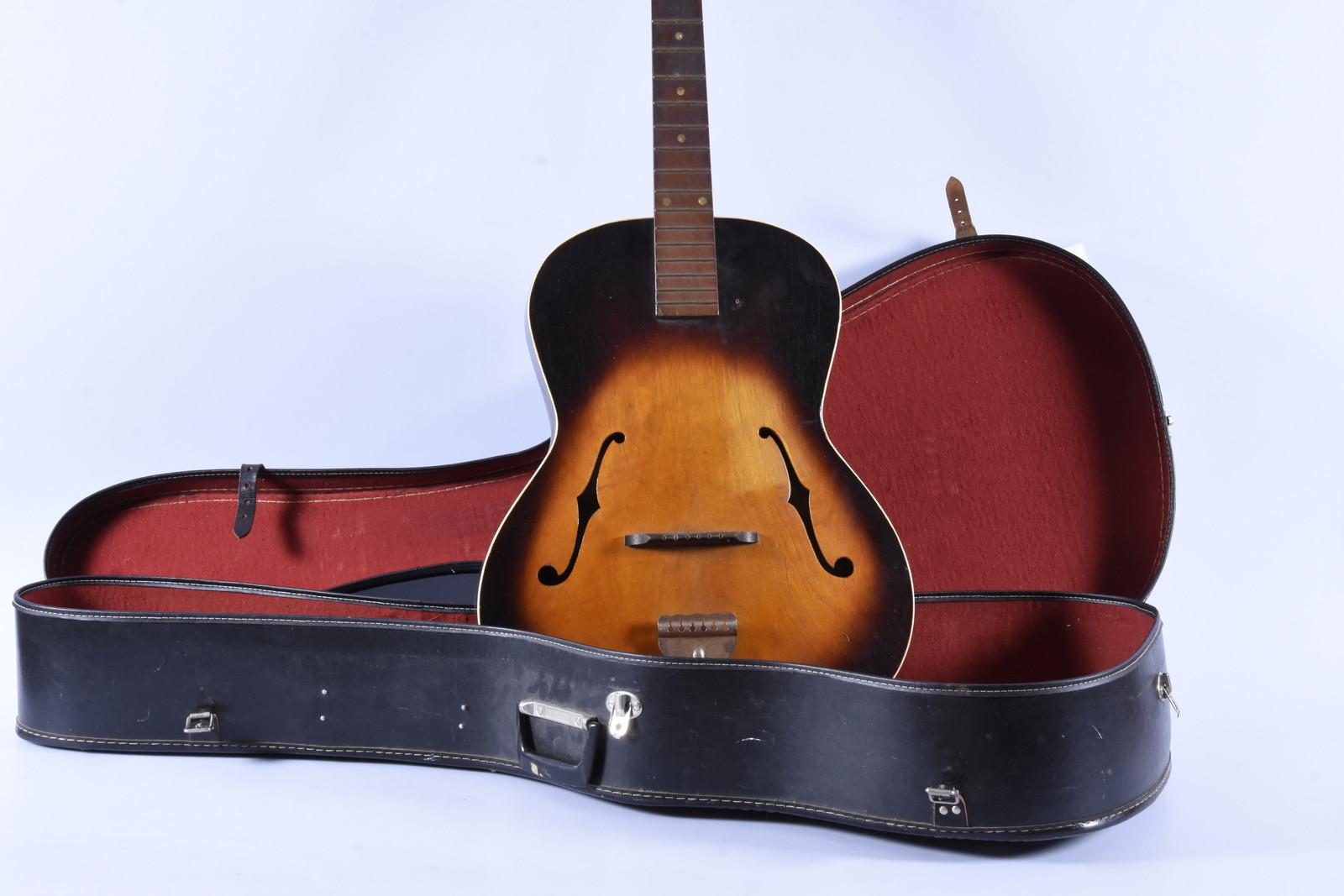 1482273. GUITARRA ACÚSTICA EN ESTUCHE, 1950s.