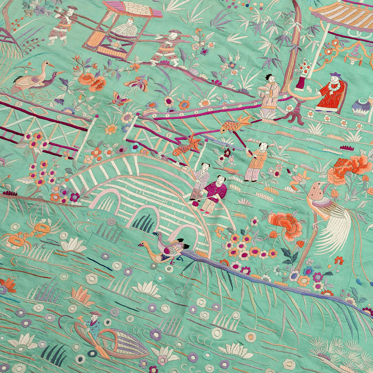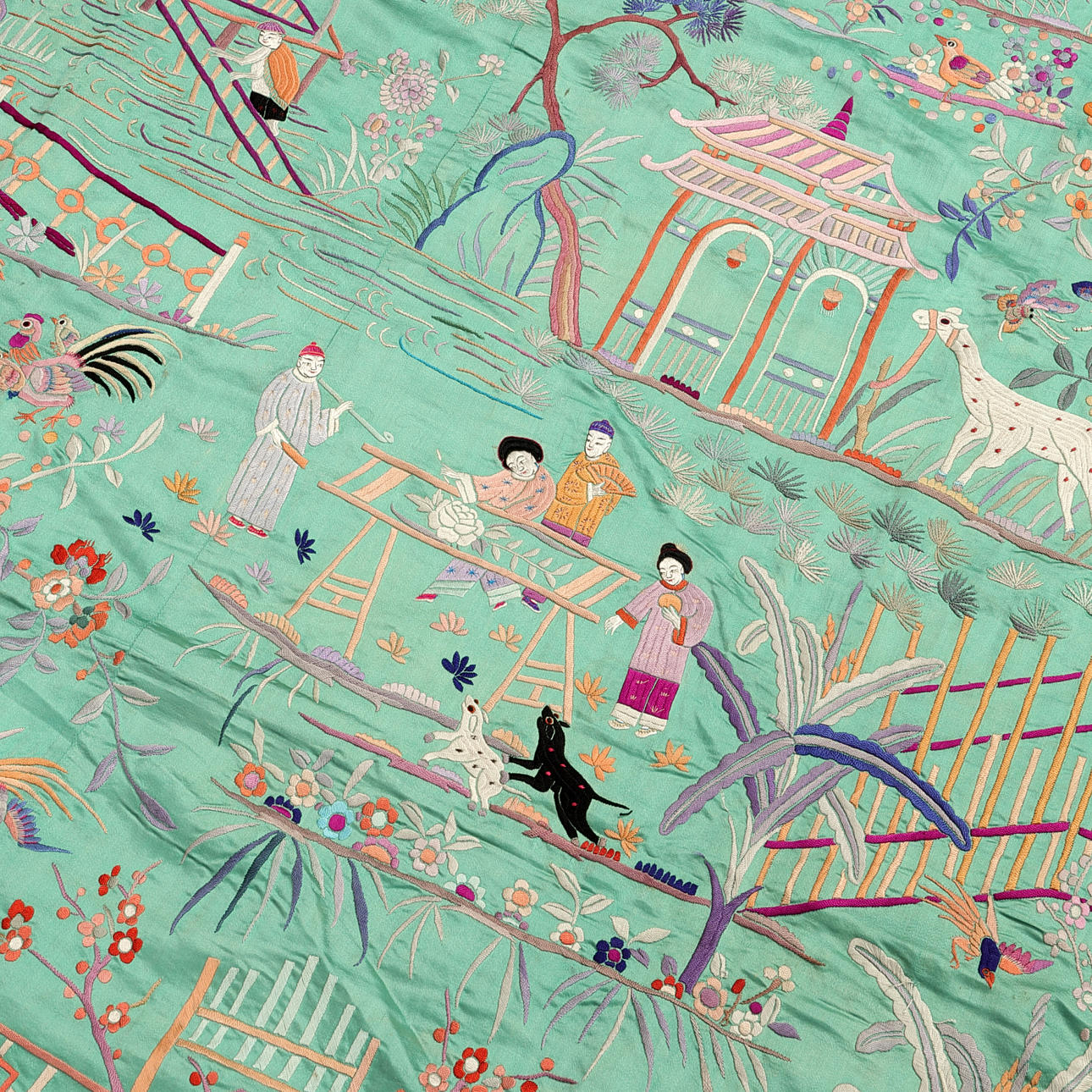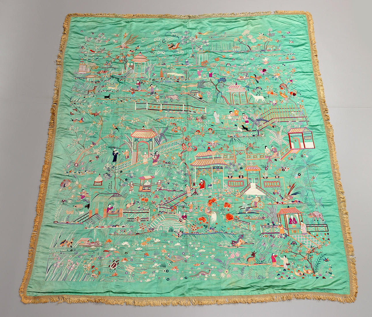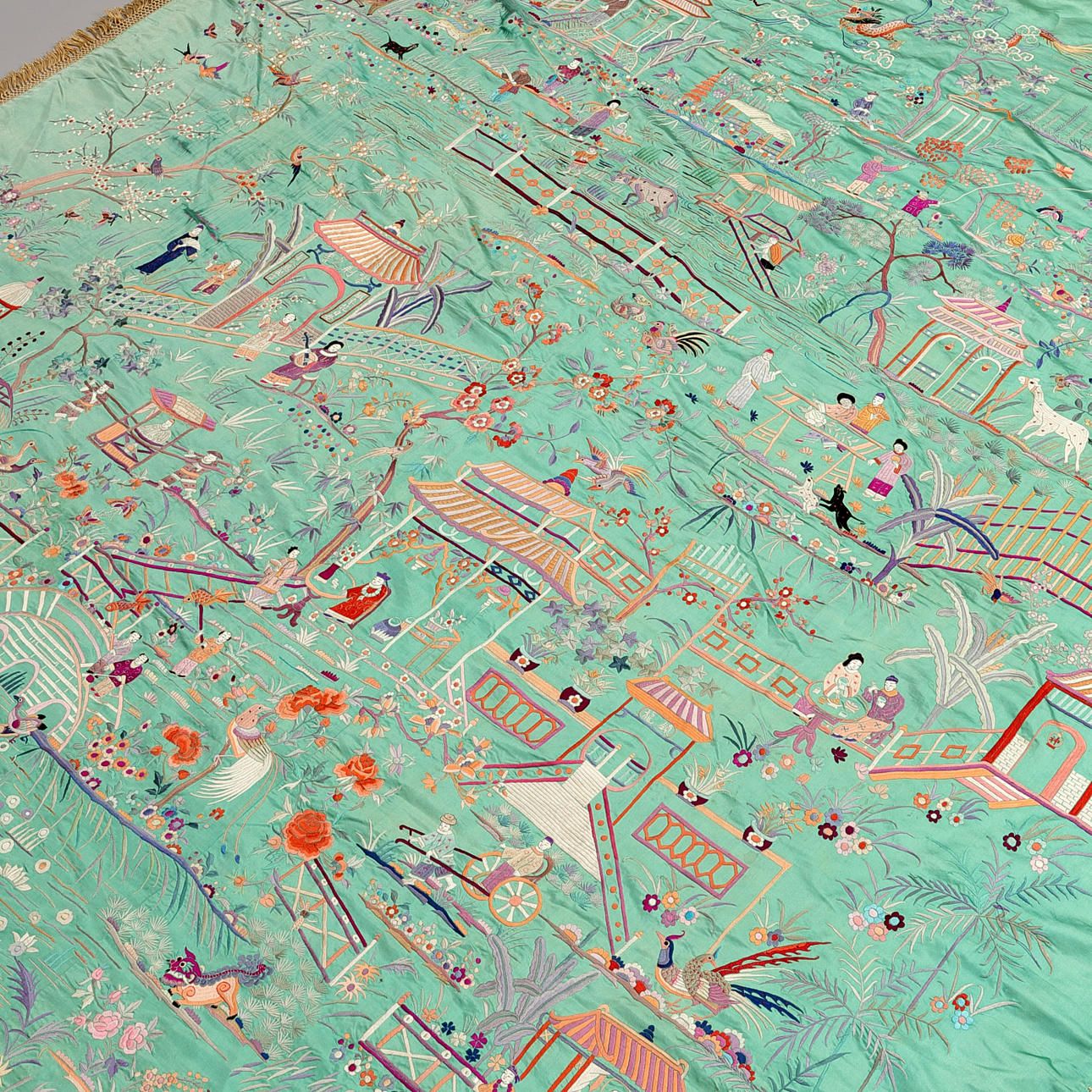 Bordado de seda con vida de pueblo chino, primera mitad del siglo XX, 212x179cm aprox.
