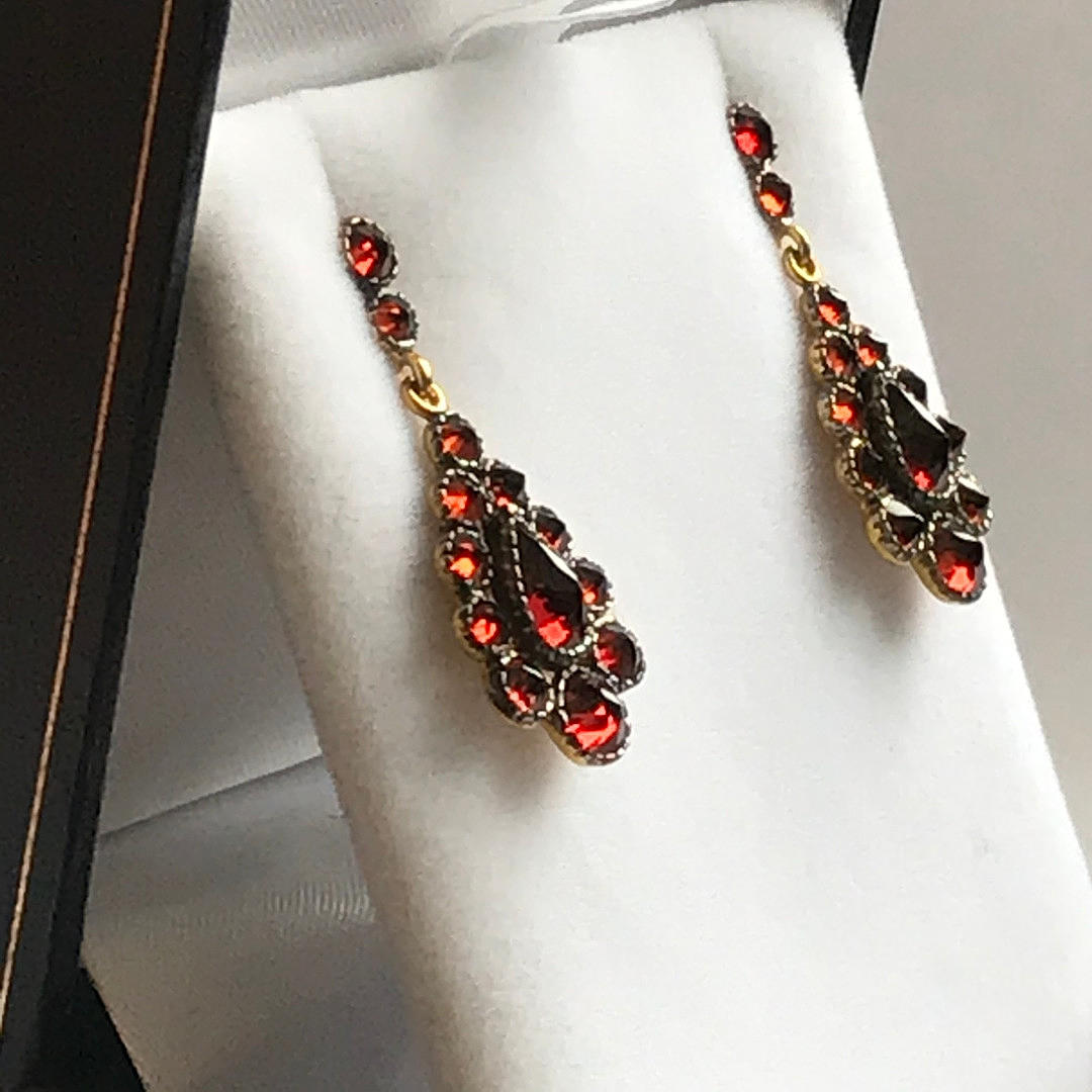 Cada pendiente está engastado con un granate tallado en rosa en forma de lágrima de 8 x 5 mm aproximadamente.