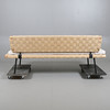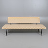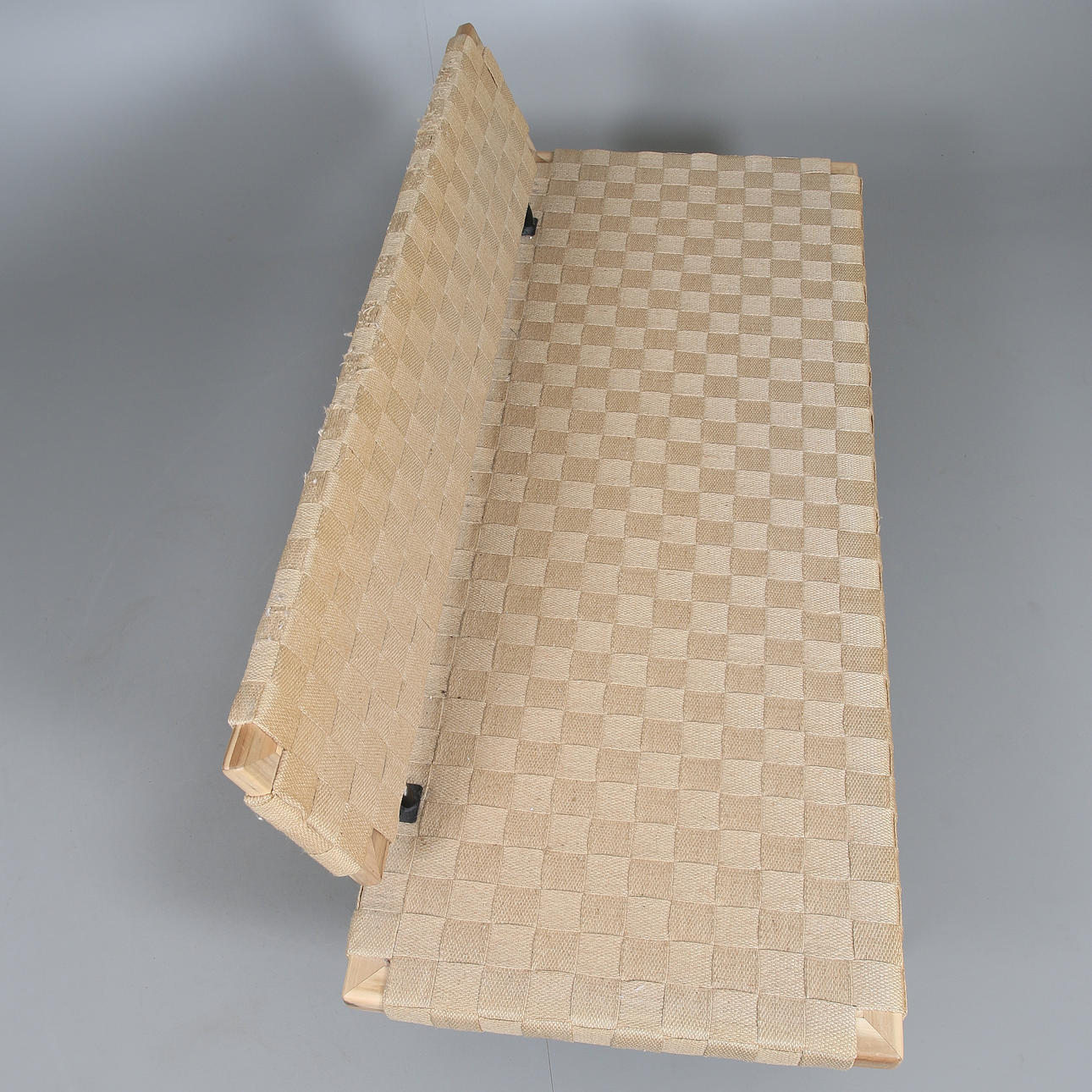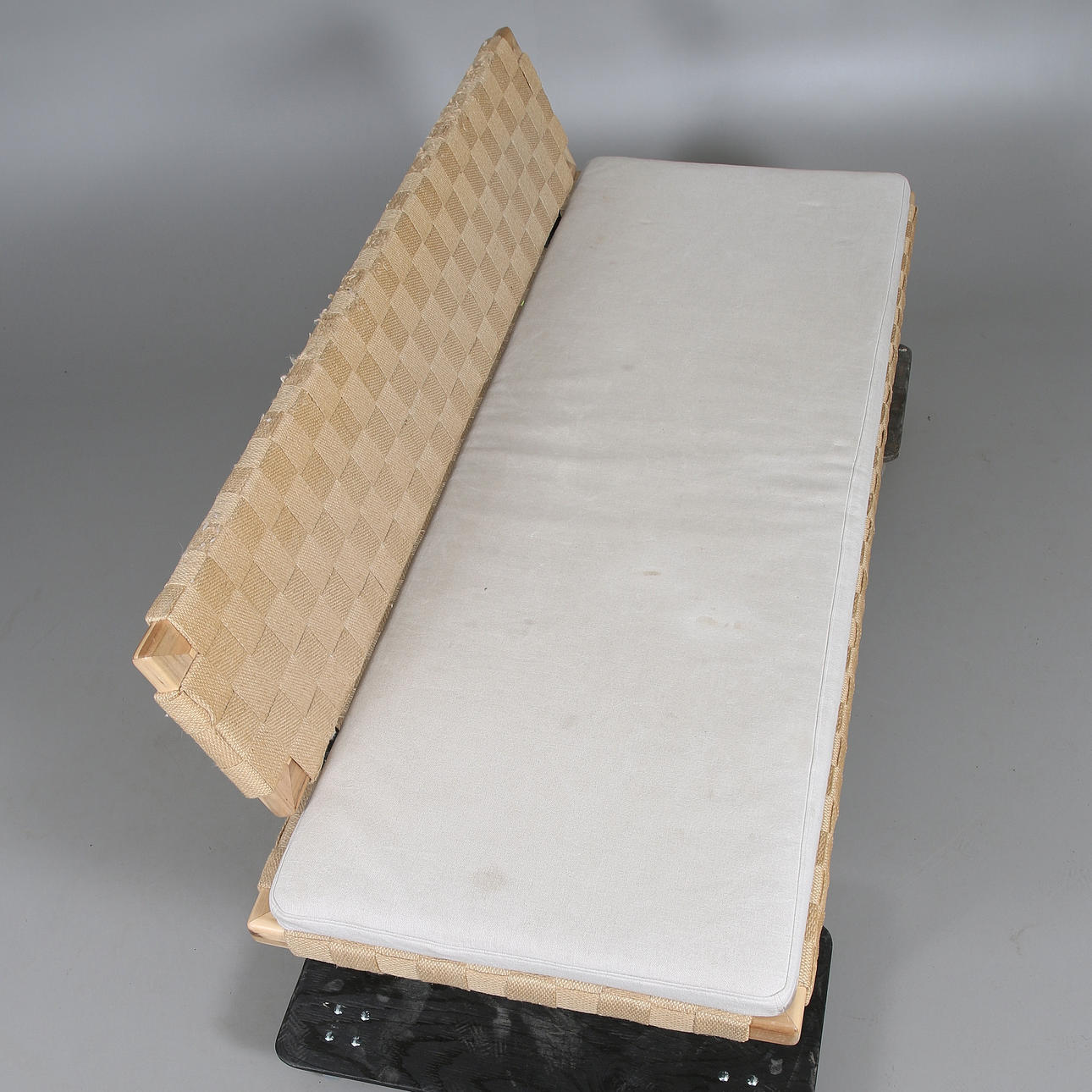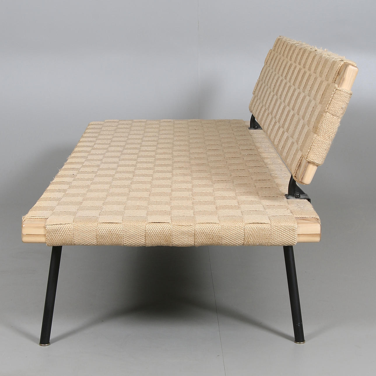 estructura de madera y tubo de acero lacado en negro. Asiento y respaldo de cincha de silla de montar.