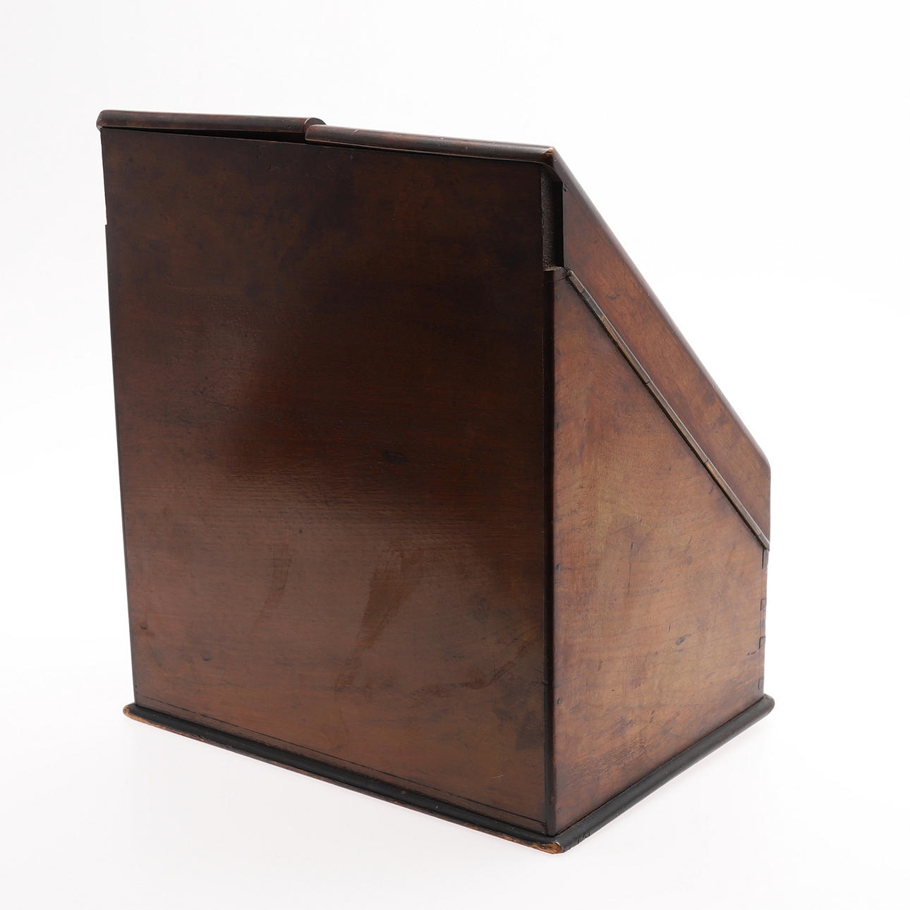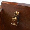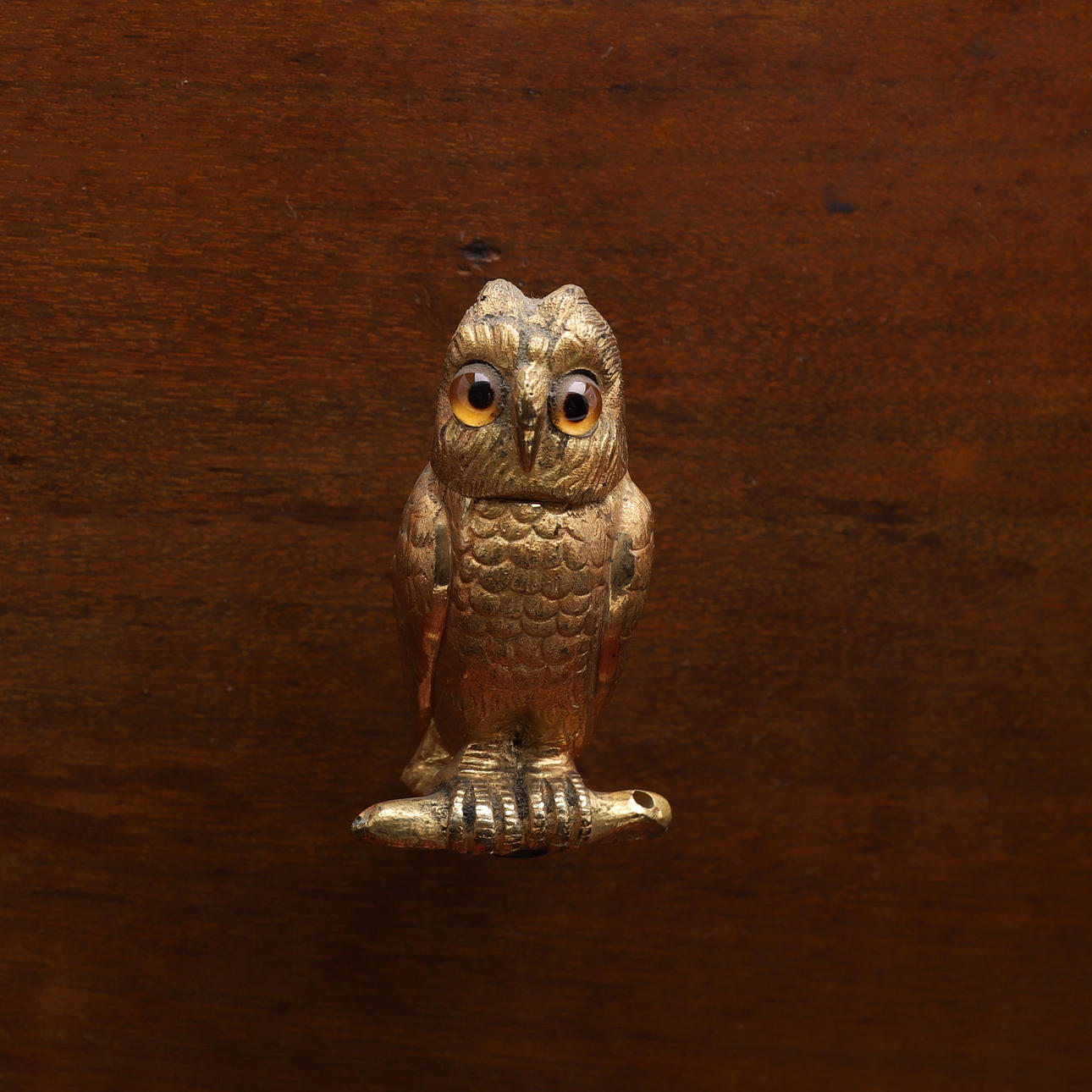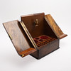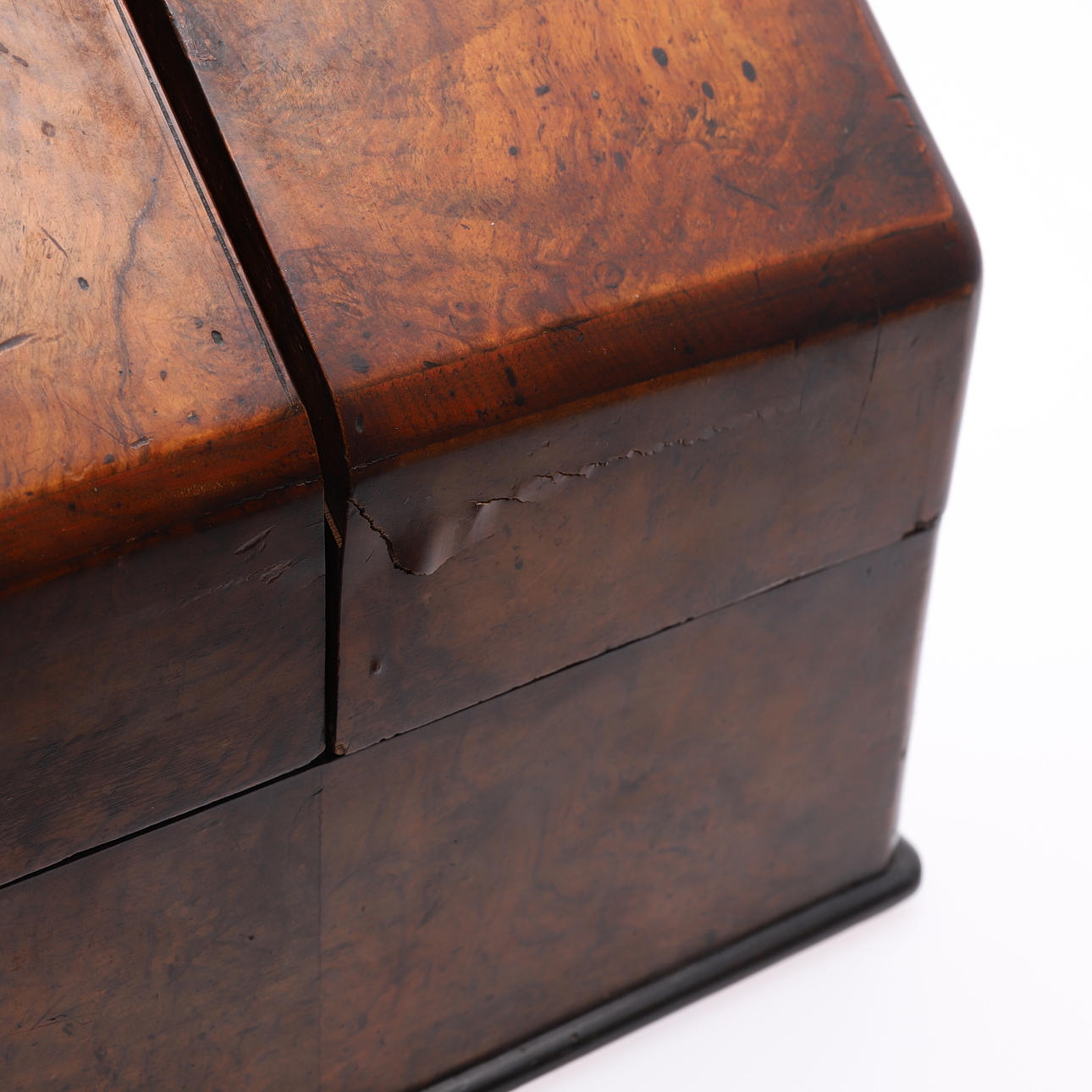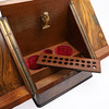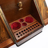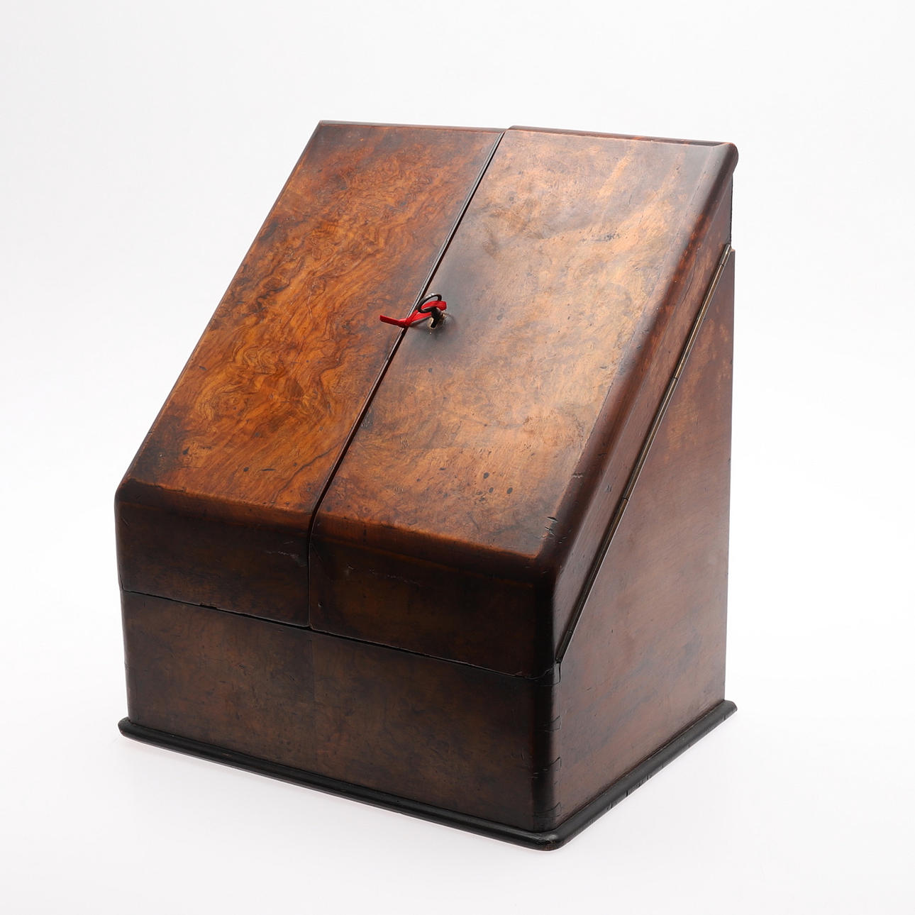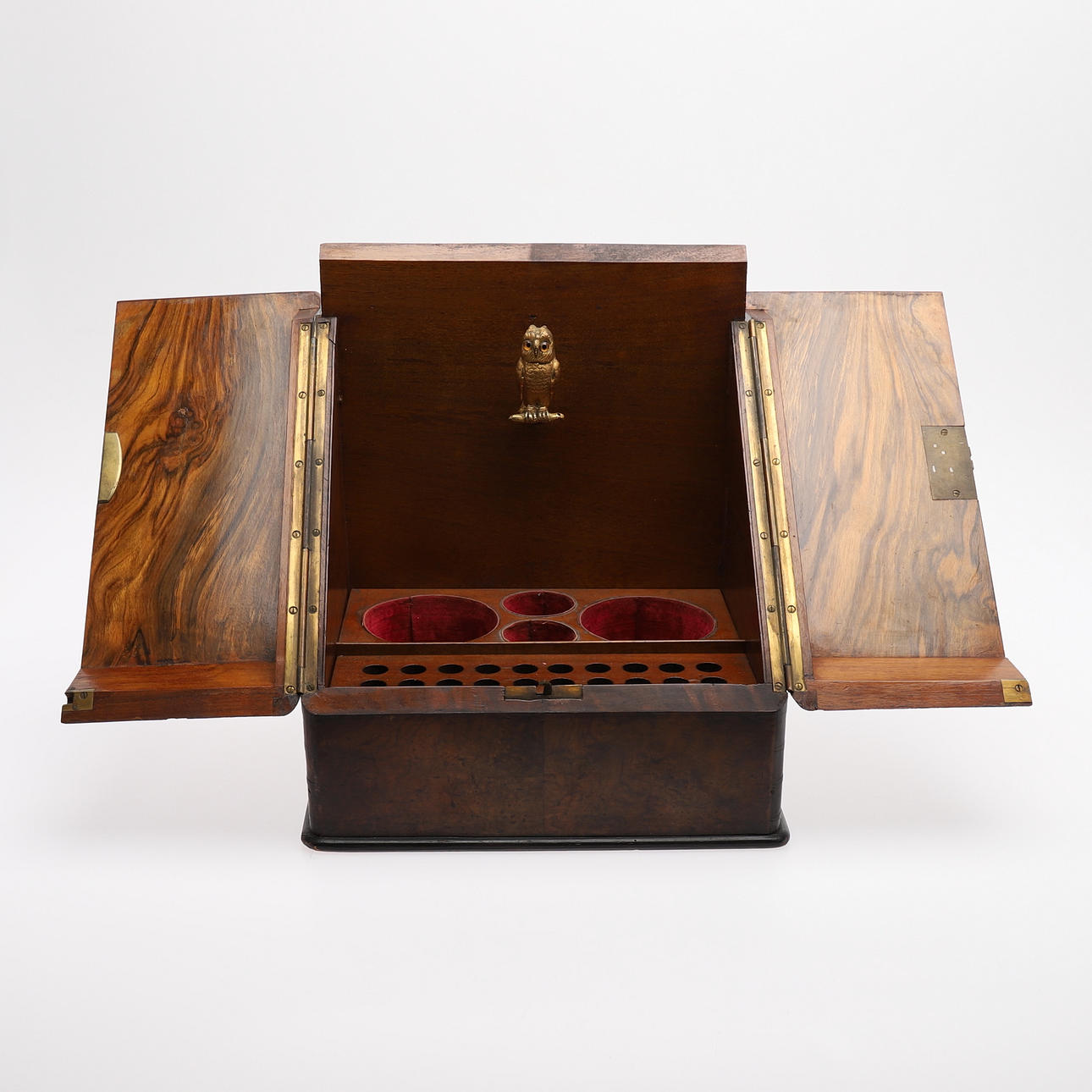 Enchapado en nogal y raíz de nogal, con espacio para 20 puros, 2 botellas de whisky y 2 vasos y porta cerillas en forma de buho de metal, siglo XIX, altura 37,5 cm.