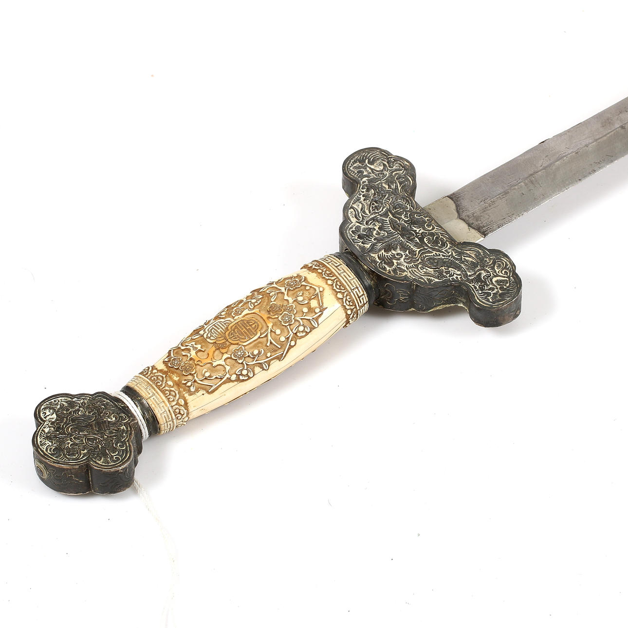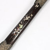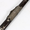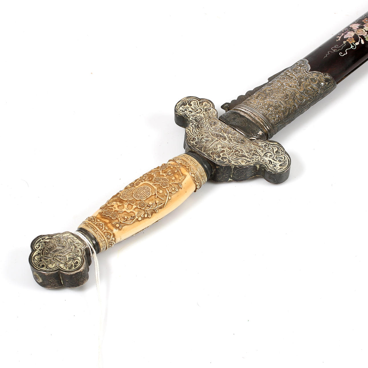 Mango de hueso con decoración en relieve. Bañera con nácar incrustado y herrajes de metal blanco con decoración en relieve. Longitud de la hoja aprox. 71cm. Longitud total con bañera aprox. 100cm.