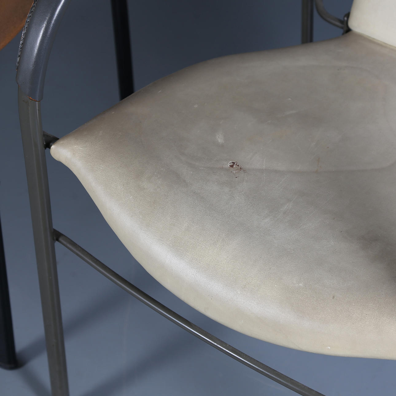 Estructura en acero pintado con apoyabrazos en piel y tapicerías en escay y tela.