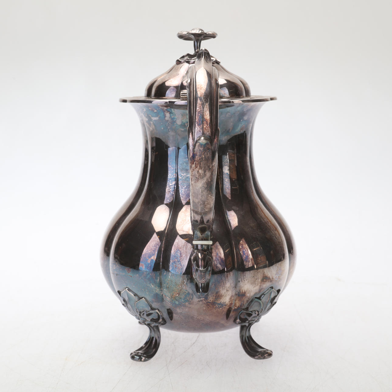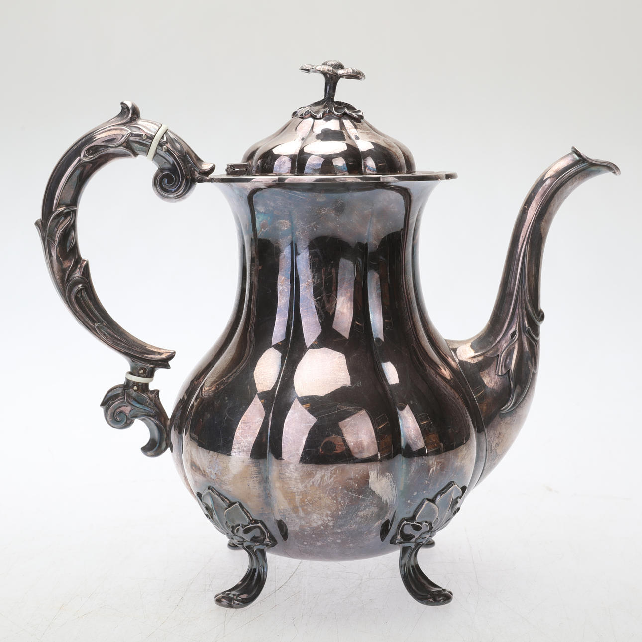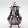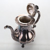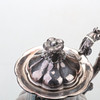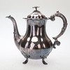 Cafetera/tetera en plata, estilo rococó, sobre cuatro patas, decoración floral y vegetal, parcialmente en relieve.