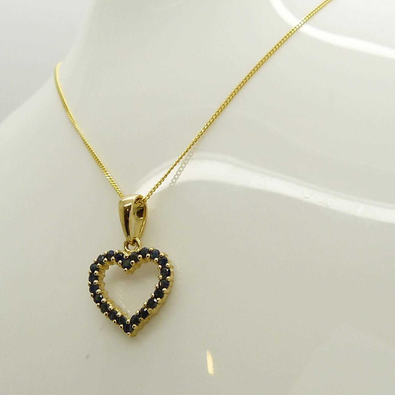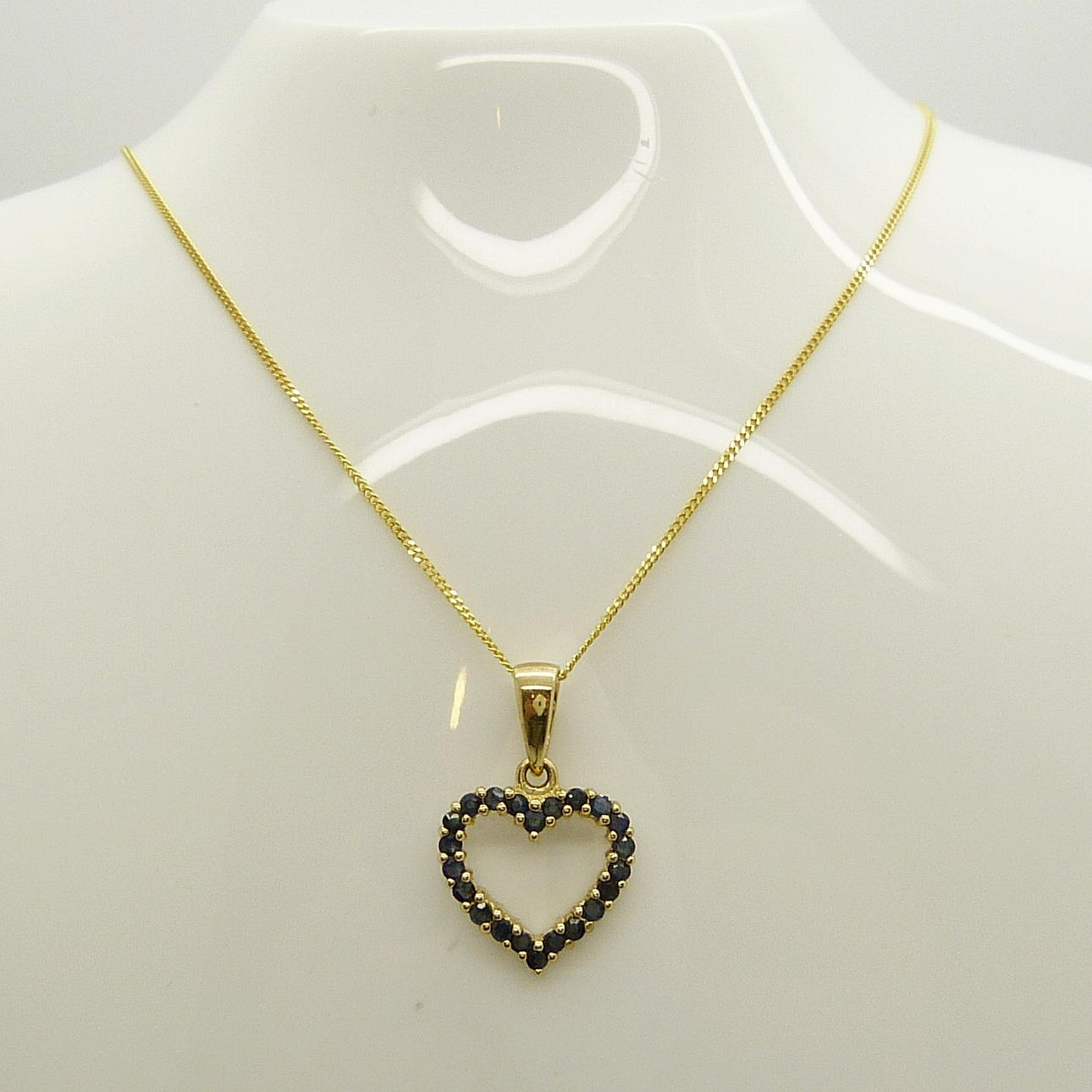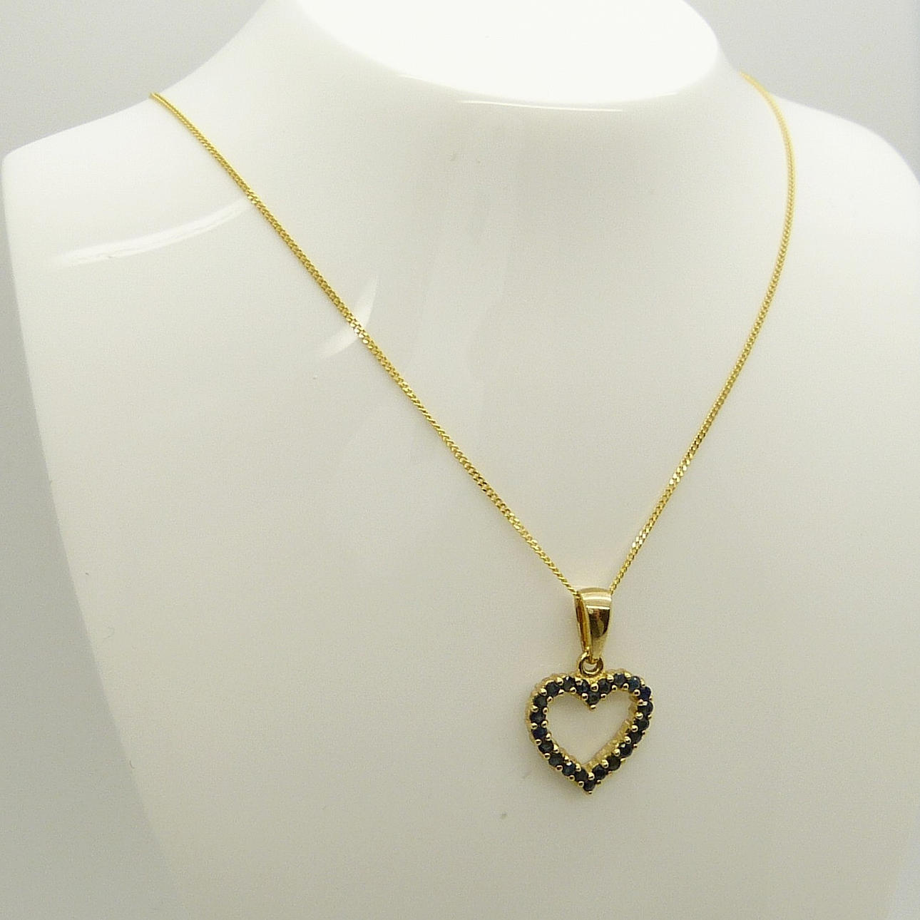 Un colgante de corazón de zafiro de oro amarillo de 9k con una cadena de oro amarillo de 9k con eslabones curvos.