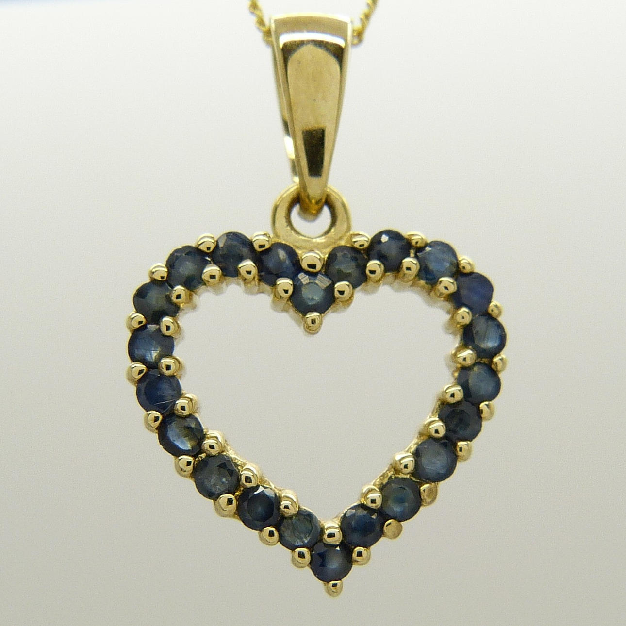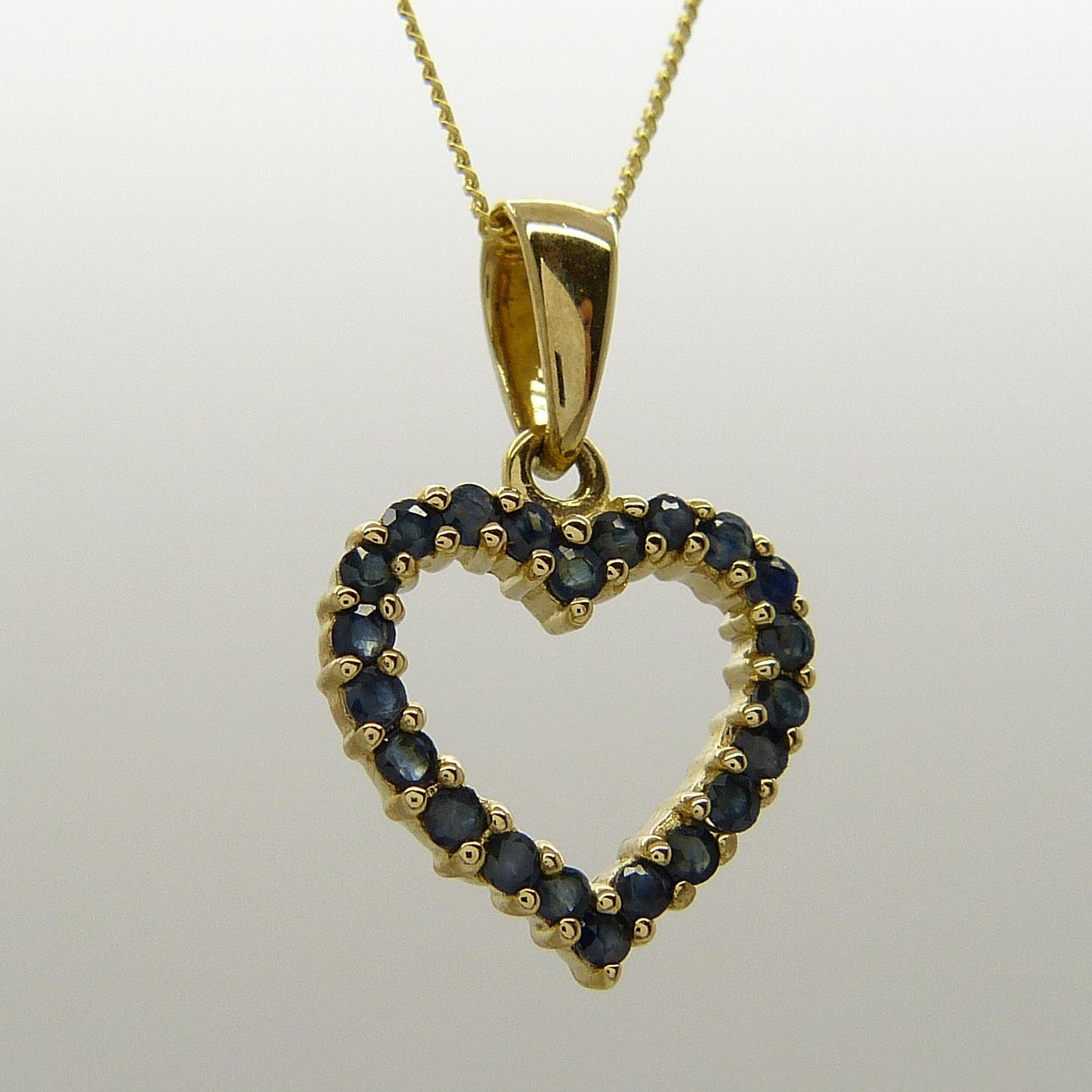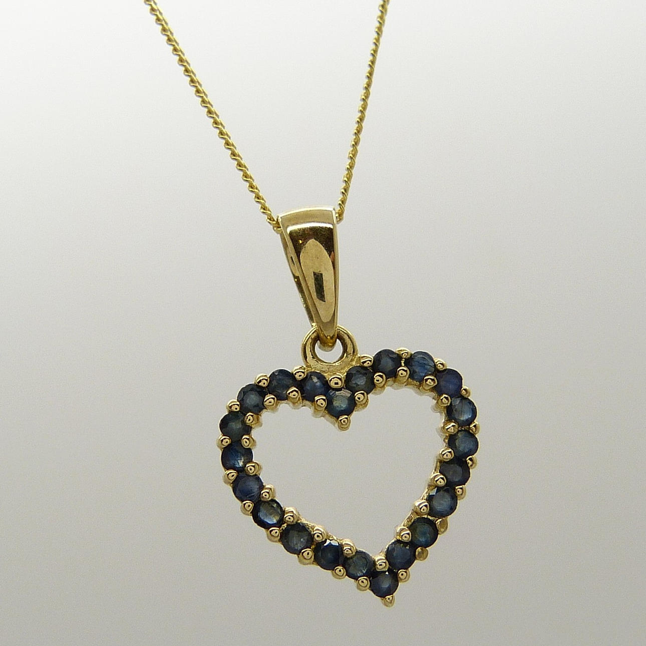 Un colgante de corazón de zafiro de oro amarillo de 9k con una cadena de oro amarillo de 9k con eslabones curvos.
