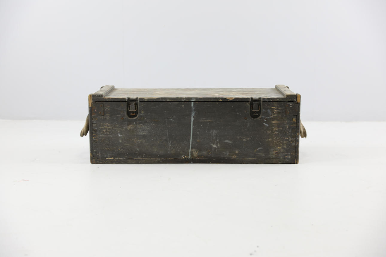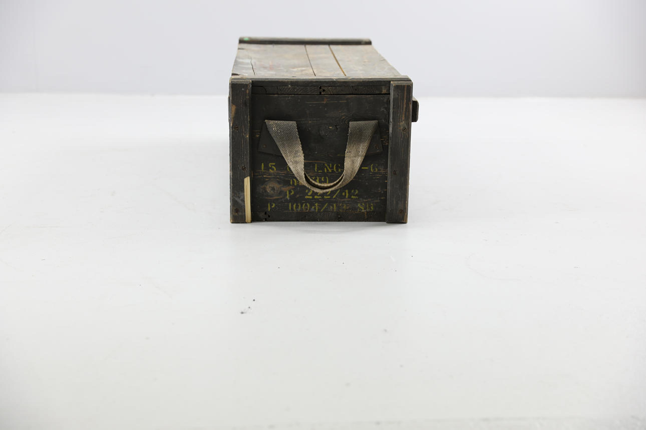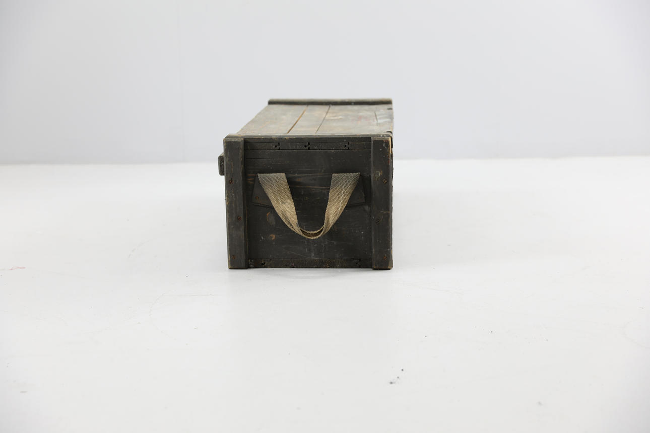 Caja de madera para municiones del ejército sueco. Sillín de tierra con correas de transporte. Alto 30 cm Largo 91 cm Ancho 38 cm.