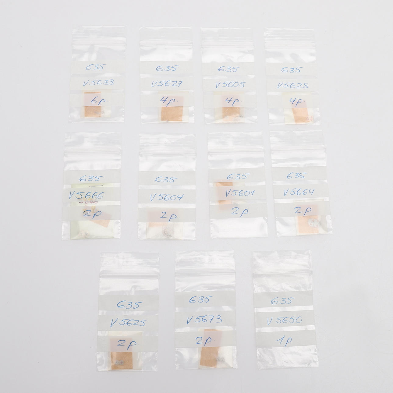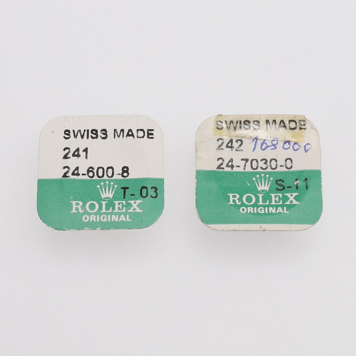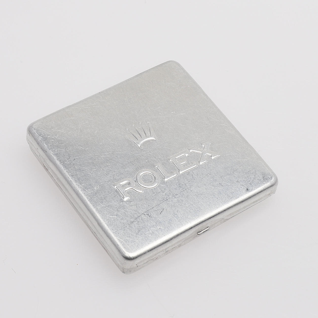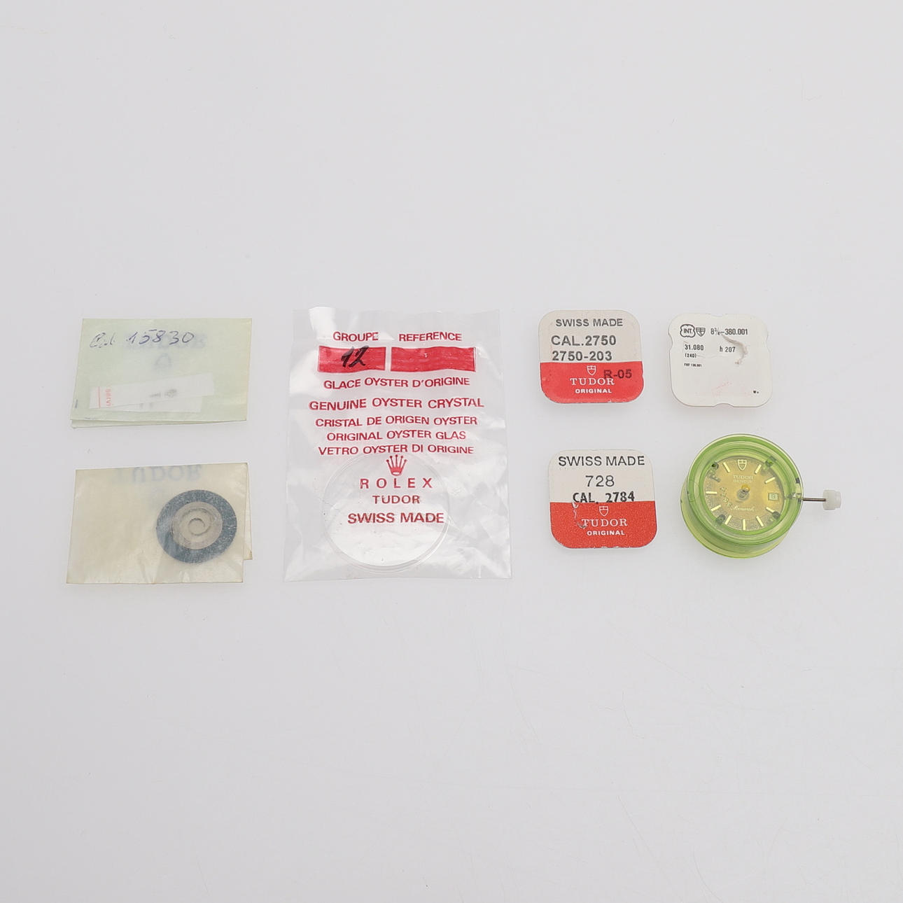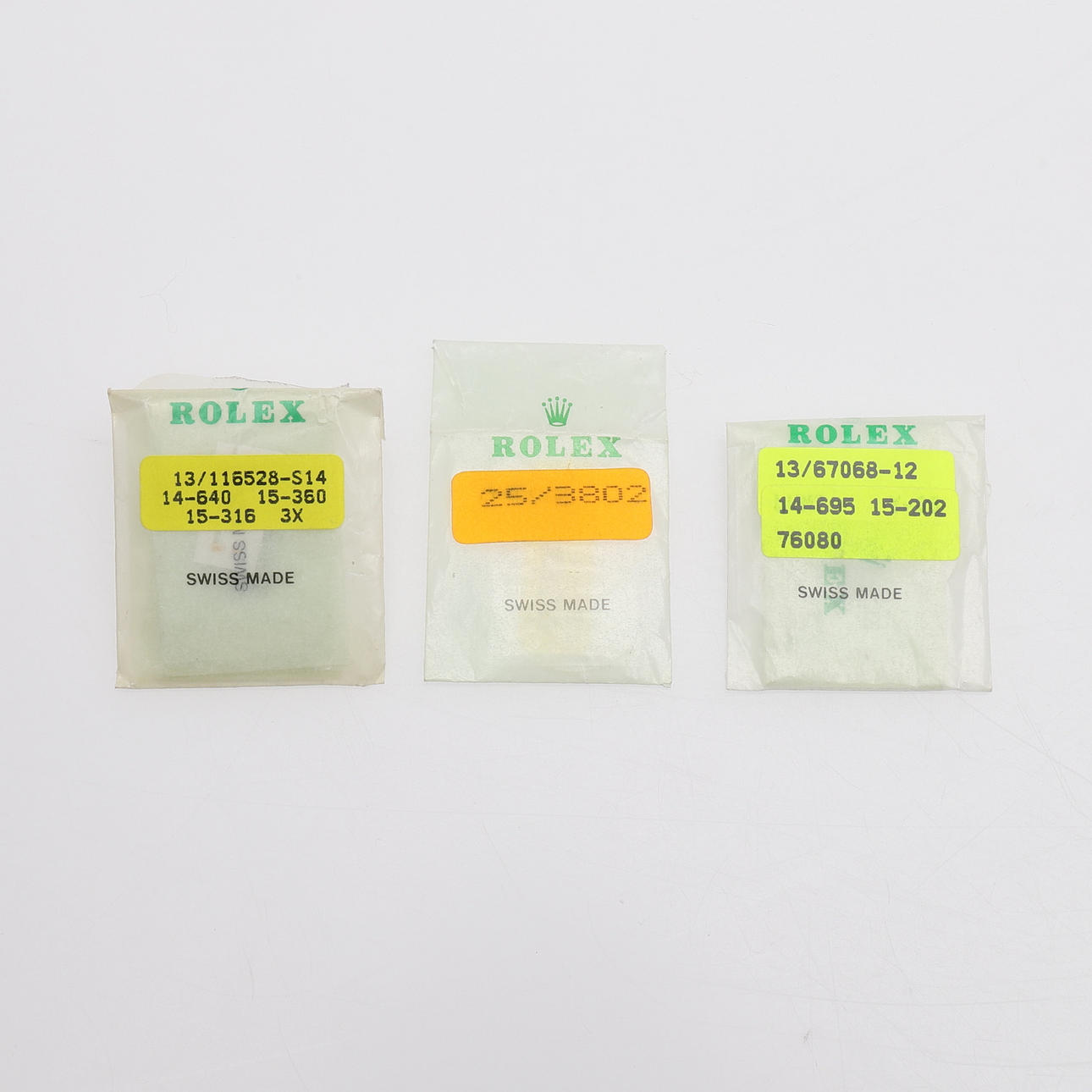 Piezas para Rolex Cal. 635 en once bolsas, incluyendo ruedas automáticas, ruedas de bloqueo, piedras de apoyo. Módulo automático completo sin usar para Rolex Bubbleback en caja de hojalata. Vasos varios para Ostra en bolsa. Dos coronas: Triplock acero con cuello y Twinlock, dorado. Varias manecillas, entre otras, para relojes Rolex Daytona y Rolex de mujer. Herramienta para colocar cuellos de corona, Rolex, número de referencia 2446. Cuatro enlaces defectuosos, Rolex: 93150 Oyster, 62510 Jubilée, 3834/13/566B Oyster, enlace Oyster marcado 3/68.