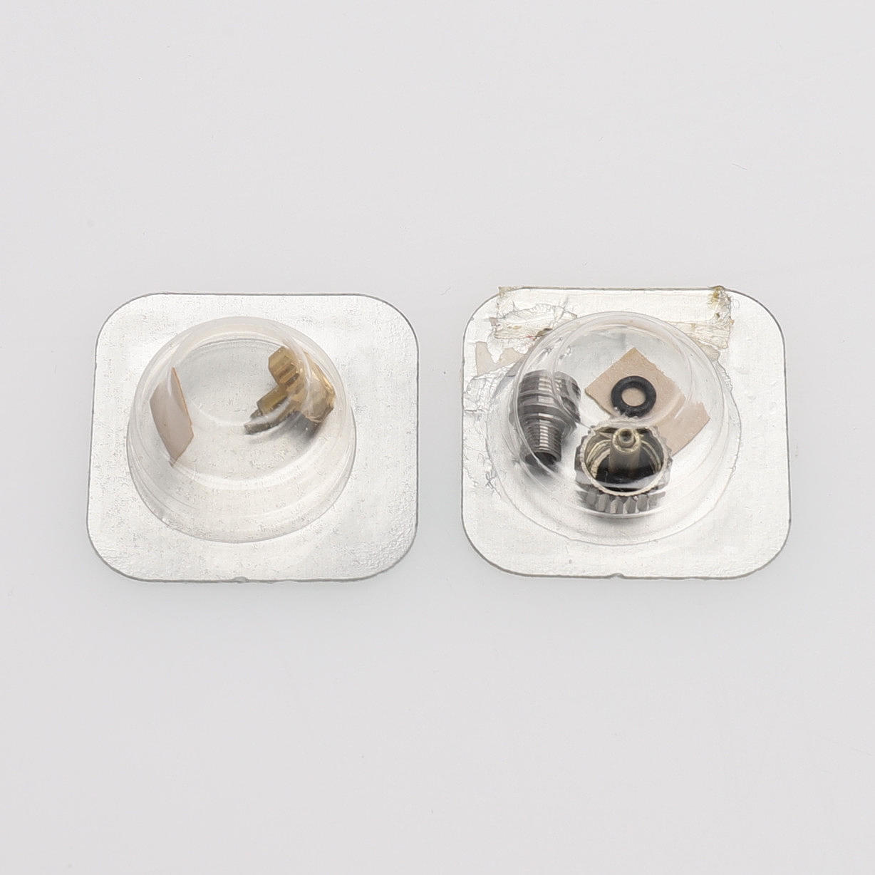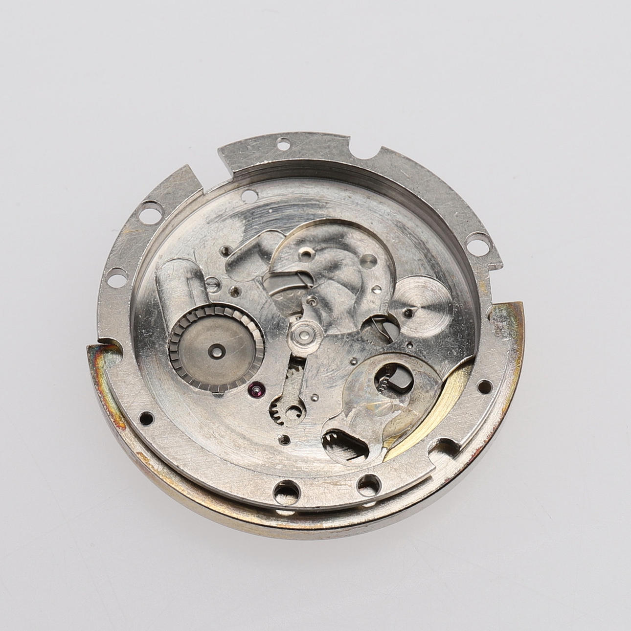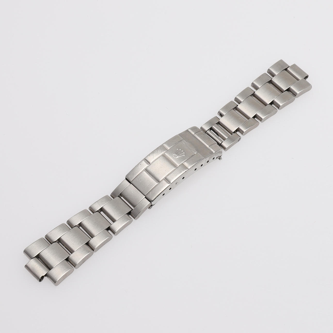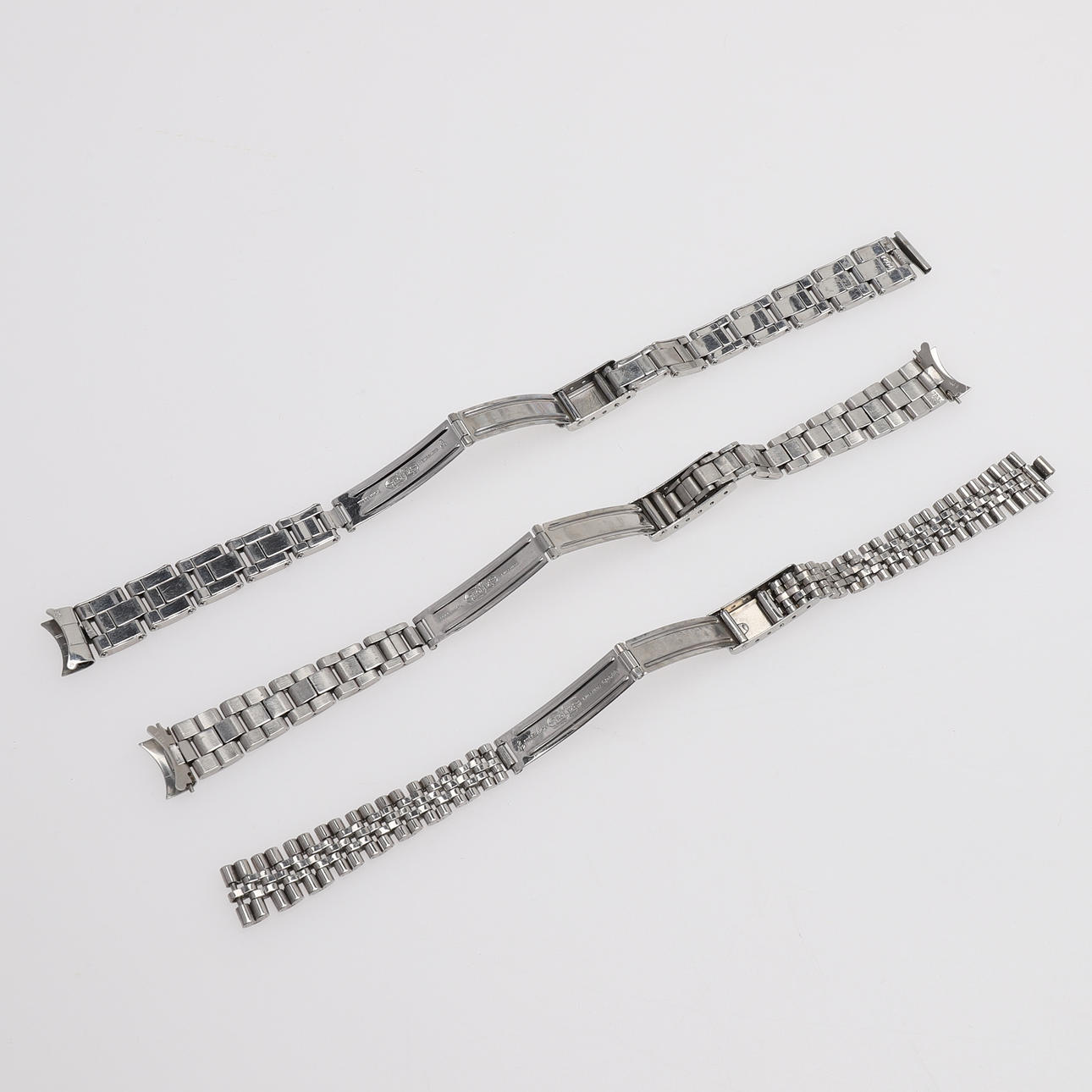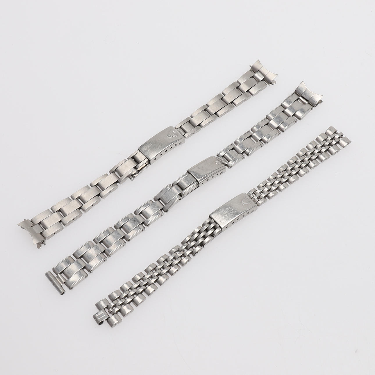 Piezas para Rolex Cal. 635 en once bolsas, incluyendo ruedas automáticas, ruedas de bloqueo, piedras de apoyo. Módulo automático completo sin usar para Rolex Bubbleback en caja de hojalata. Vasos varios para Ostra en bolsa. Dos coronas: Triplock acero con cuello y Twinlock, dorado. Varias manecillas, entre otras, para relojes Rolex Daytona y Rolex de mujer. Herramienta para colocar cuellos de corona, Rolex, número de referencia 2446. Cuatro enlaces defectuosos, Rolex: 93150 Oyster, 62510 Jubilée, 3834/13/566B Oyster, enlace Oyster marcado 3/68.
