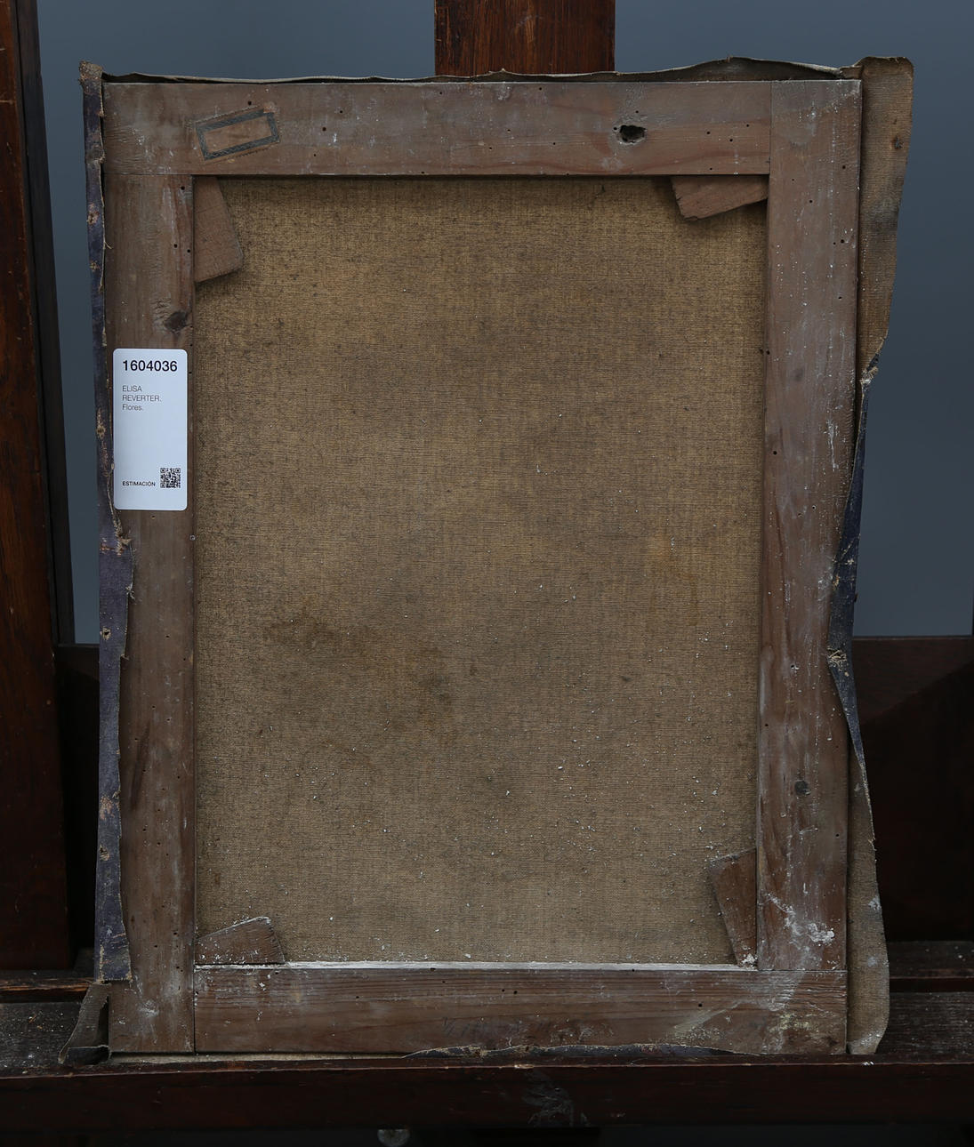 Galerías de xilófagos en el bastidor, aparentemente inactivos. Tela adaptada al bastidor por la misma artista, con márgenes salientes. Leves pérdidas y barniz sucio.