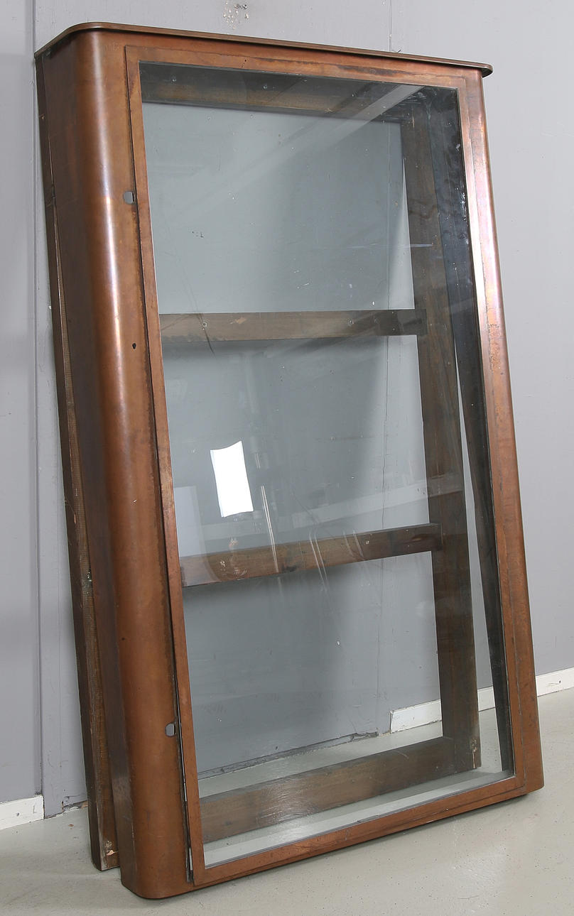 Para fijar a la pared. Con marco trasero de madera, carcasa de cobre, con ventana de vidrio. Largo 103, ancho 25, alto 160 cm.
