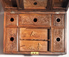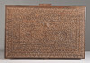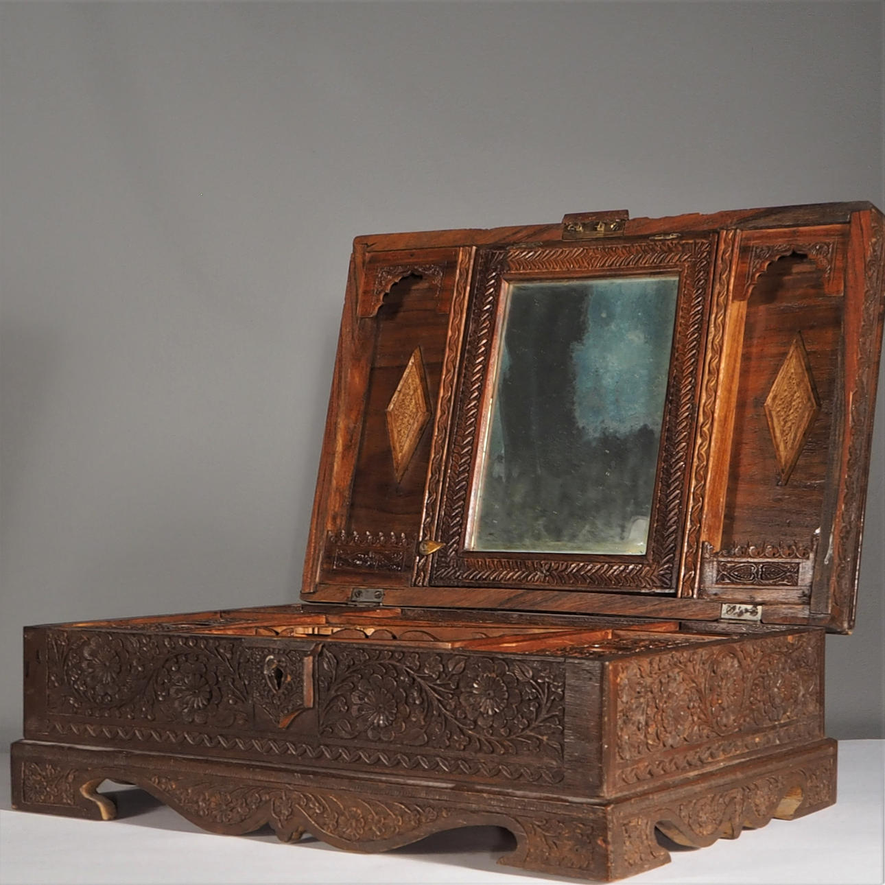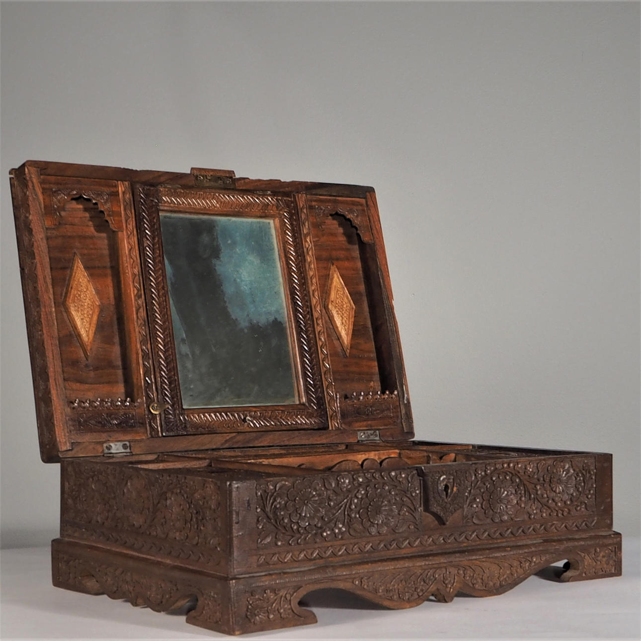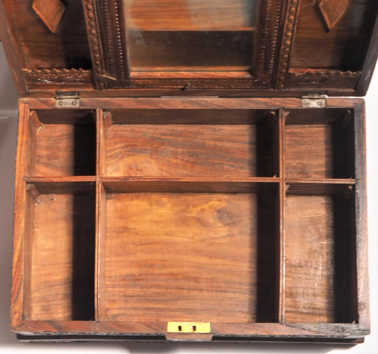 Interior con compartimento y espejo. Alto 13,5 cm, largo 39 cm, ancho 27 cm. Texto a continuación, comprado en Lahore - Pakistán 1961.
