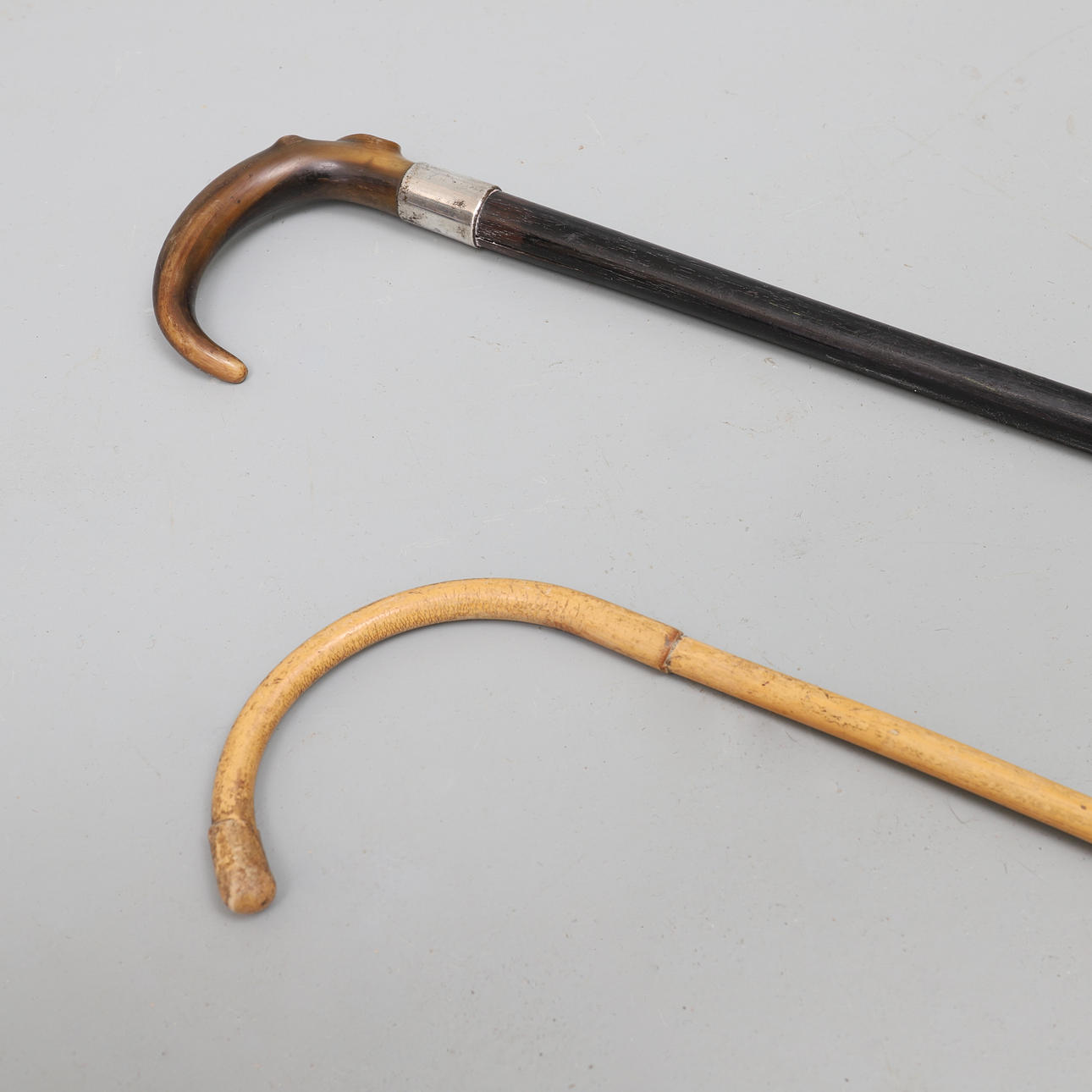 principios del siglo XX, con mango de cuerno curvo, la montura grabada con un monograma, 87,5 cm, y un bastón de época similar con mango curvo, 78,5 cm (2).