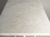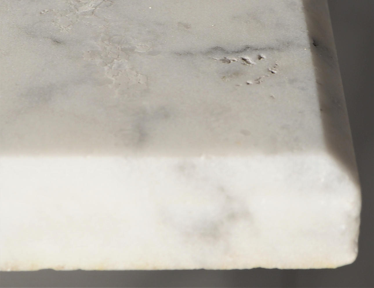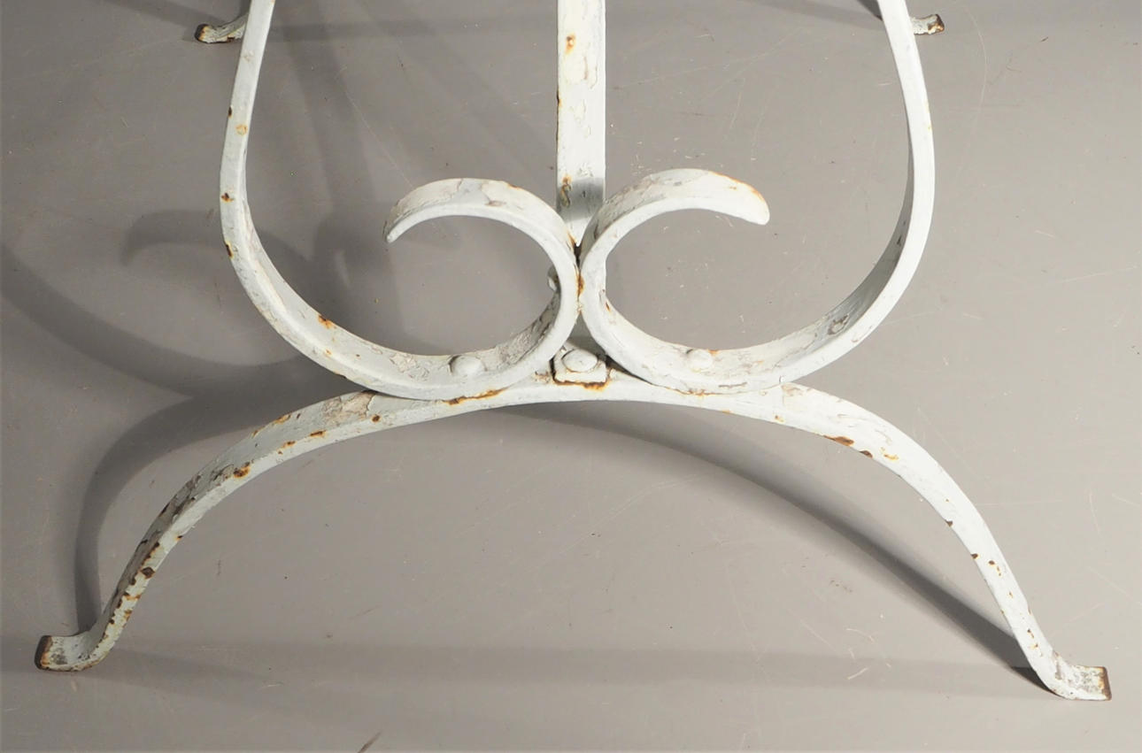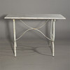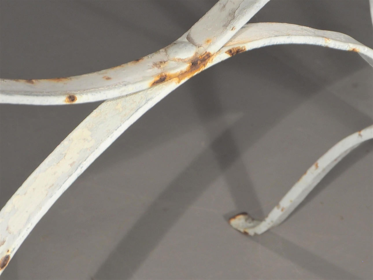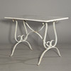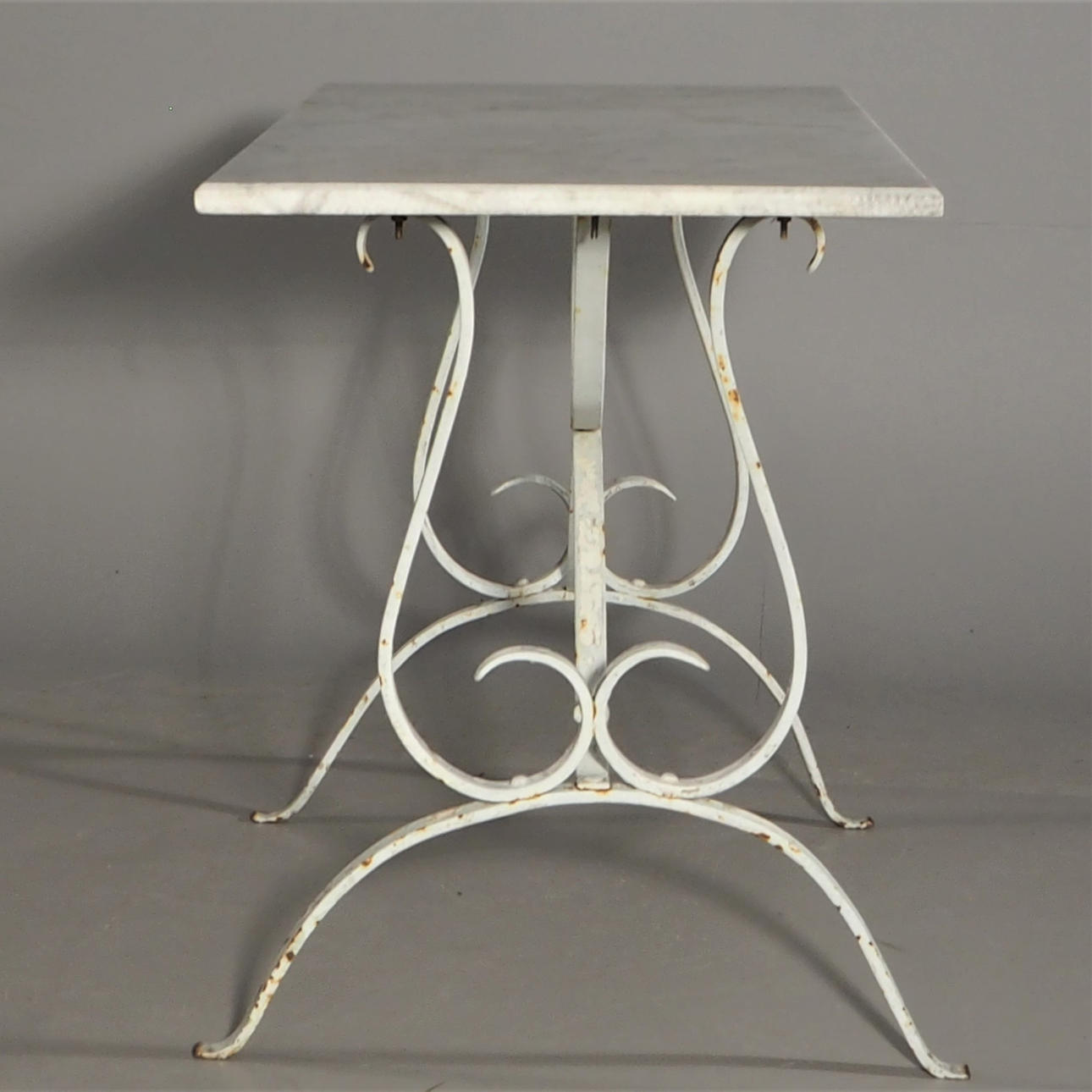 Base en hierro forjado pintado, tapa en mármol blanco. Largo 108 cm, alto 72 cm, ancho 54 cm.