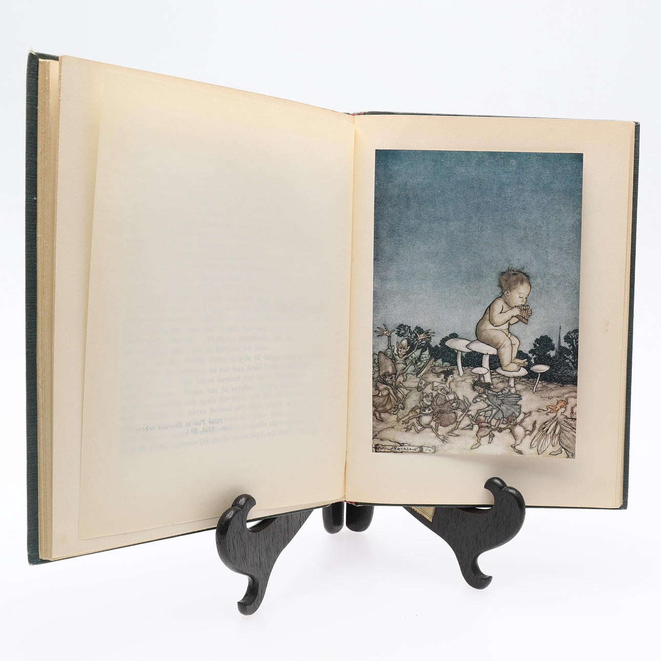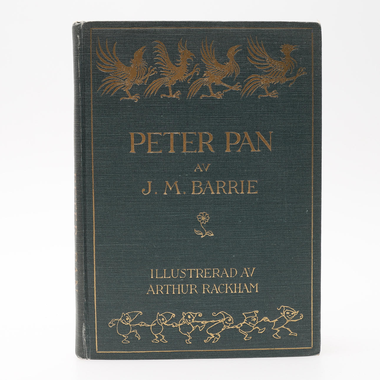 barry, j. METRO. & Rackham, Arthur, ilustrador. Peter Pan. En sueco por E. B. Con láminas en impresión a color de Arthur Rackham. Editorial Åhlén & Åkerlund, Estocolmo, 1923. 8vo encuadernación en tela verde de la editorial con texto dorado en el lomo y texto dorado y decoración en la portada. Ilustrado con 13 láminas a color montadas con papel protector. 120 págs. incluido los posters.