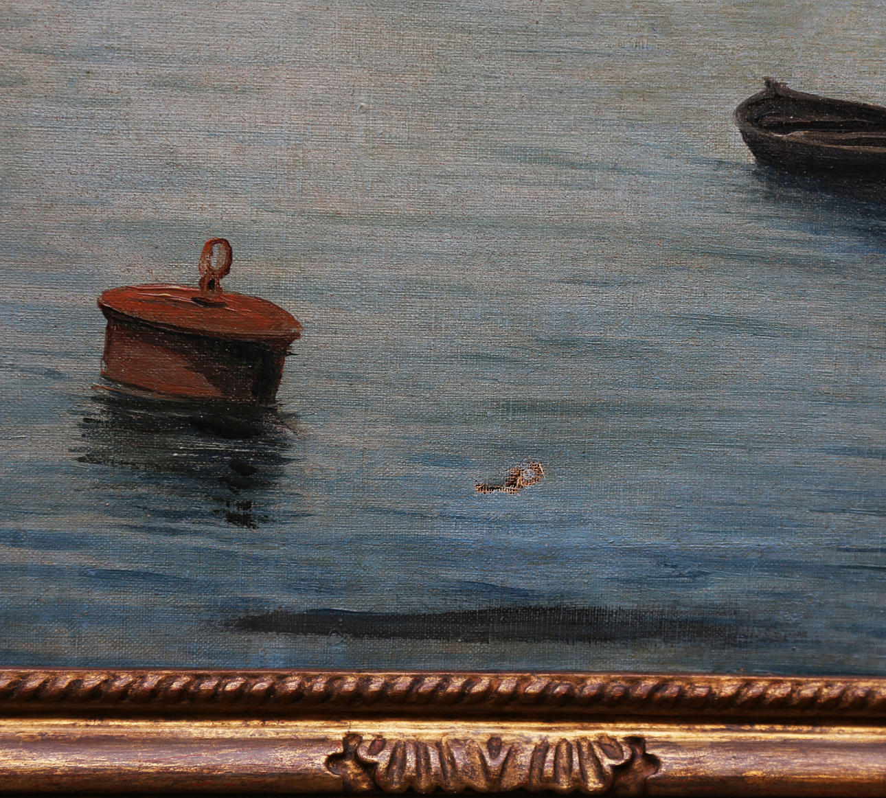 Reintegraciones cromáticas. Leve desgarro en la zona inferior. Marco en madera tallada y dorada.
