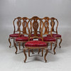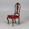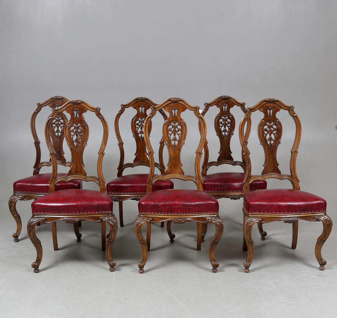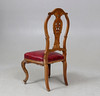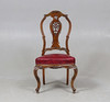 Respaldo con decoración calada, patas curvas, asiento firmemente tapizado.