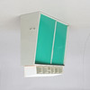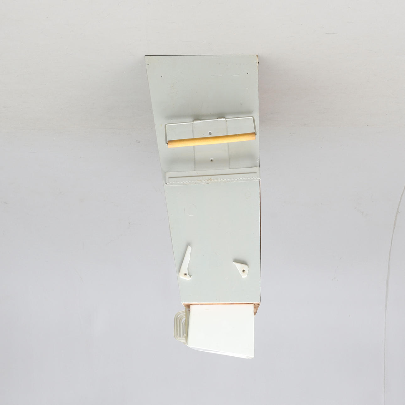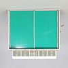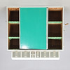 Pintado. Un par de puertas corredizas con estantes detrás de ellas. Especiero de plástico. Largo aproximado 90, ancho 82, alto 32 cm.