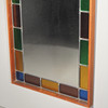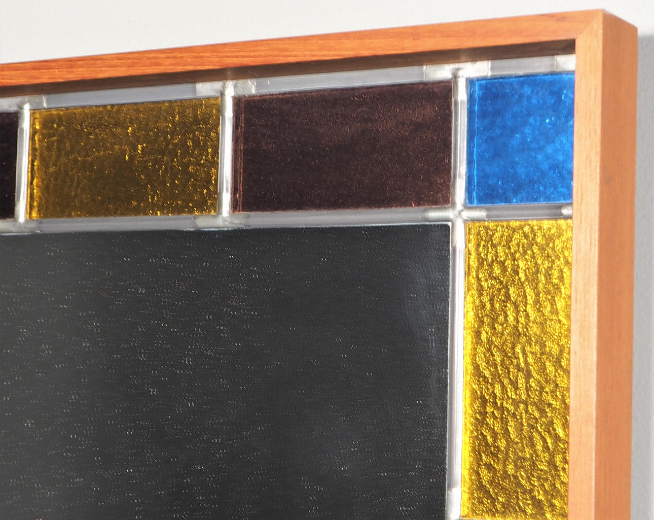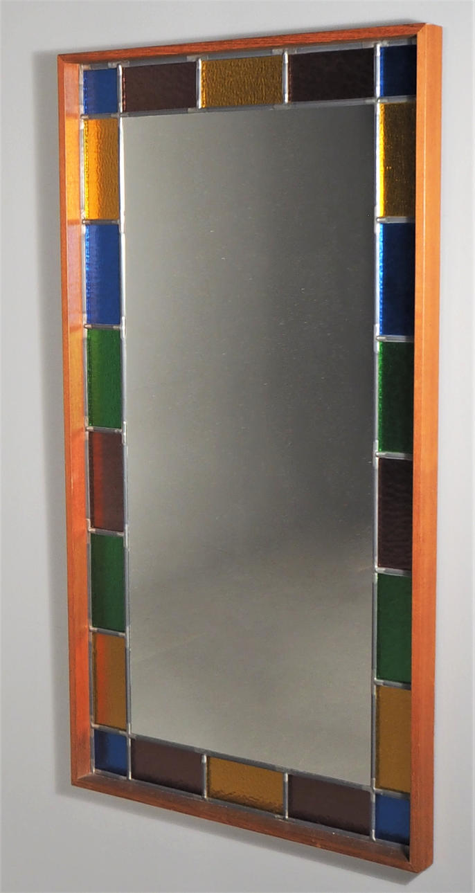 Estructura en teca con piezas de vidrio coloreado enmarcadas en peltre. Alto 110 cm, ancho 60 cm.