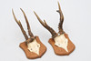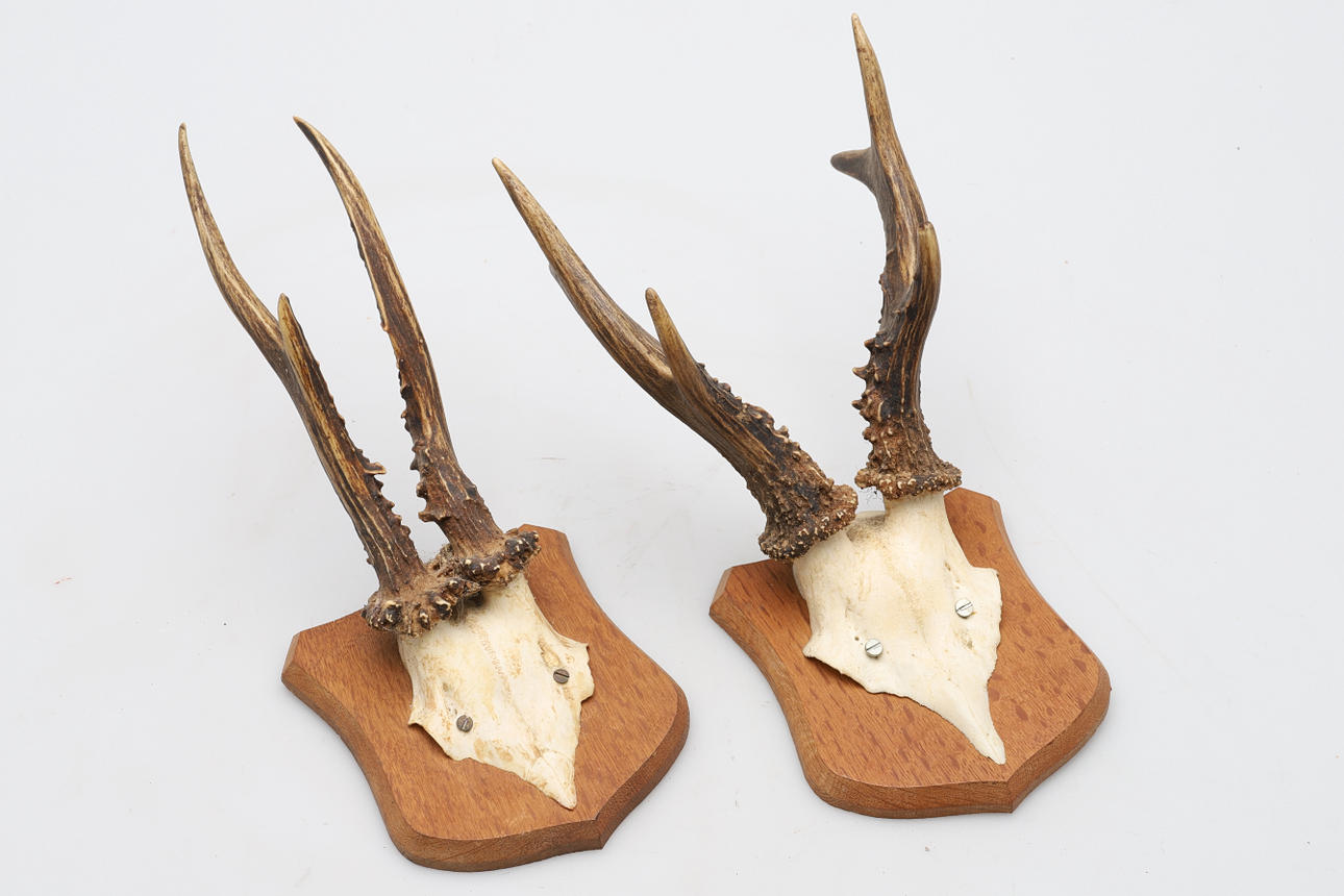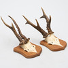 Capreolus capreolus, astas de ciervo en la parte frontal superior cortada, montadas en escudos, 32 cm de altura máxima x 12 cm de ancho máximo.