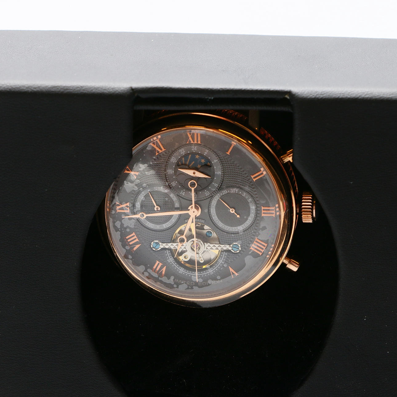 Metal rojo. Pulsera de cuero marrón. Esfera oscura con números romanos. Diámetro: 40 mm. Con caja original.