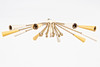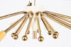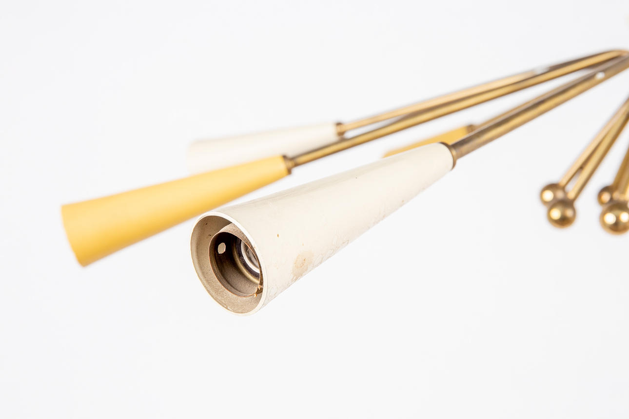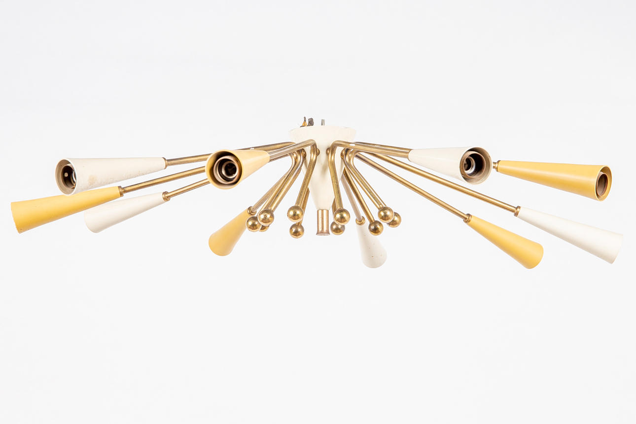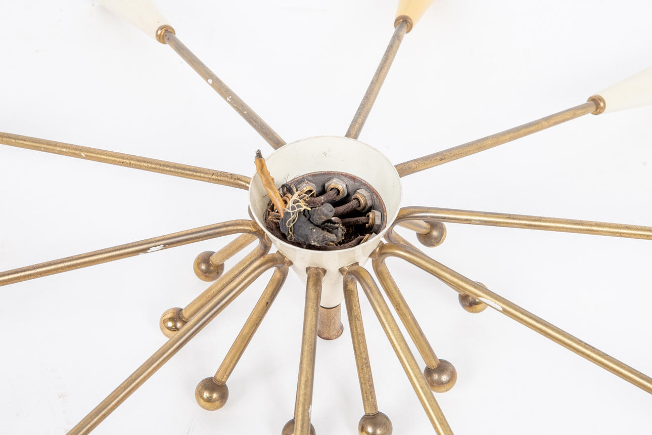 Plafón / lámpara Sputnik, latón, laca, años 50. Lámpara de techo Sputnik en latón con aplicaciones esféricas, con diez brazos provistos de pantallas lacadas en beige y blanco, cada una con un solo punto de luz, equipada con un dosel lacado en blanco, H.13cm, D.76cm.