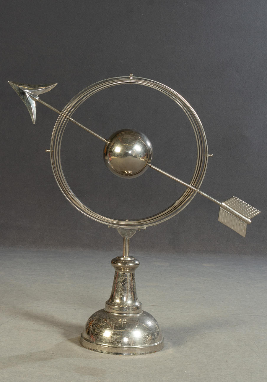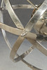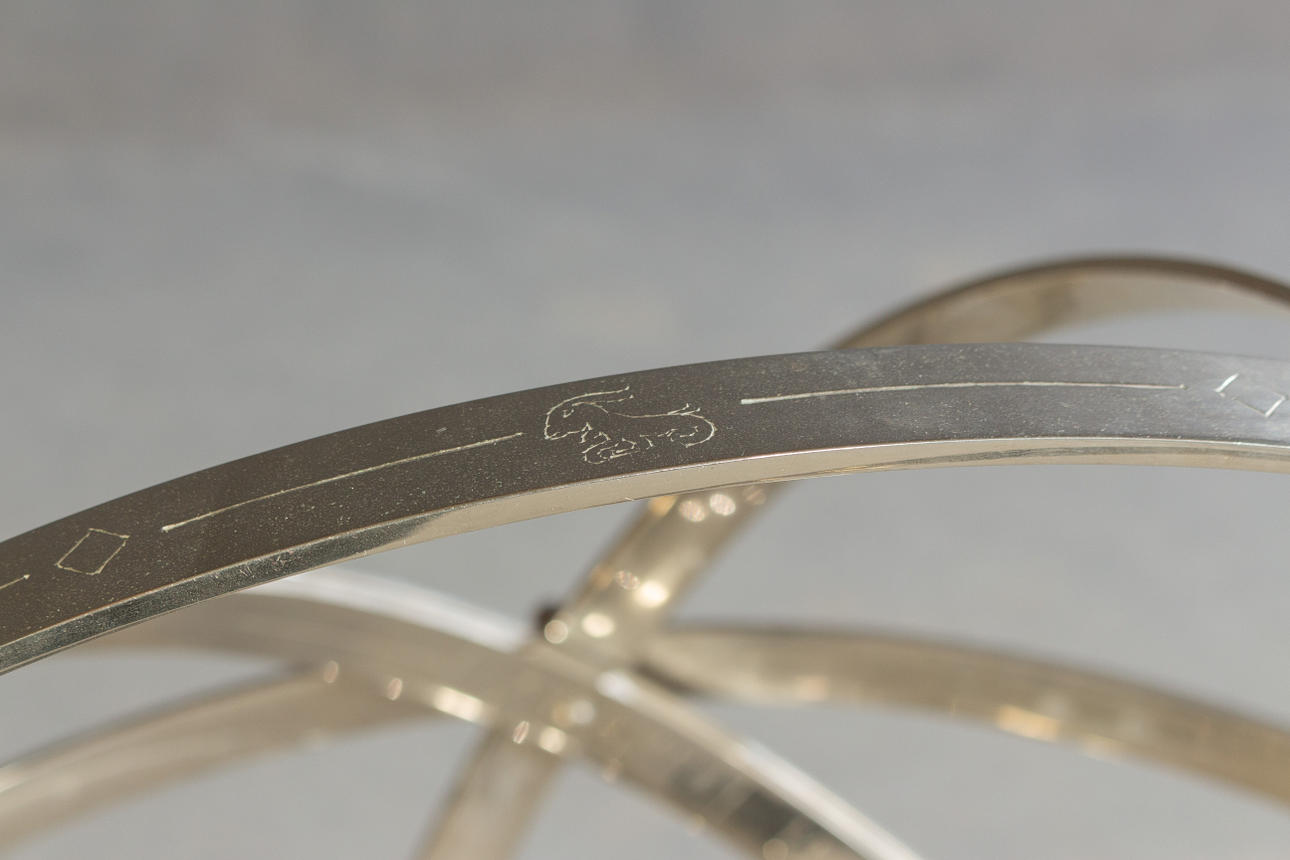 metálico, niquelado. Una estrella fija esférica entre cinco anillos metálicos móviles. Un anillo con escamas romanas en el interior y otro anillo en el exterior con los signos del zodíaco fundidos. Al x Pr: aprox. 106x63 cm.