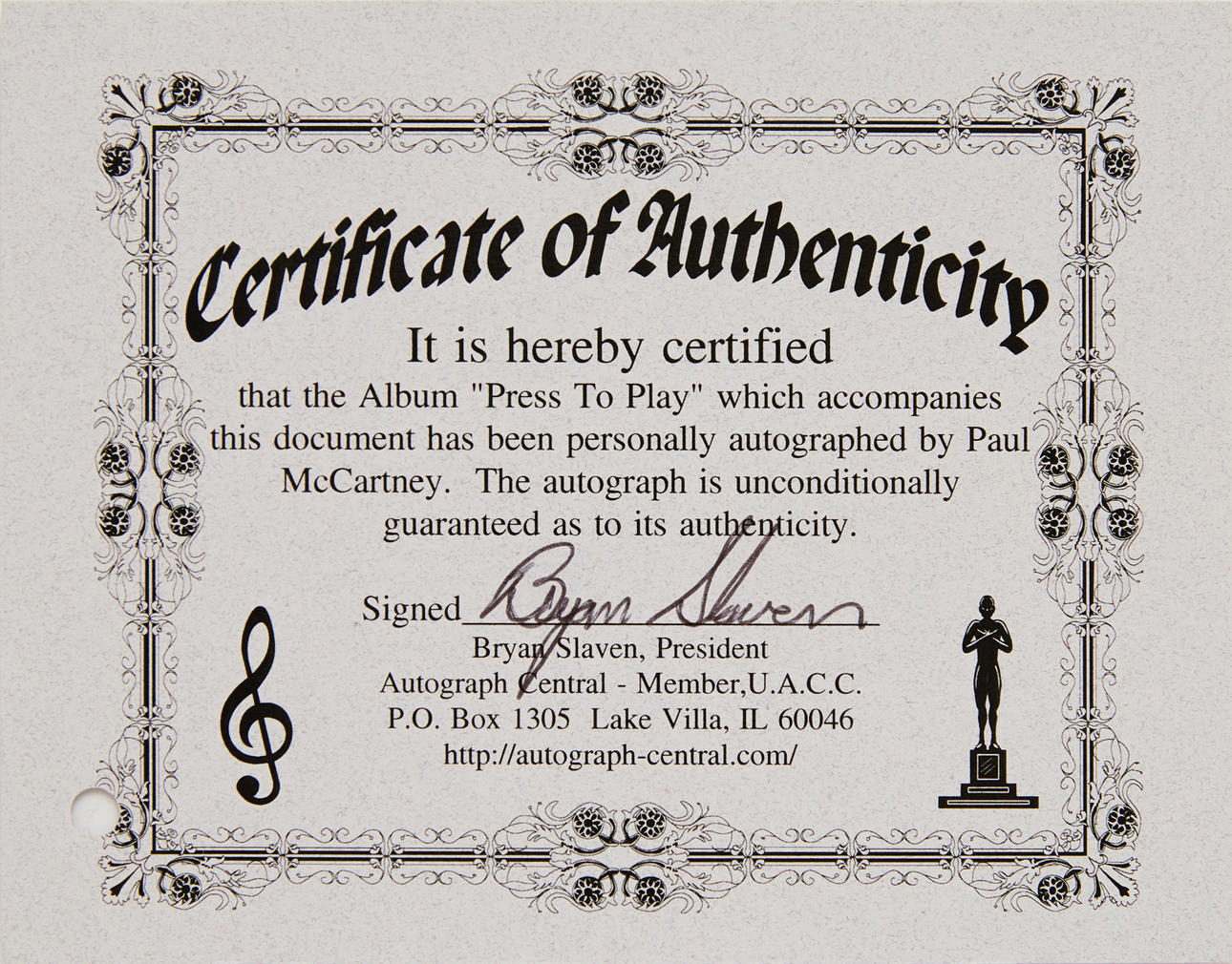 PAUL MC CARTNEY. Álbum firmado "Press to Play" (1986). Firmado con rotulador azul.