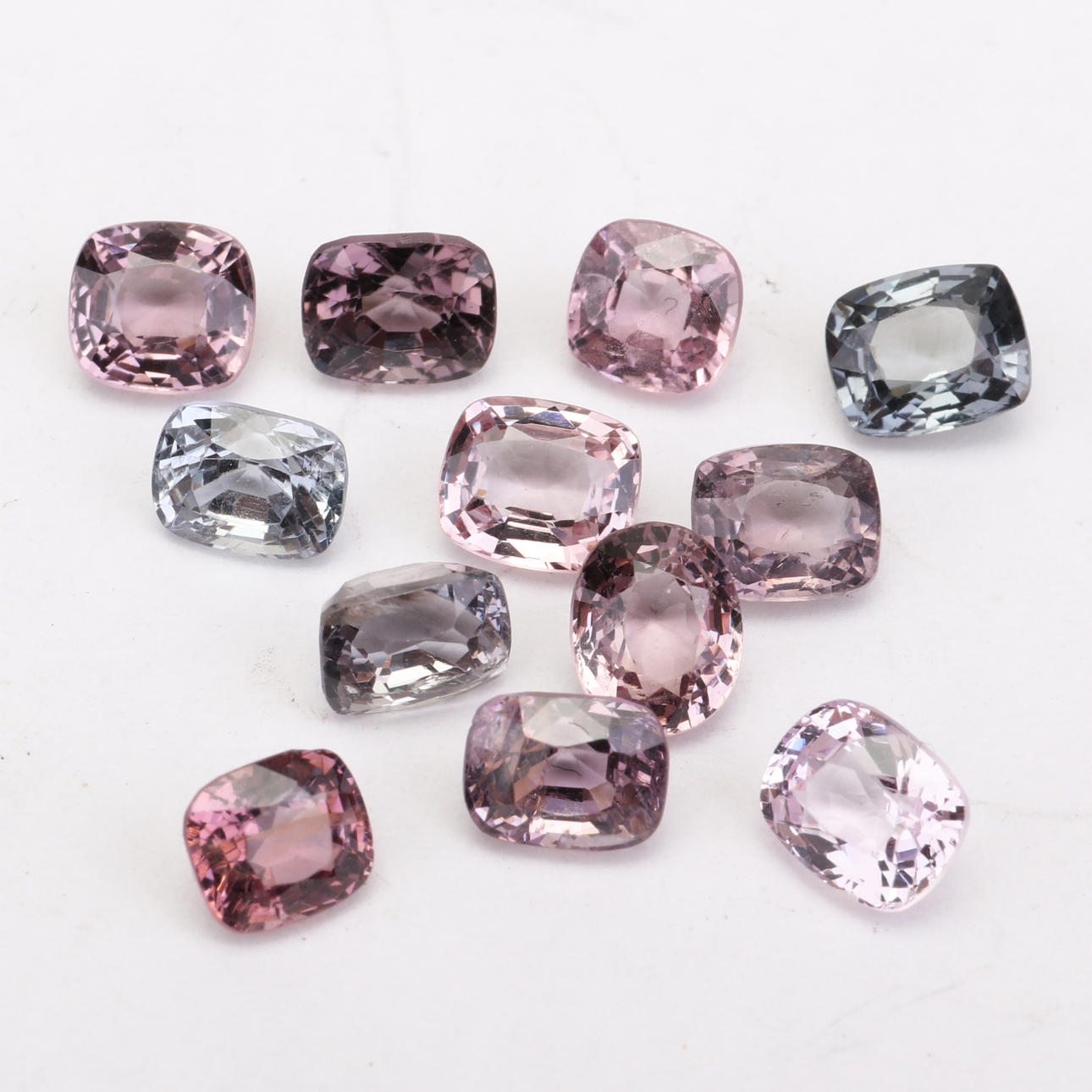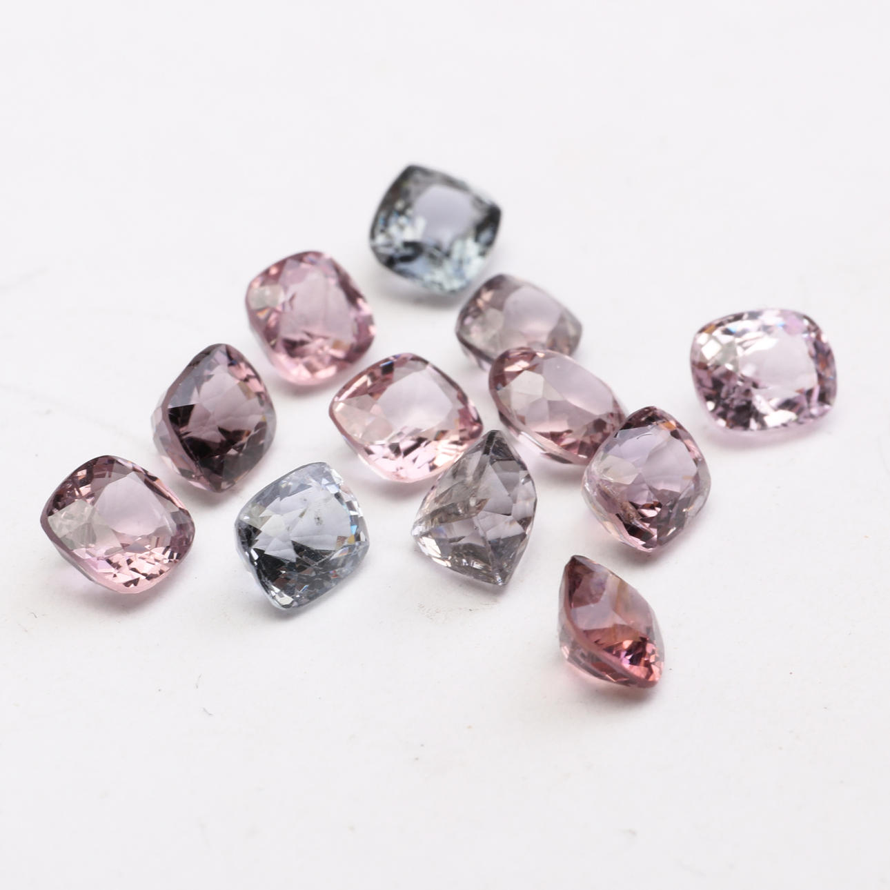 12 espinelas, rosa/morado. Mezcla de formas y cortes, facetados. Peso total aproximado de 8,60 ct. Las piedras miden unos 5 mm.