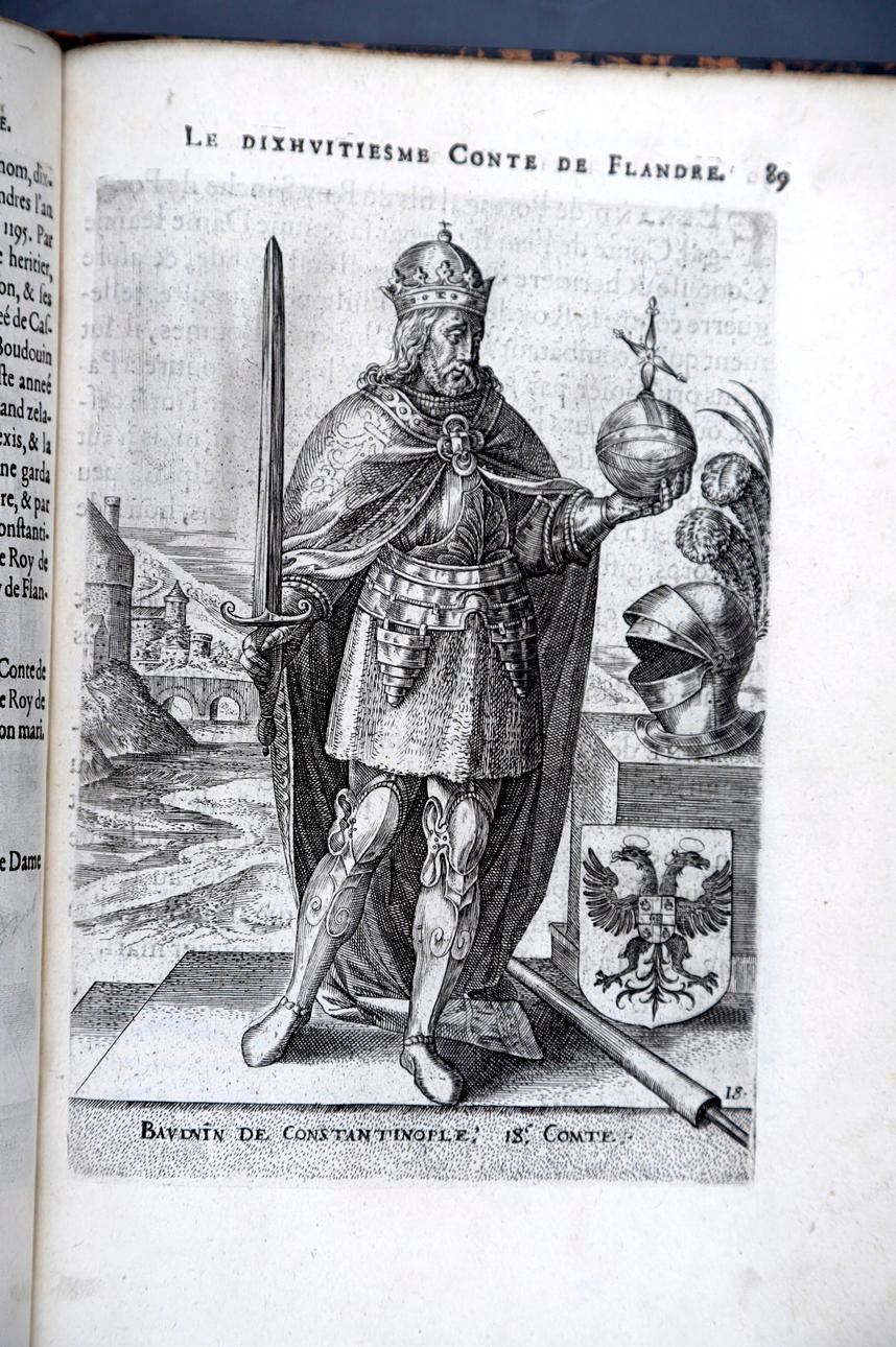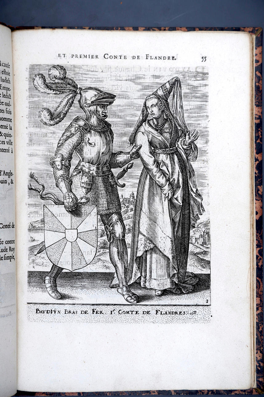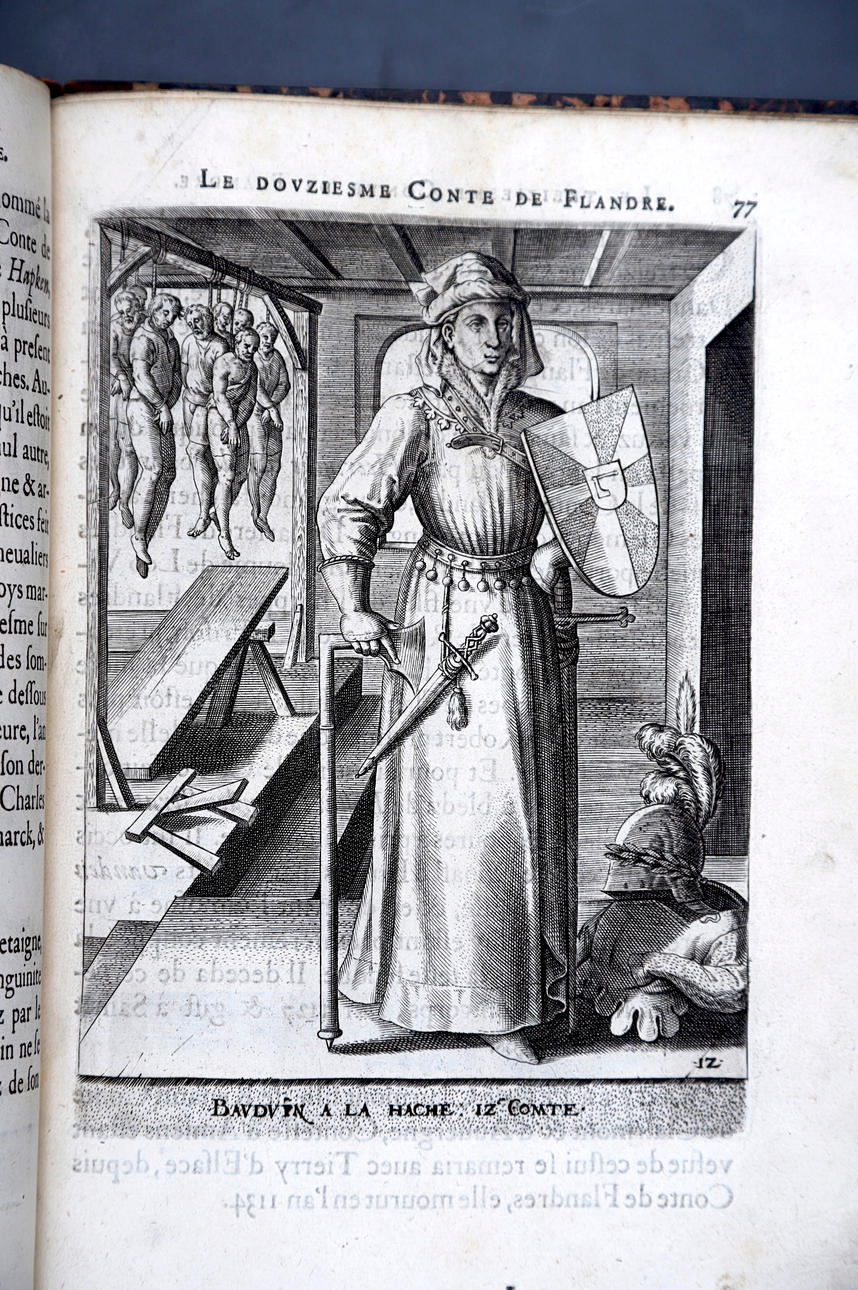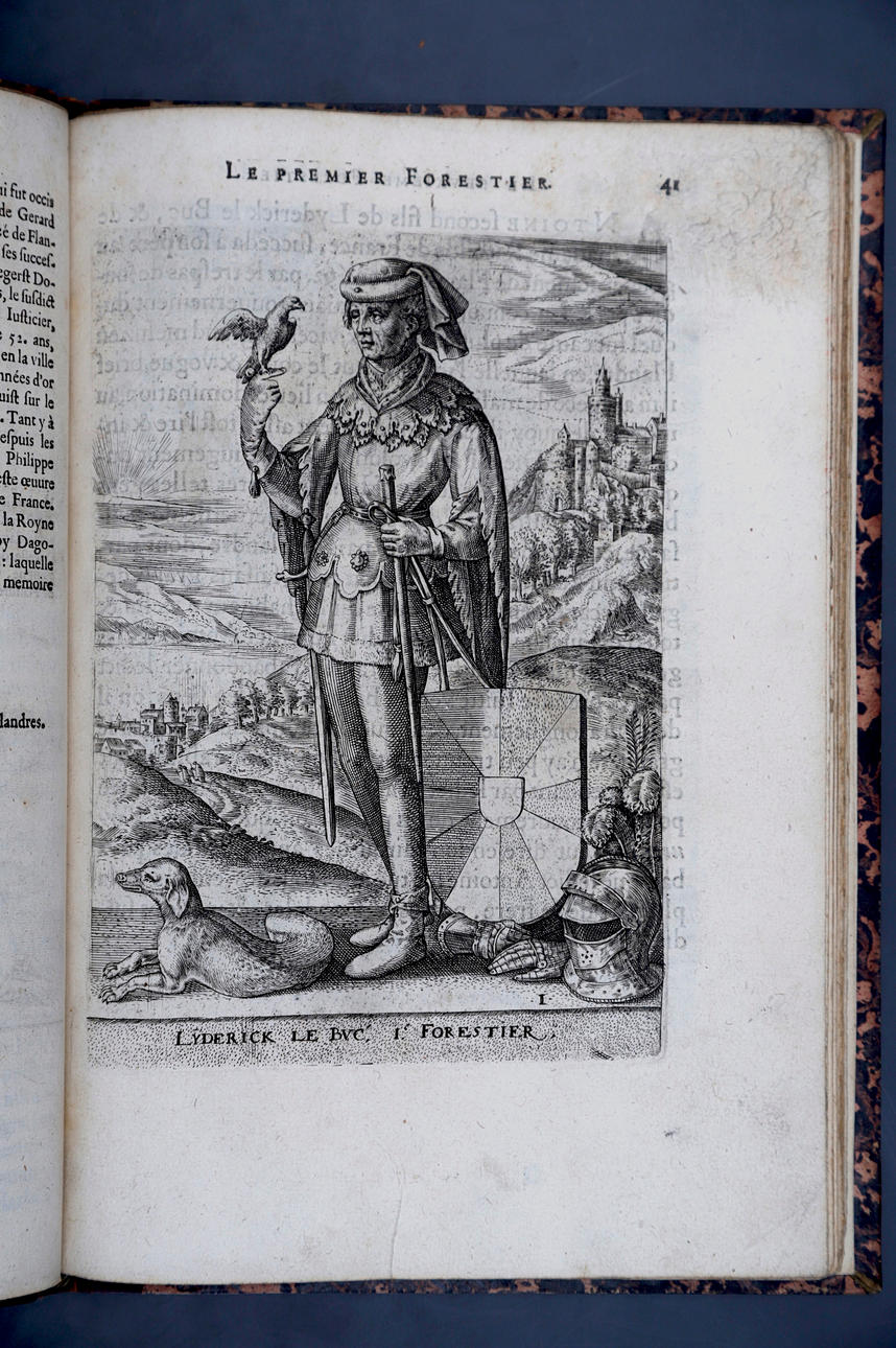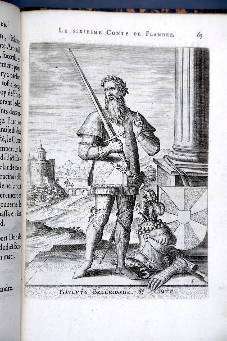 Corneille Martin, "Genealogies des forestiers et contes de Flandres avec brieue histoire de leurs vies / Recueillies de plus veritables et ancienes chroniques par Cornille Martin ; ornées des vrais pourtraicts et habits a la facon de leurs temps, tirés des anciens tableaux par Piere Balthasar", Amberes, Boutique Plantinienne, 1612. (6), 121 y (2) p. Con abundantes láminas de Pierre Balthazar (o Balten). Encuadernación en pasta valenciana.