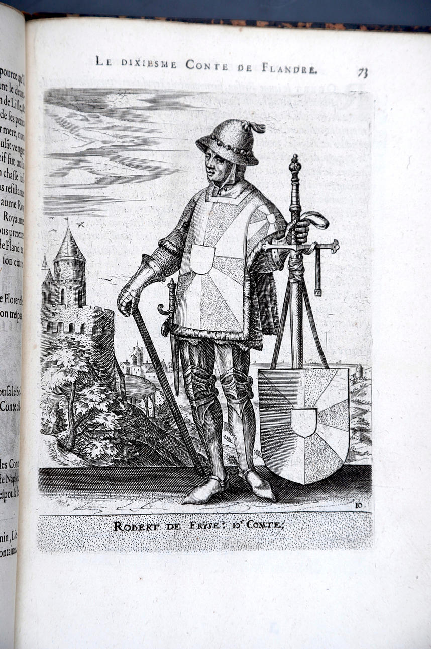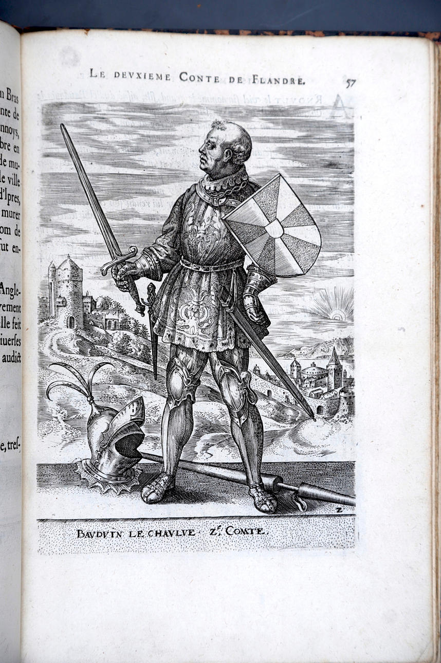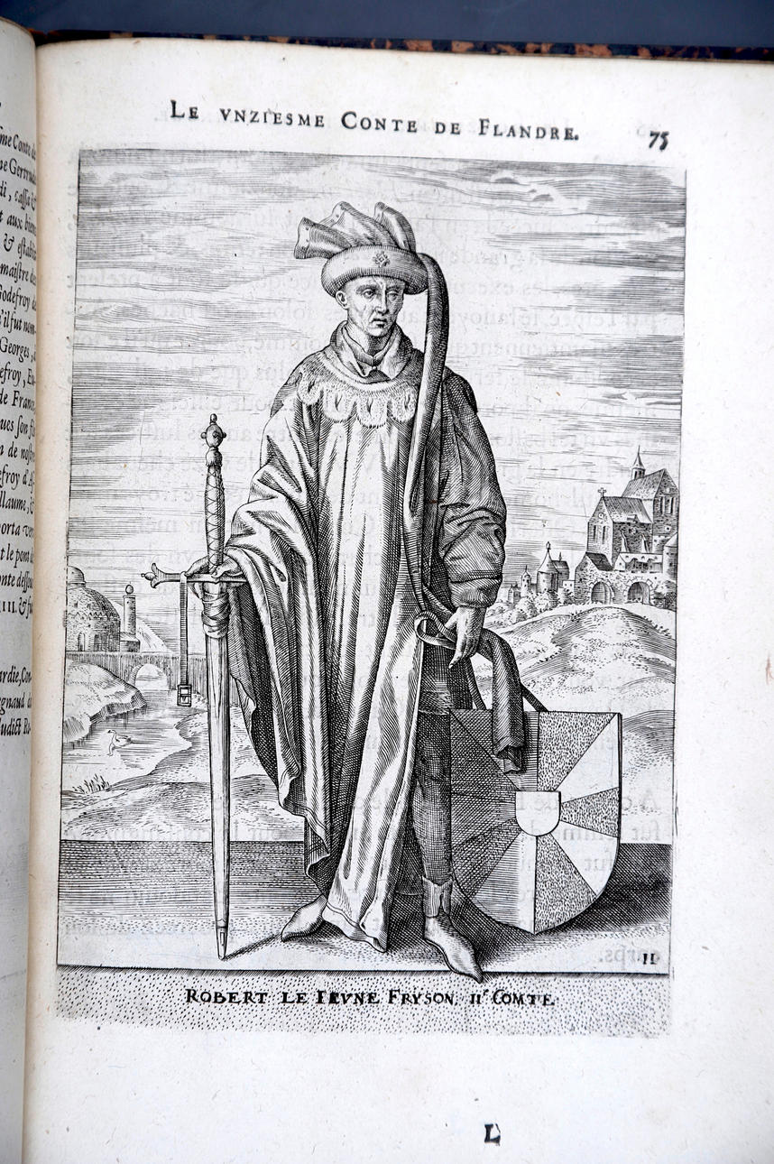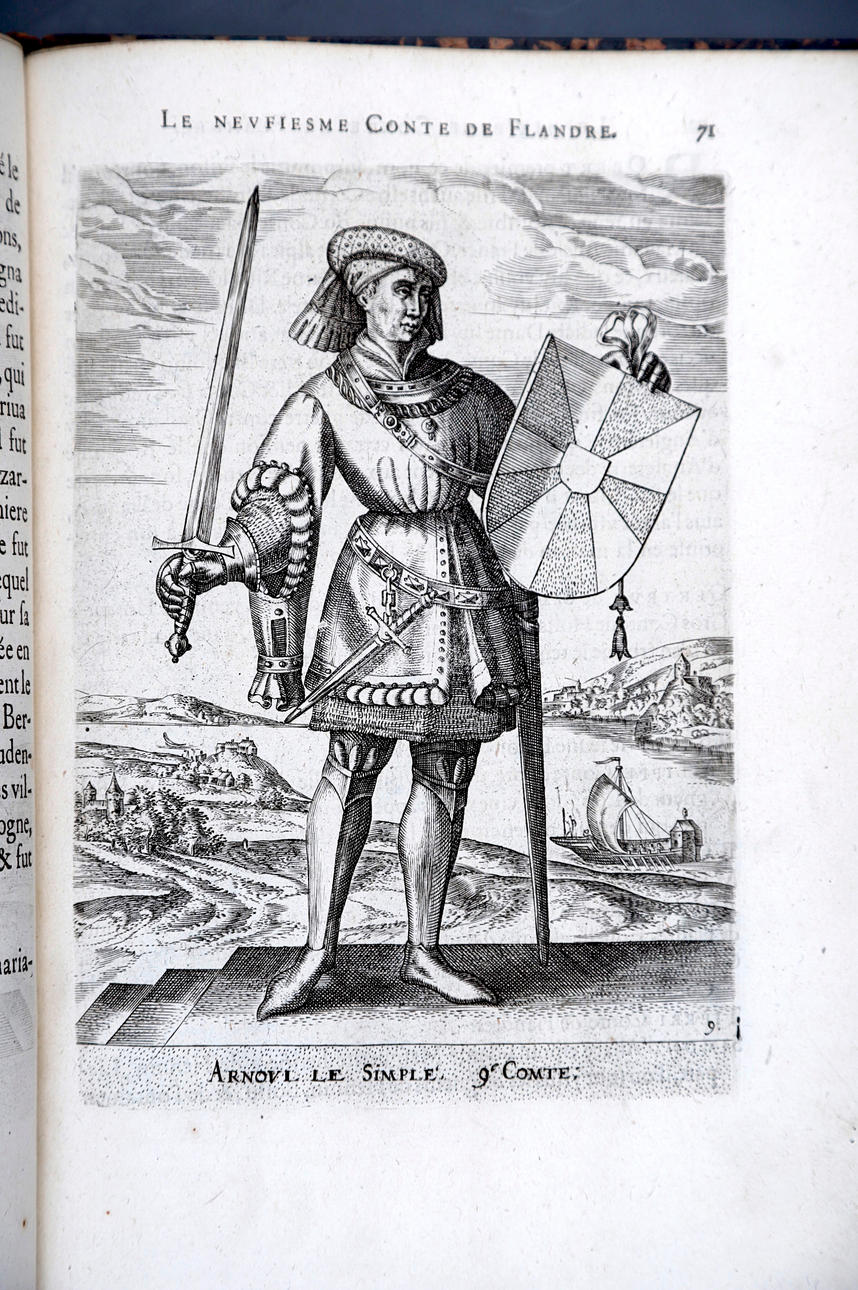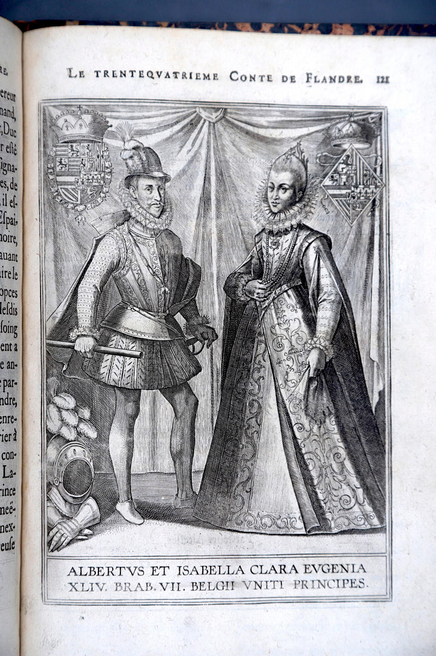 Corneille Martin, "Genealogies des forestiers et contes de Flandres avec brieue histoire de leurs vies / Recueillies de plus veritables et ancienes chroniques par Cornille Martin ; ornées des vrais pourtraicts et habits a la facon de leurs temps, tirés des anciens tableaux par Piere Balthasar", Amberes, Boutique Plantinienne, 1612. (6), 121 y (2) p. Con abundantes láminas de Pierre Balthazar (o Balten). Encuadernación en pasta valenciana.