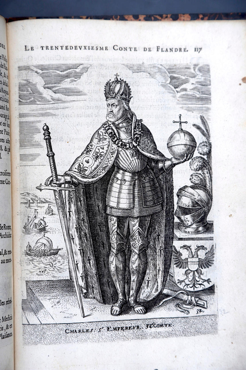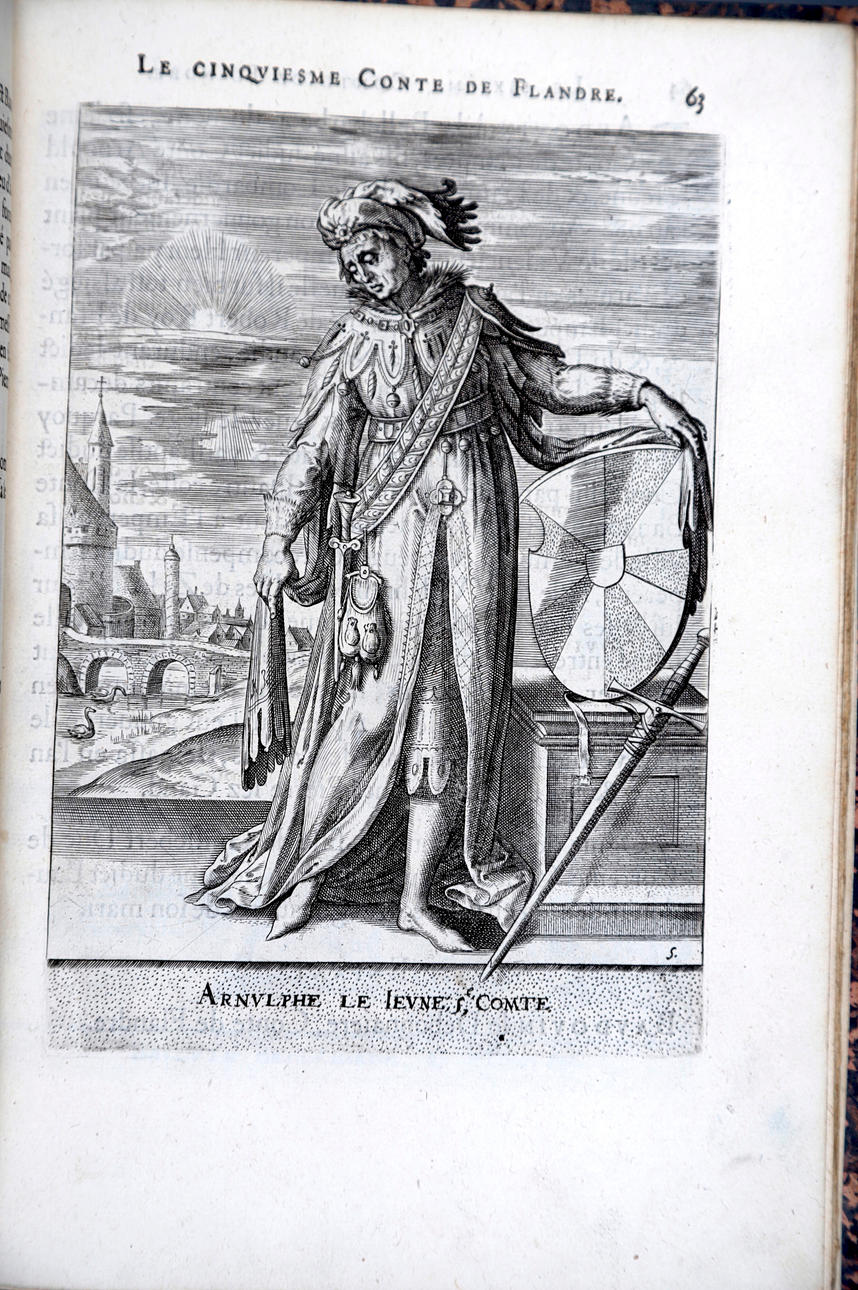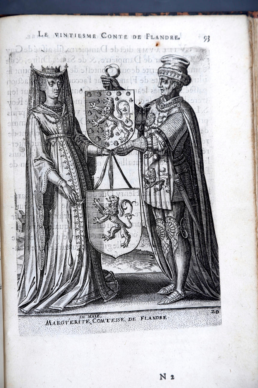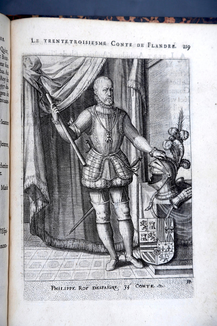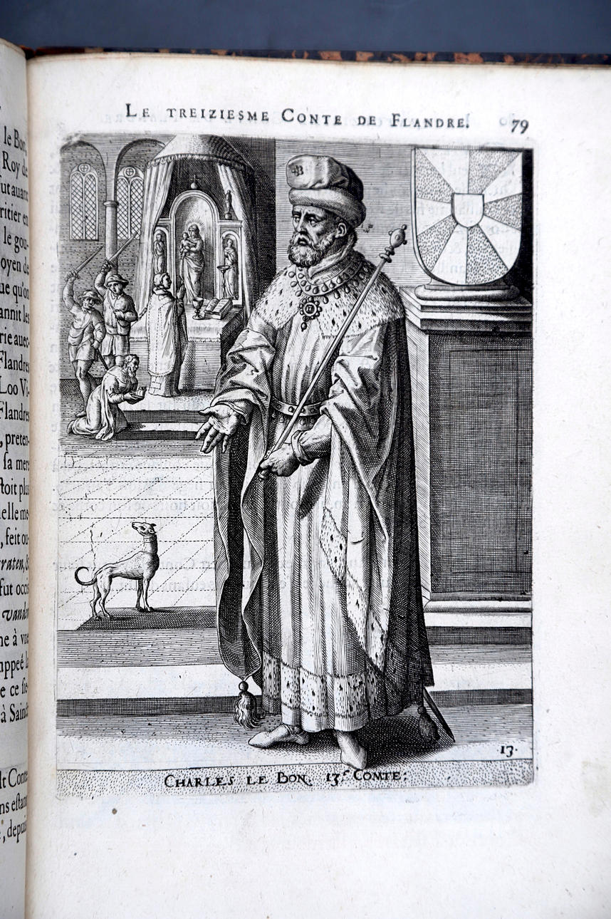 Corneille Martin, "Genealogies des forestiers et contes de Flandres avec brieue histoire de leurs vies / Recueillies de plus veritables et ancienes chroniques par Cornille Martin ; ornées des vrais pourtraicts et habits a la facon de leurs temps, tirés des anciens tableaux par Piere Balthasar", Amberes, Boutique Plantinienne, 1612. (6), 121 y (2) p. Con abundantes láminas de Pierre Balthazar (o Balten). Encuadernación en pasta valenciana.