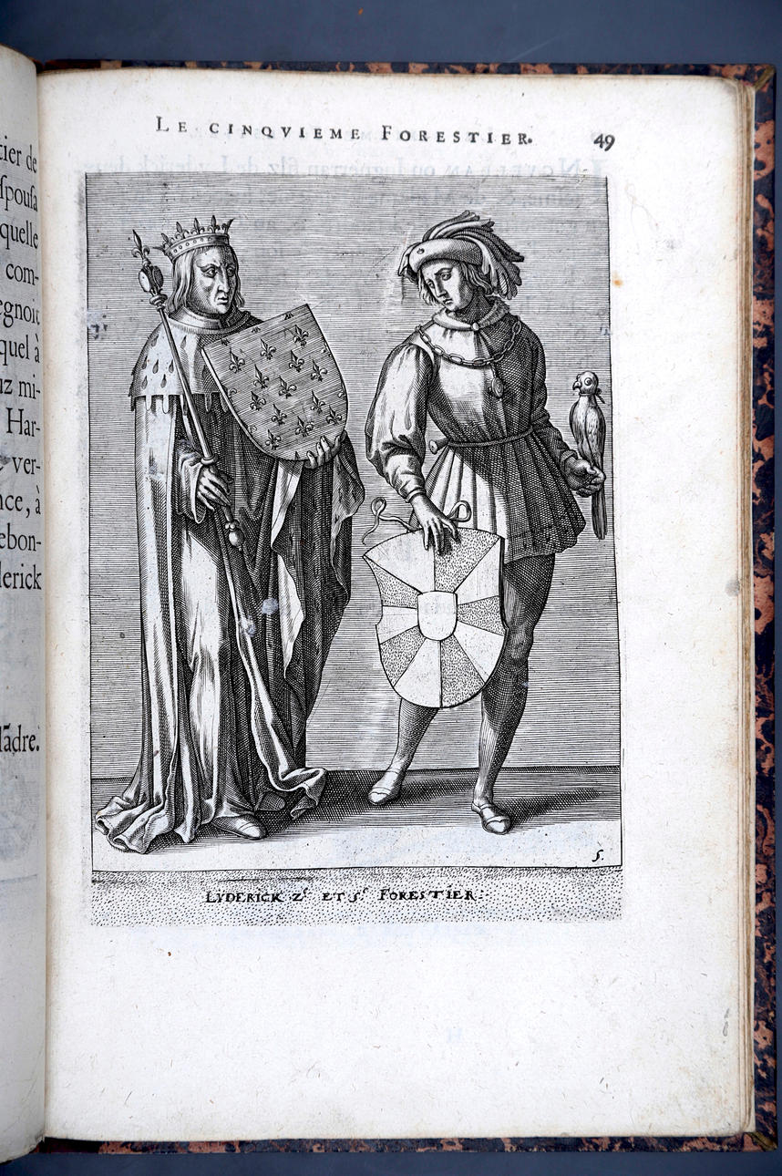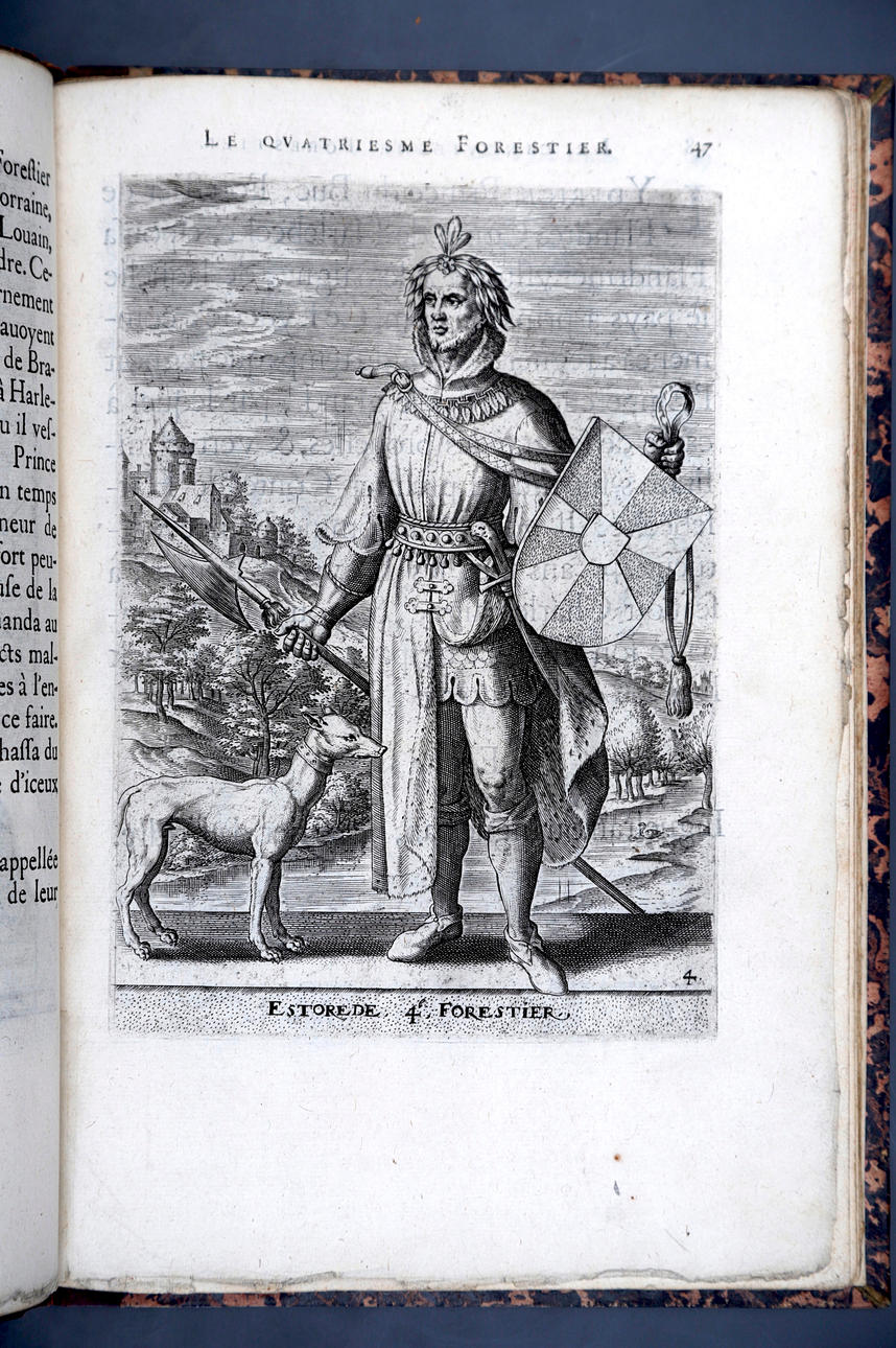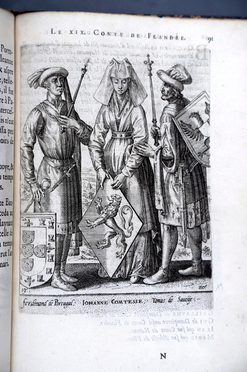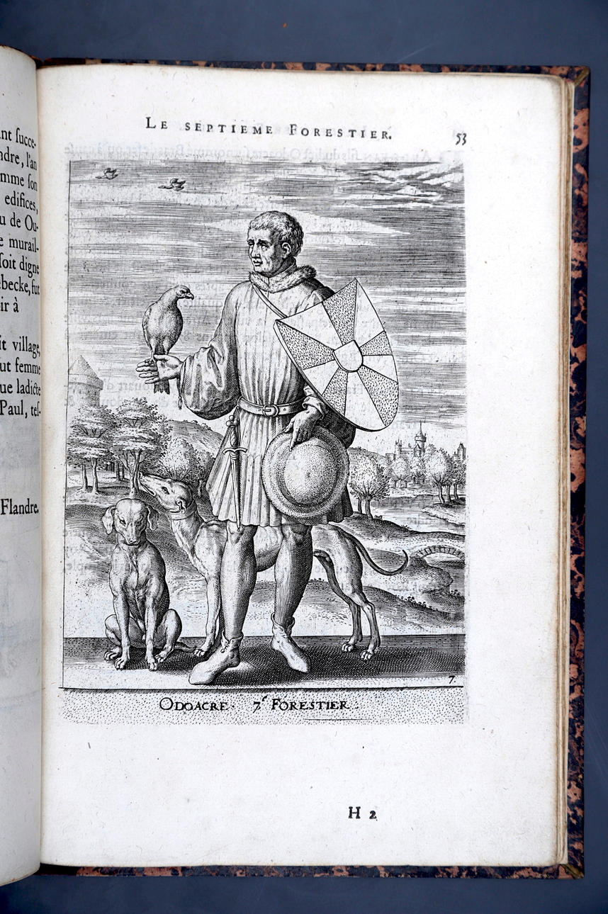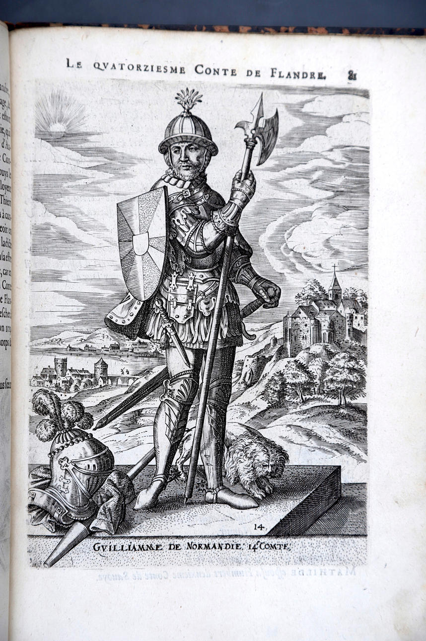 Corneille Martin, "Genealogies des forestiers et contes de Flandres avec brieue histoire de leurs vies / Recueillies de plus veritables et ancienes chroniques par Cornille Martin ; ornées des vrais pourtraicts et habits a la facon de leurs temps, tirés des anciens tableaux par Piere Balthasar", Amberes, Boutique Plantinienne, 1612. (6), 121 y (2) p. Con abundantes láminas de Pierre Balthazar (o Balten). Encuadernación en pasta valenciana.